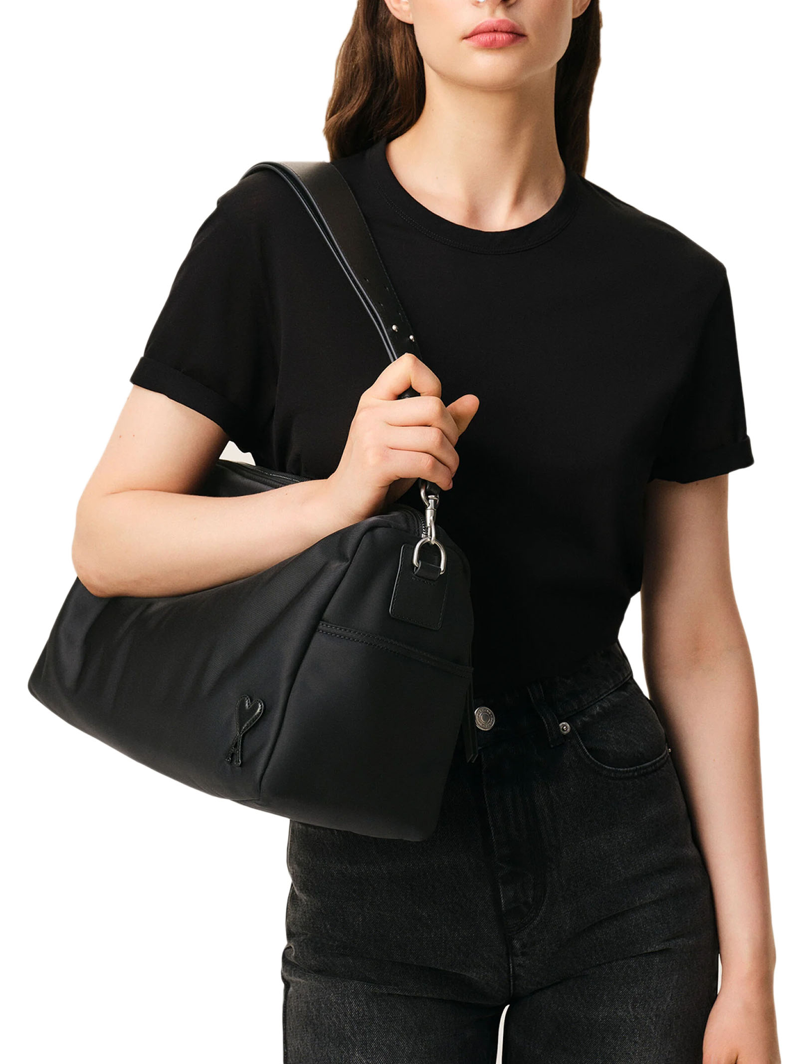 Borsa Marcel in tela di nylon nero con tracolla regolabile, tasca con zip, tasca esterna con zip, applicazione con logo a cuore, L40 x A23 x P16 cm