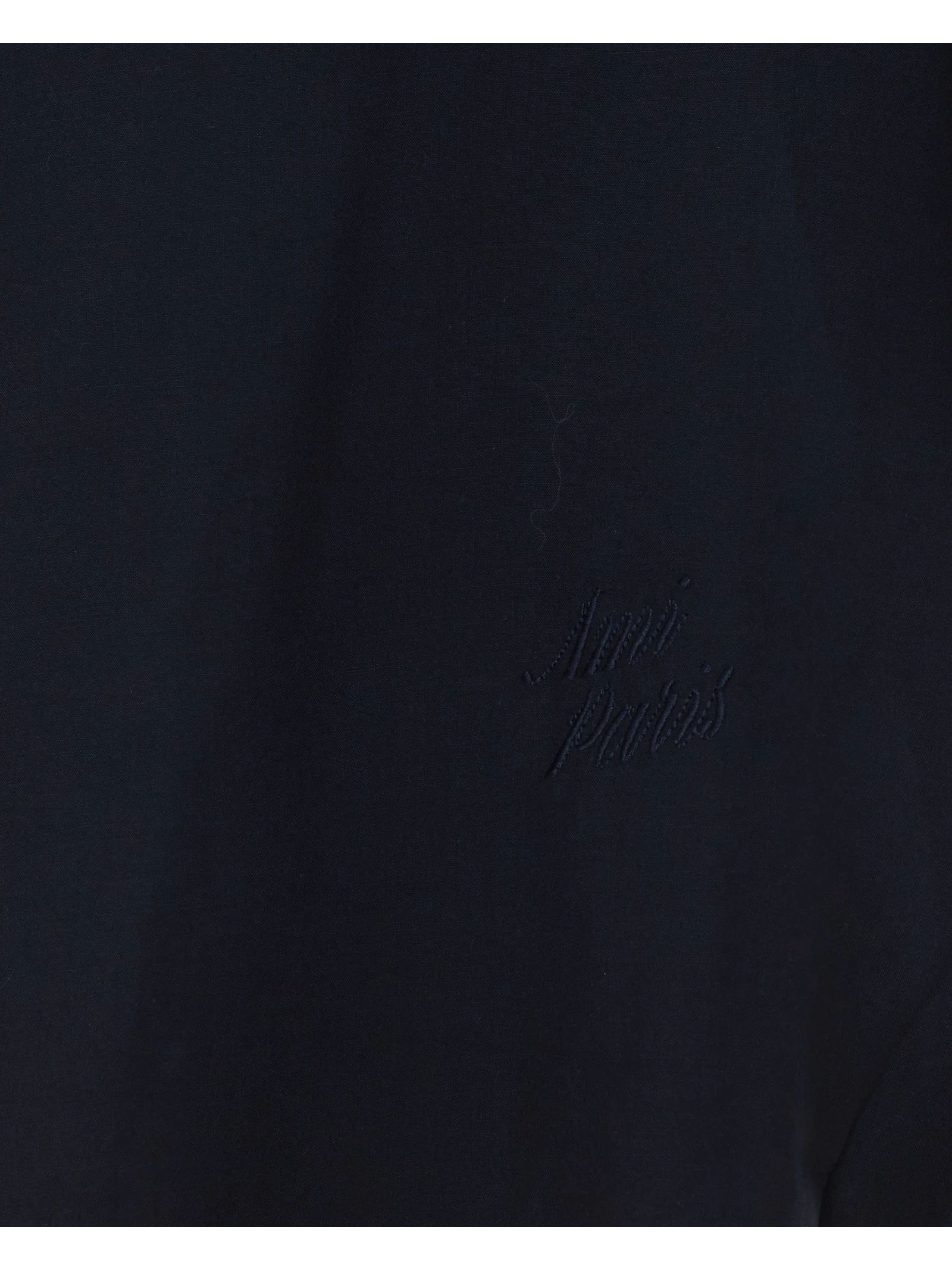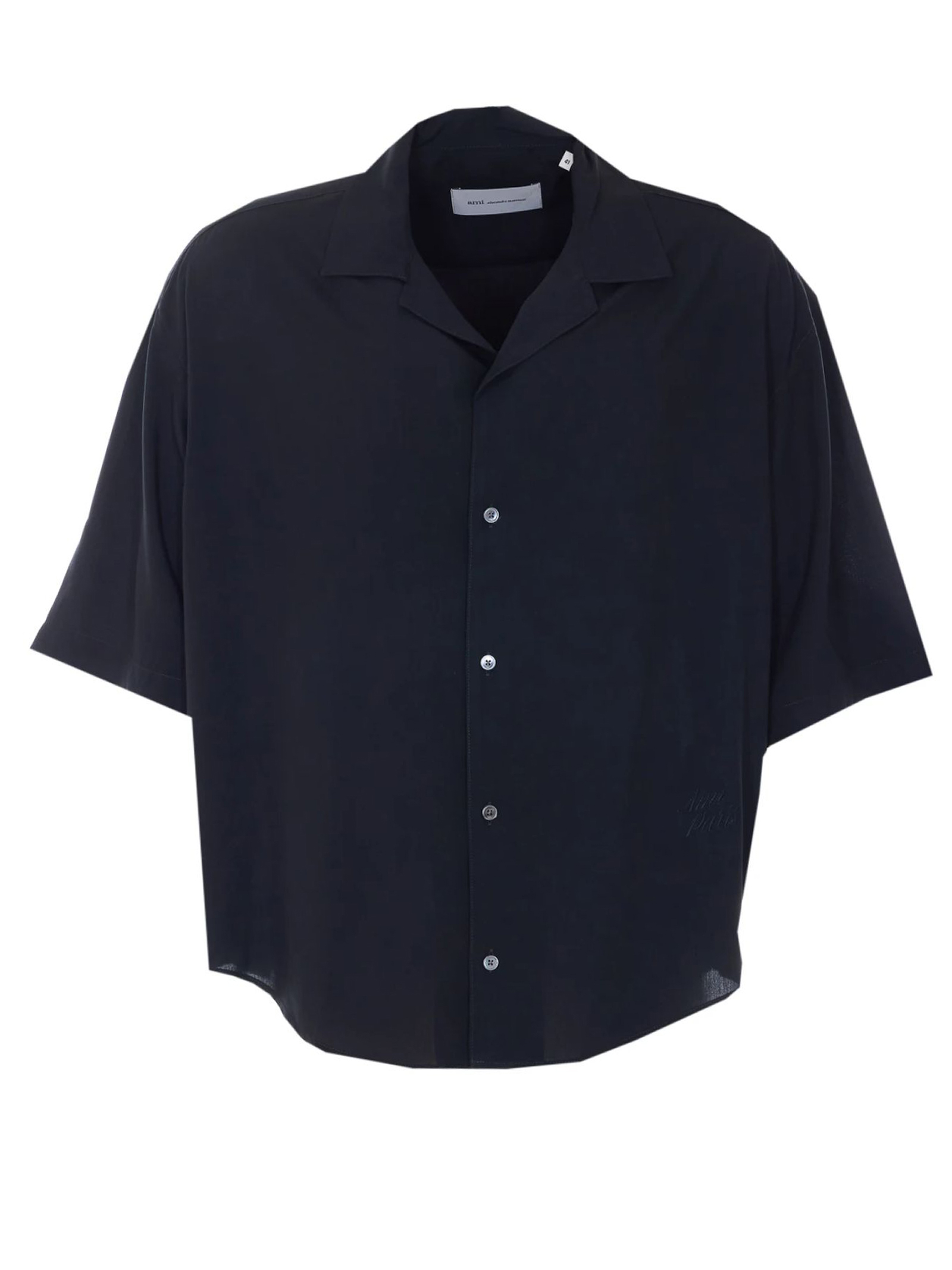Camicia Ami Paris a maniche corte nera con ricami, vestibilità ampia, motivo Ami Heritage tono su tono, ricamo in basso a sinistra in vita, colletto classico, abbottonatura frontale, bottoni in madreperla