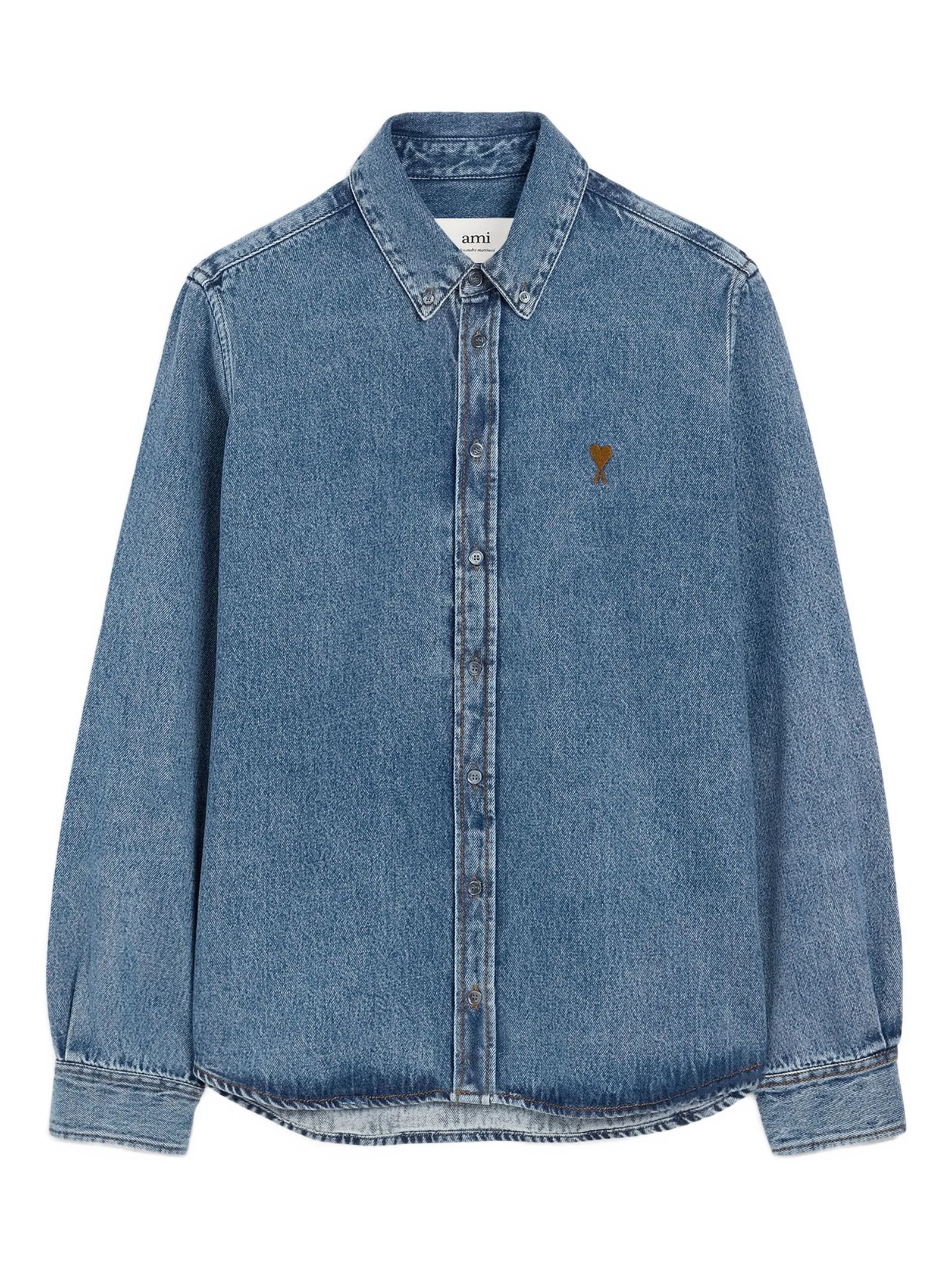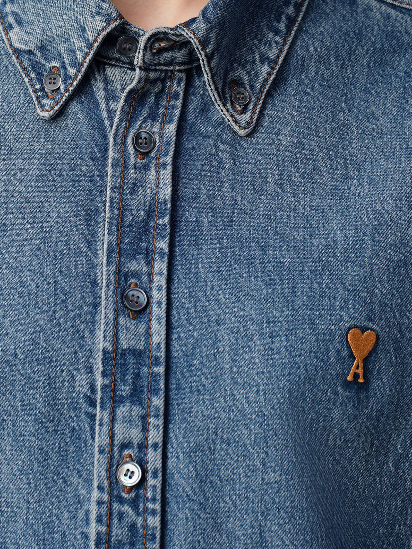 Camicia button-down in denim leggero indaco effetto used, Prodotto unisex, Taglio classico, Ricamo Ami de Coeur color tabacco sul petto, Colletto con bottoni, Abbottonatura sul davanti e sui polsi, Bottoni in madreperla, Impunture color tabacco
