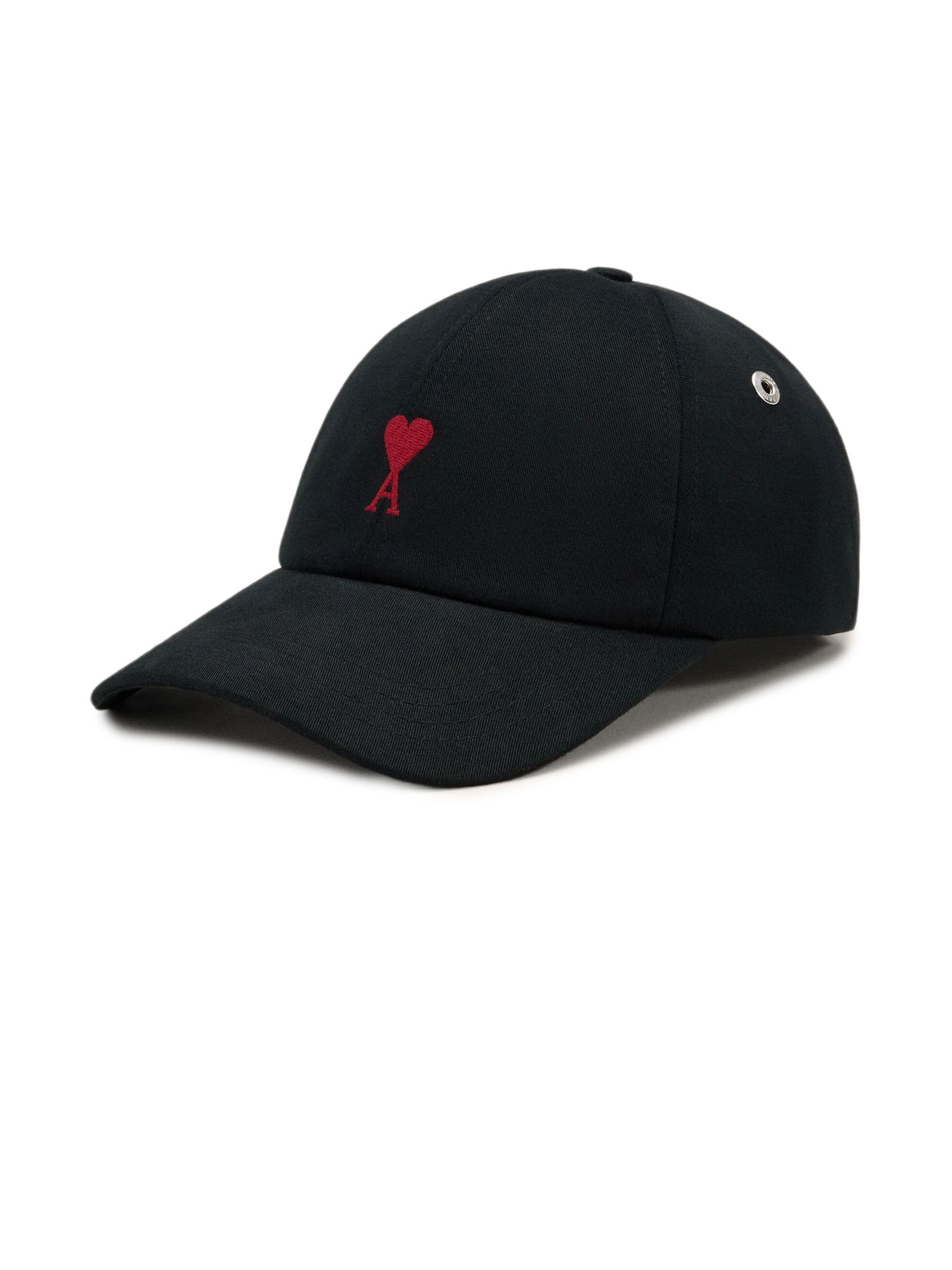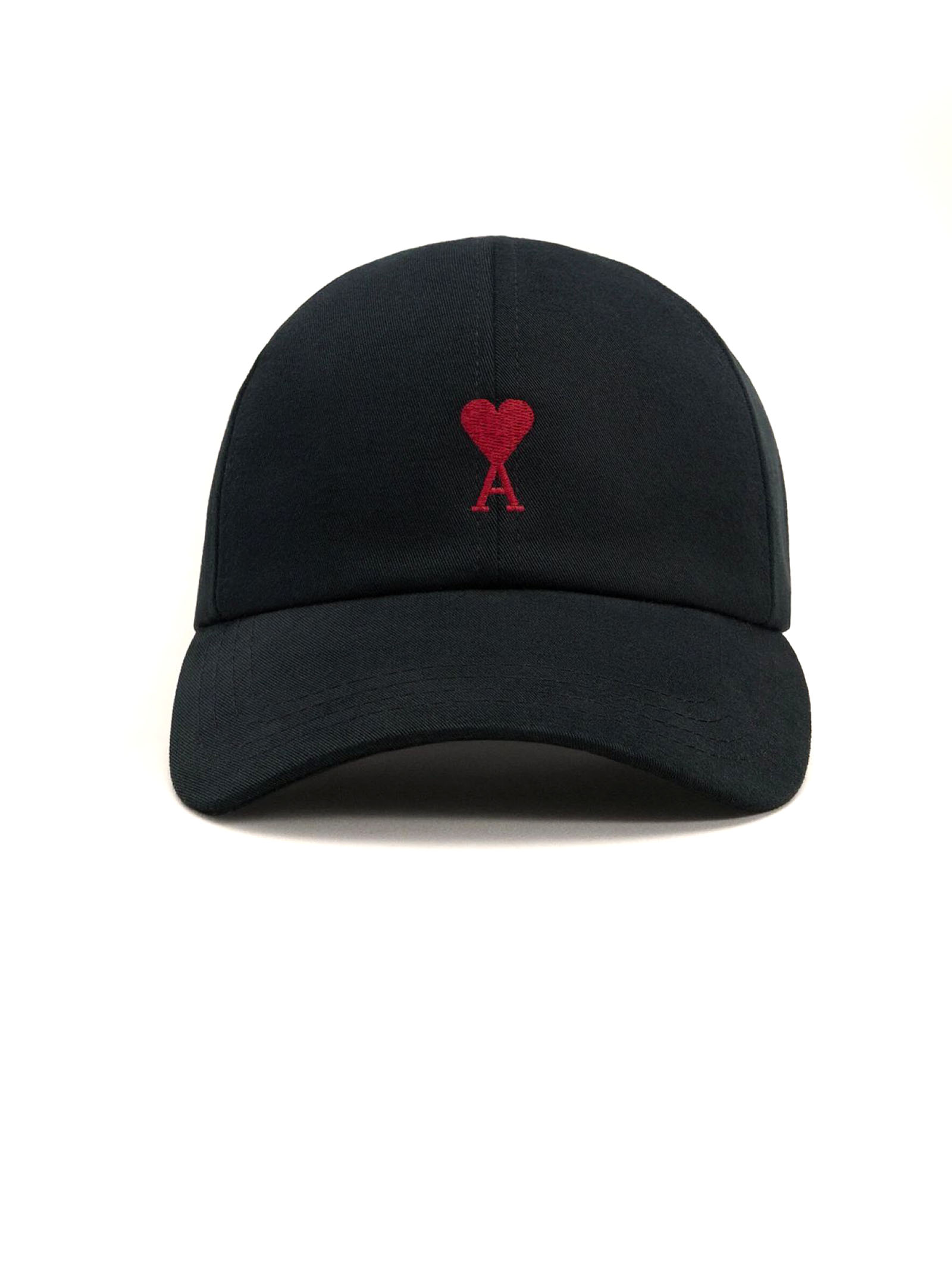 Cappello da baseball in gabardine di cotone nero, Fibbia di regolazione con firma ami, Cinturino regolabile, Fodera in cotone, Ricamo Ami de Cur in rosso a punto catenella