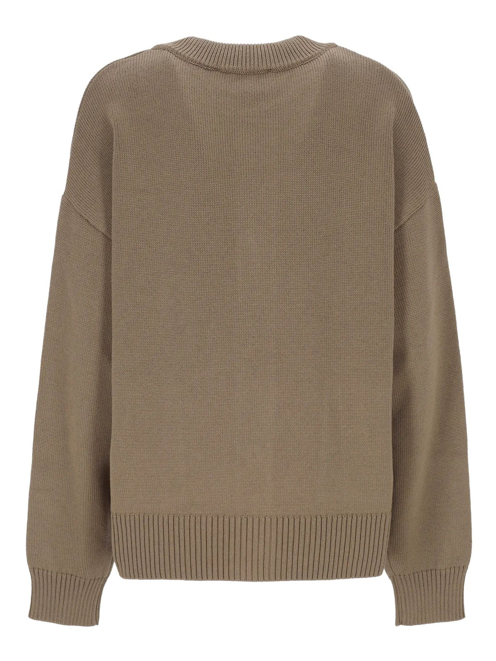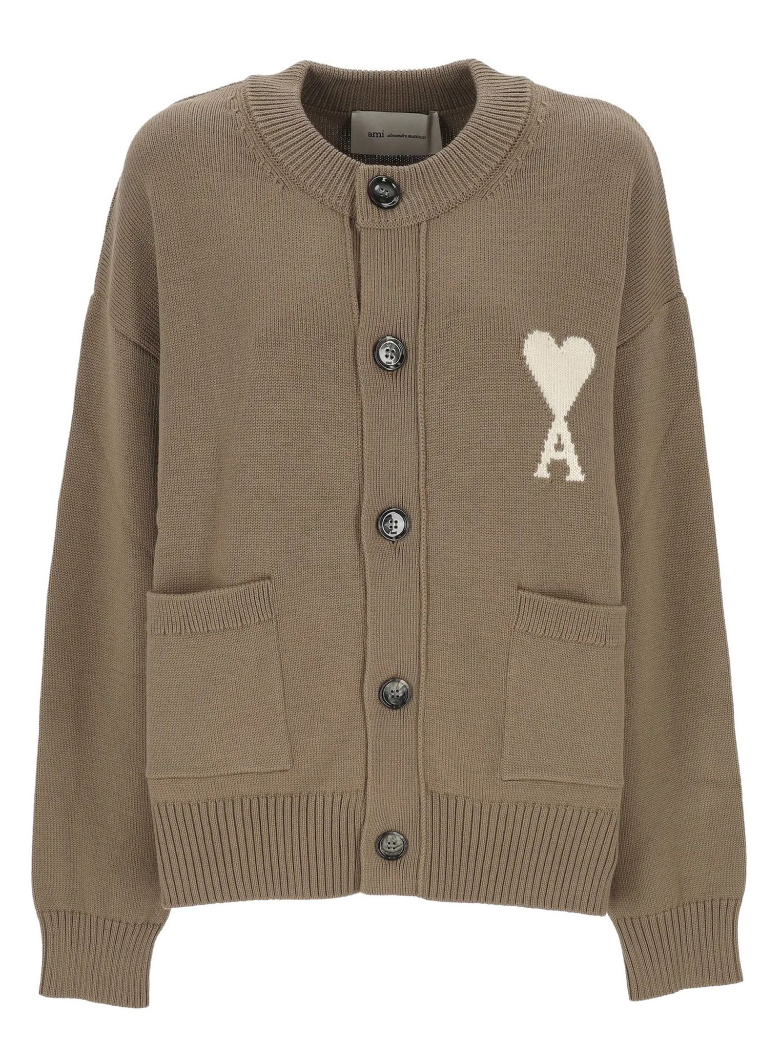 Cardigan in lana e cotone beige tortora, chiusura con bottoni, motivo a cuore, collo rotondo, due tasche applicate sul davanti, orlo a costine