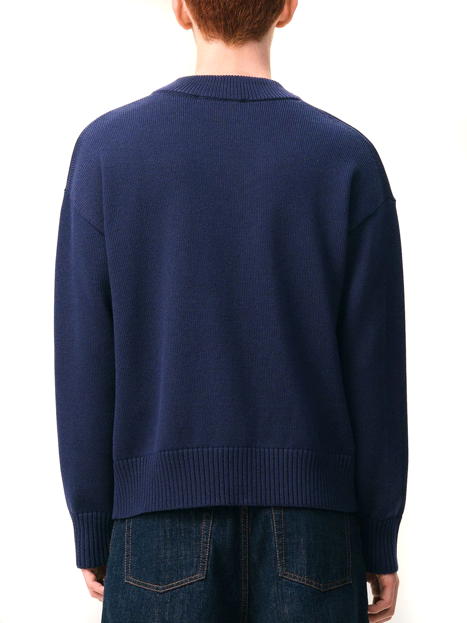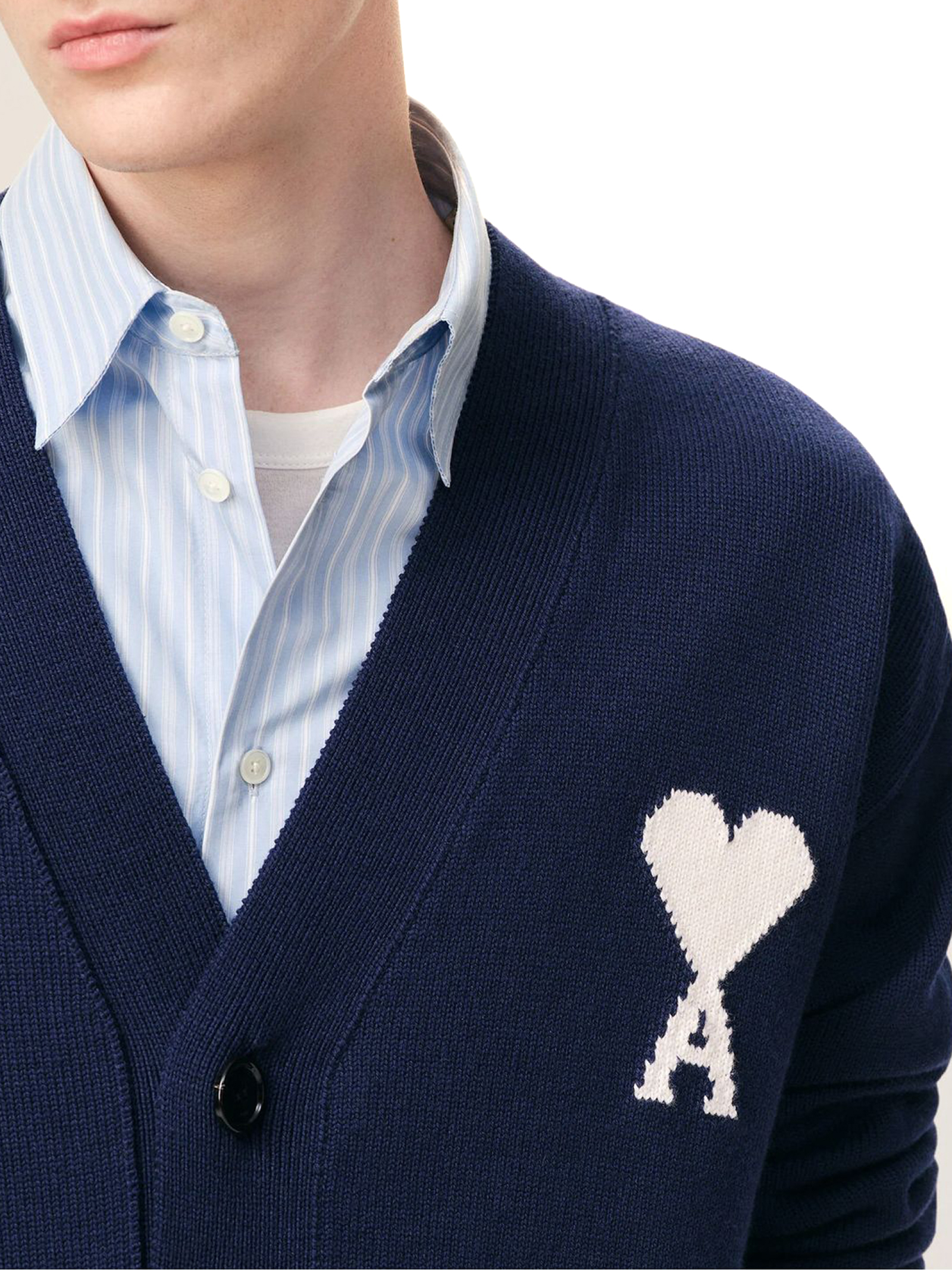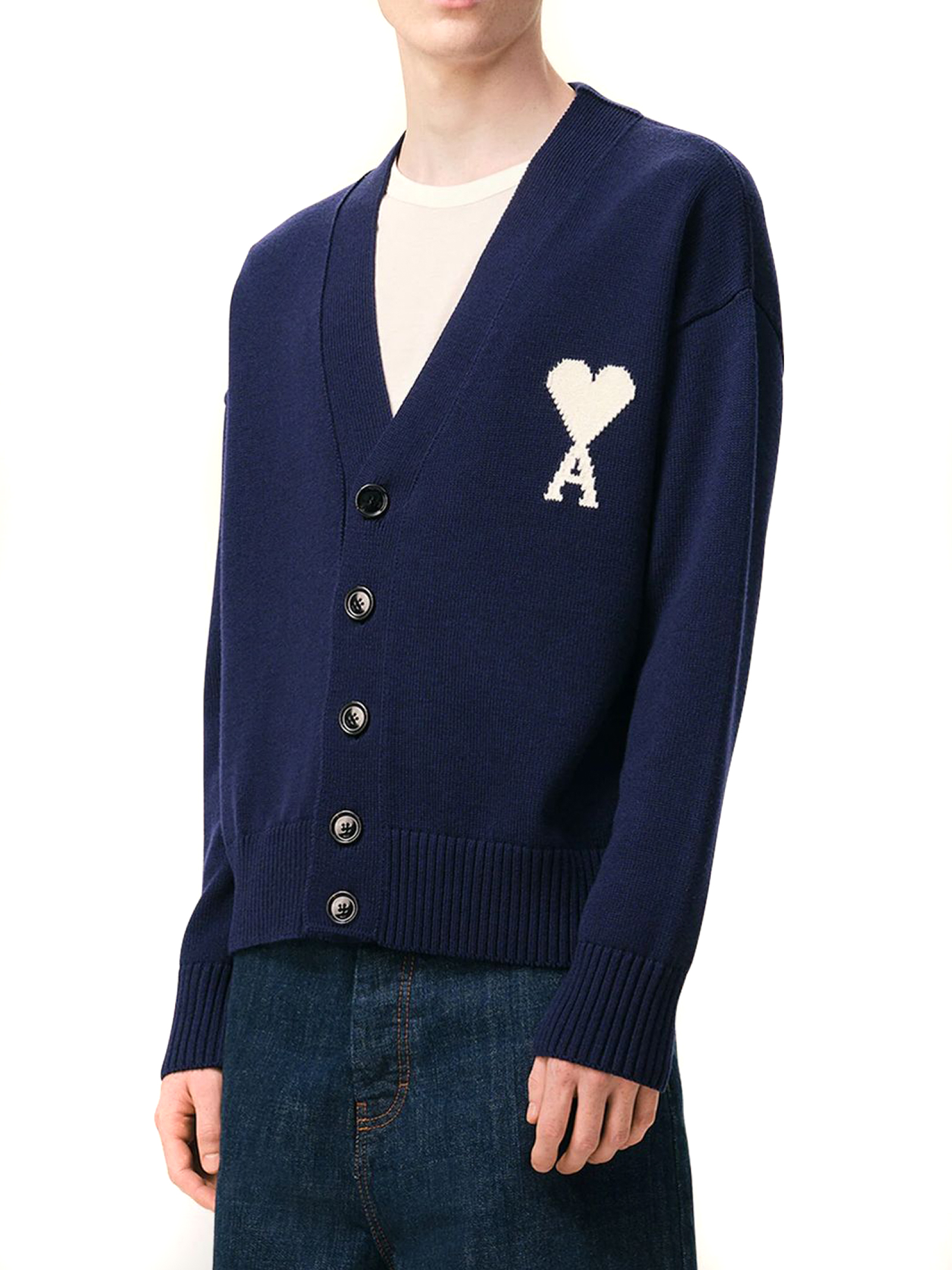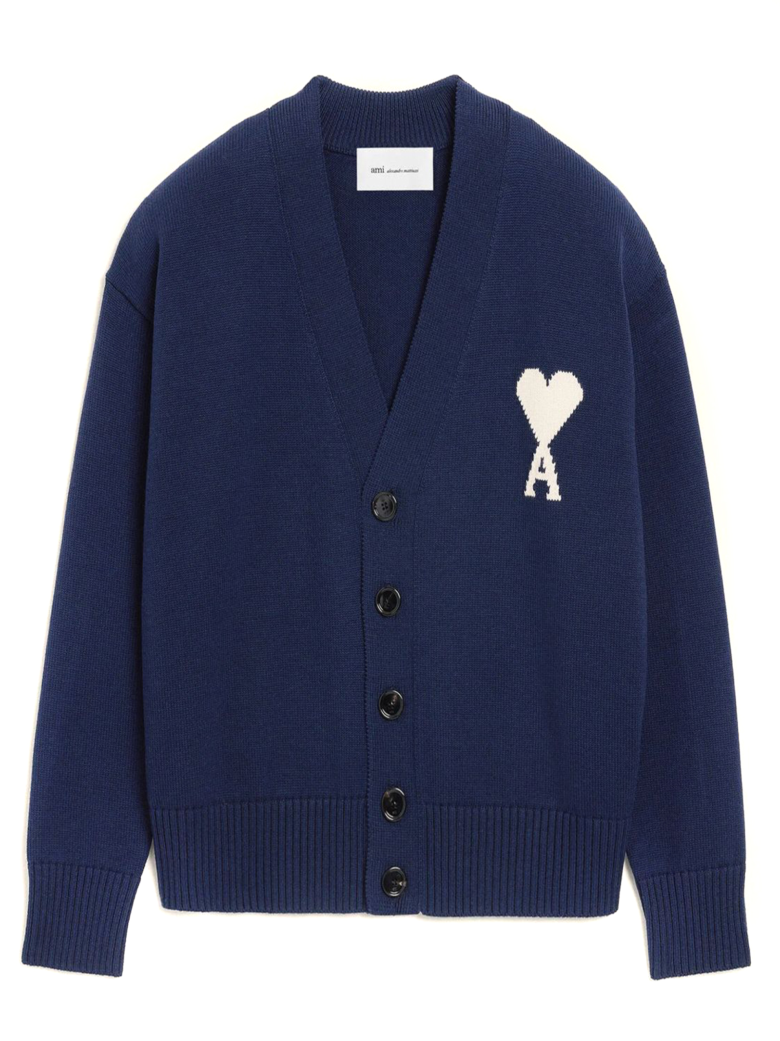 Cardigan in maglia di cotone e lana blu, prodotto unisex, bottoni Ami in corno nero, intarsio Ami de Coeur lavorato a maglia sul petto, prodotto in lana responsabile, maglia jersey
