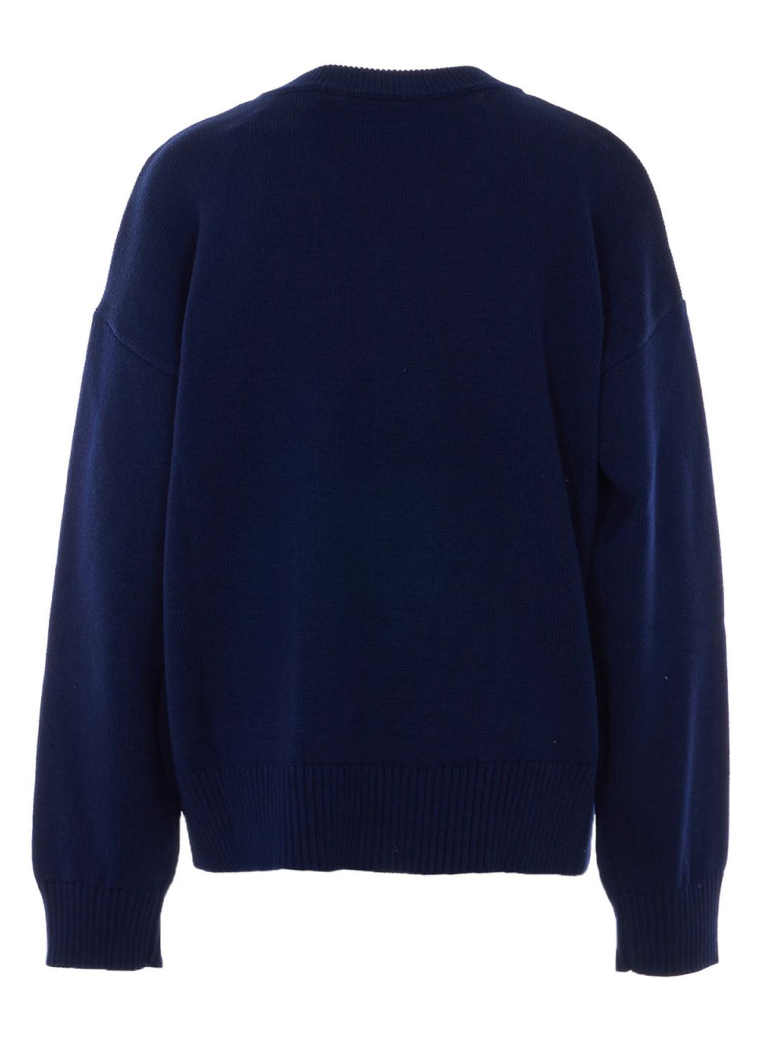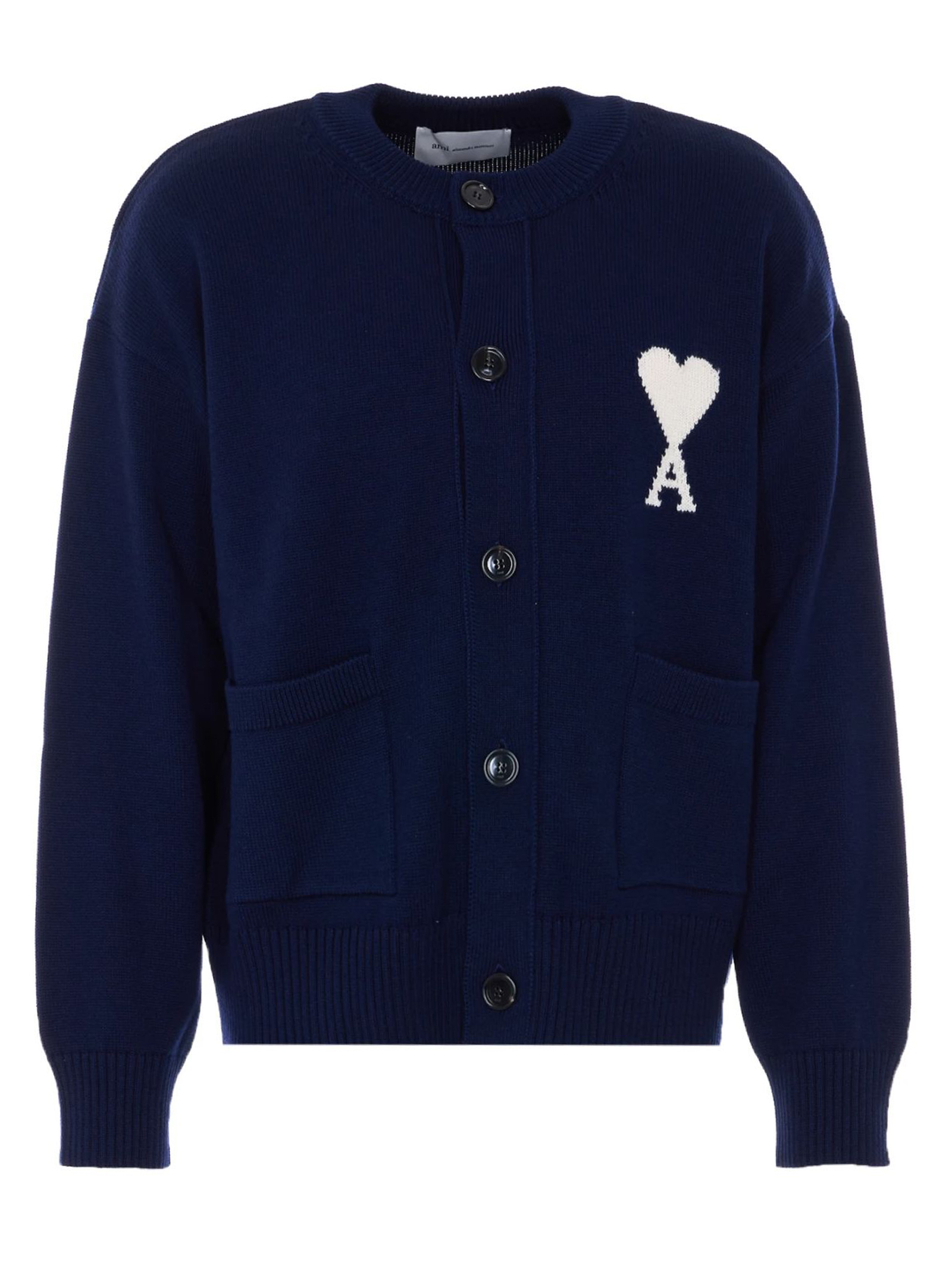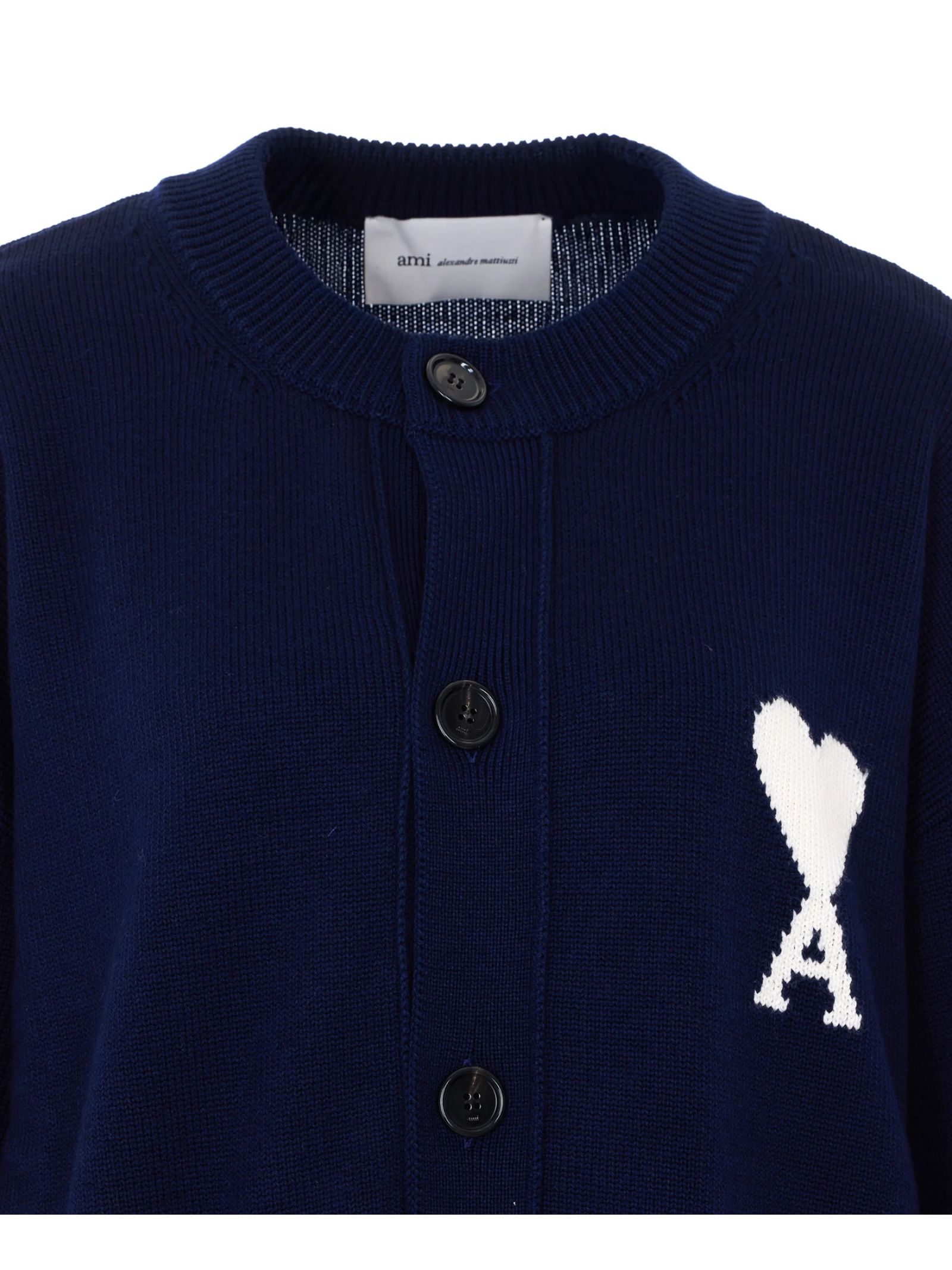 Cardigan in maglia di cotone e lana blu, prodotto unisex, bottoni Ami in corno nero, intarsio Ami de Coeur lavorato a maglia sul petto, prodotto in lana responsabile, maglia jersey
