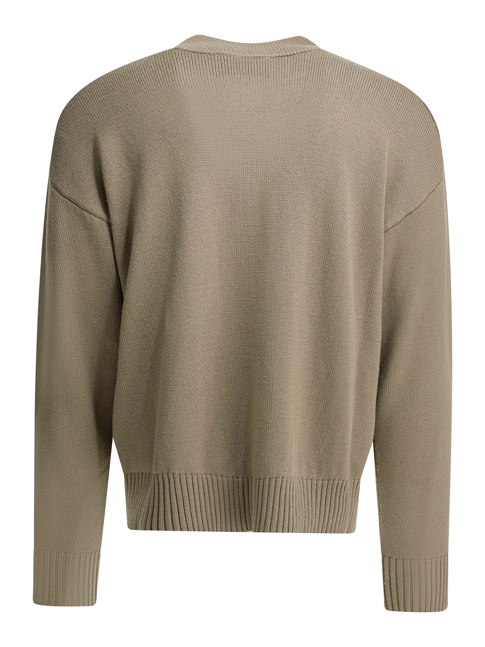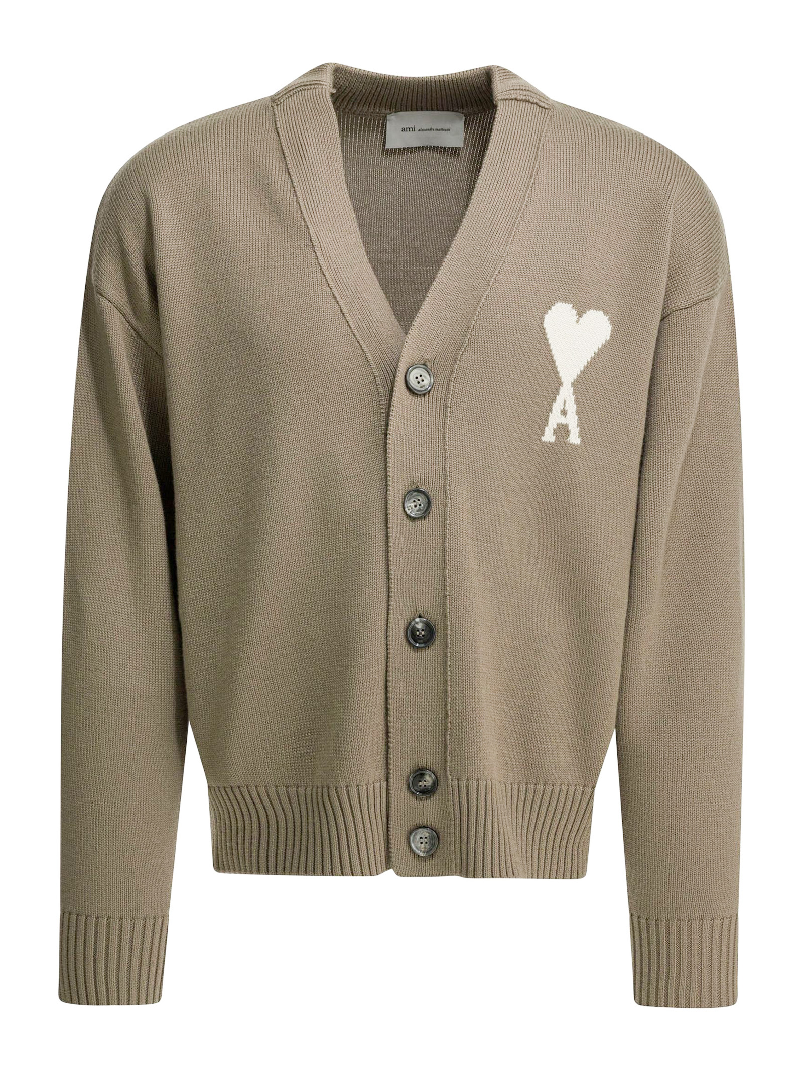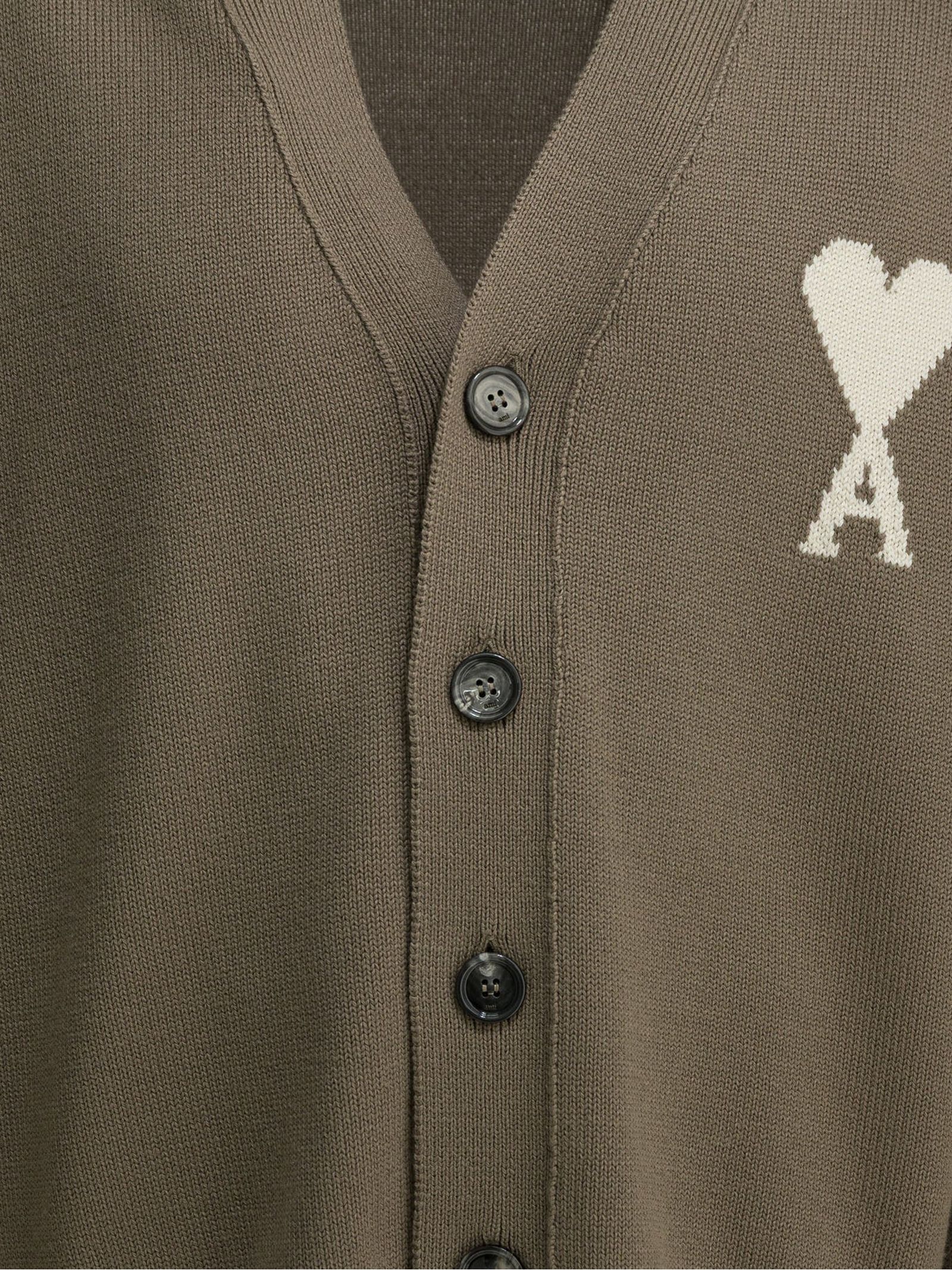 Cardigan in maglia di lana e cotone marrone, prodotto unisex, Bottoni Ami in corno nero, Intarsio in maglia Ami de Coeur sul petto, Prodotto in lana sostenibile, Maglia jersey
