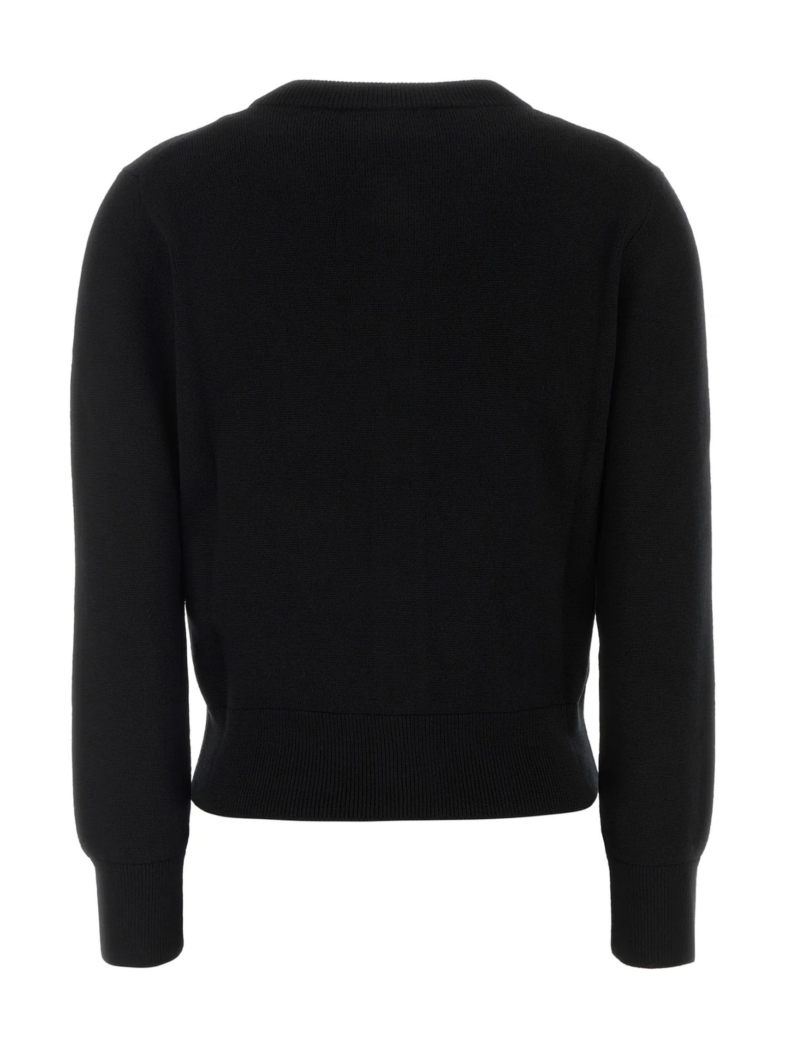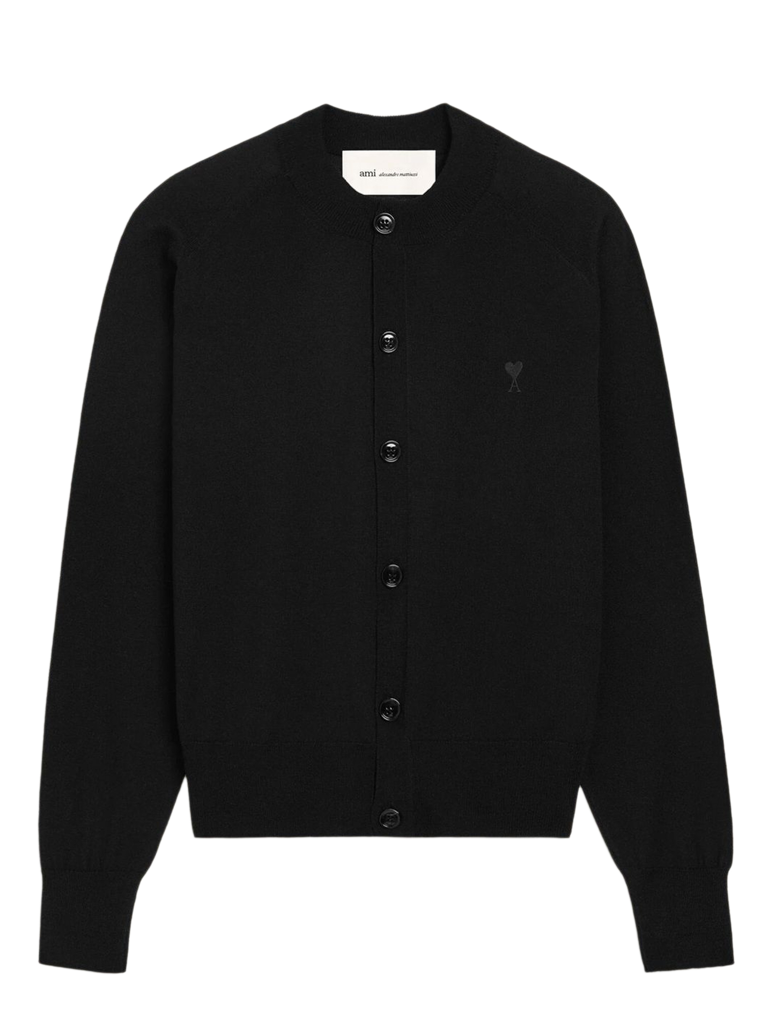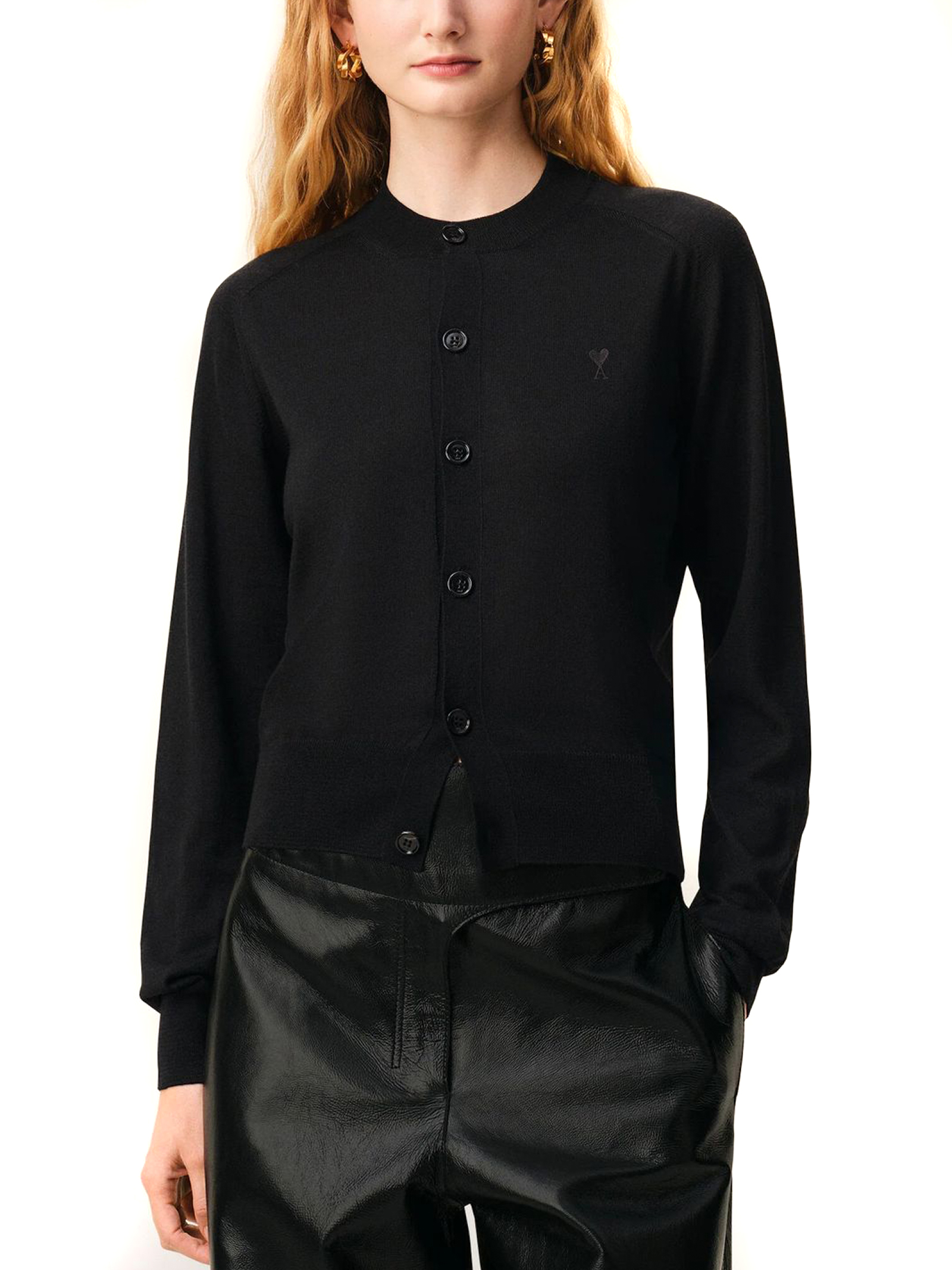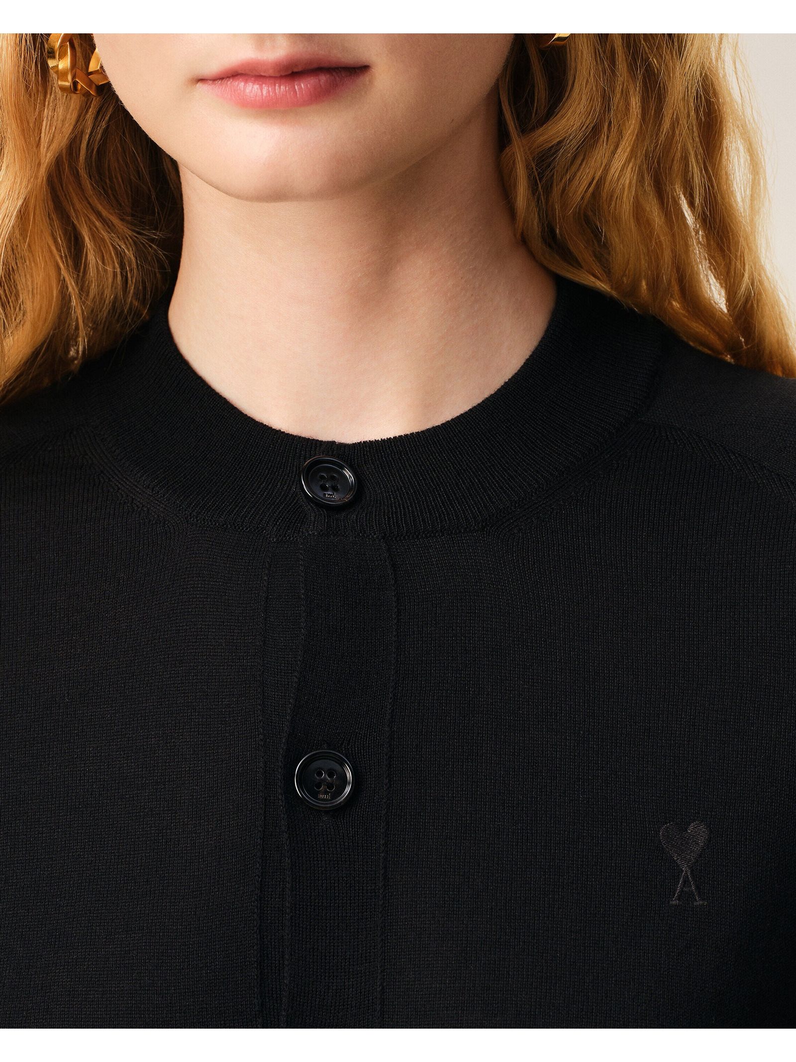 Cardigan in maglia di lana merino nero, Collo rotondo, Bottoni Ami in corno nero, Ricamo Ami de Coeur sul petto, Lavorazione interlock