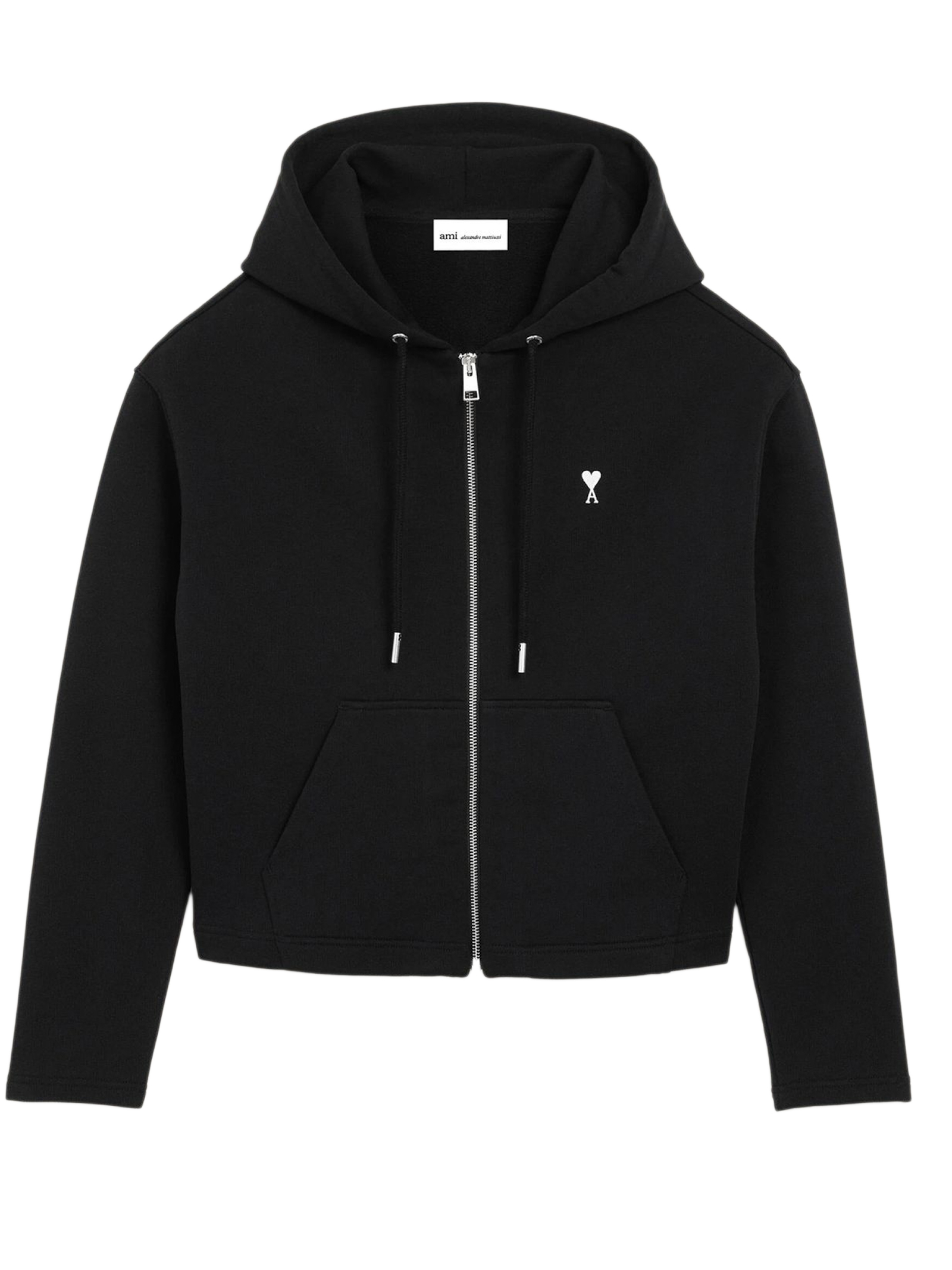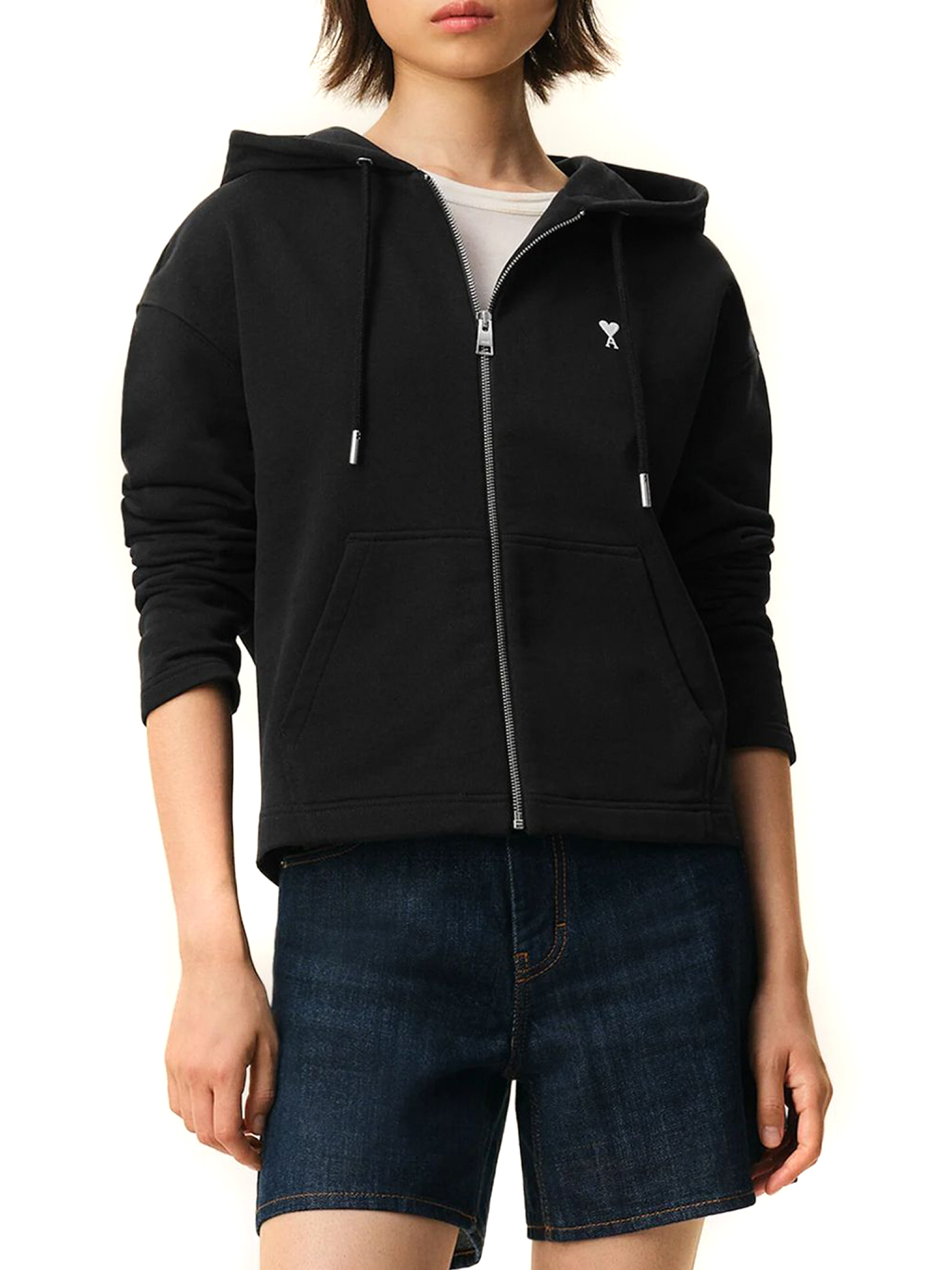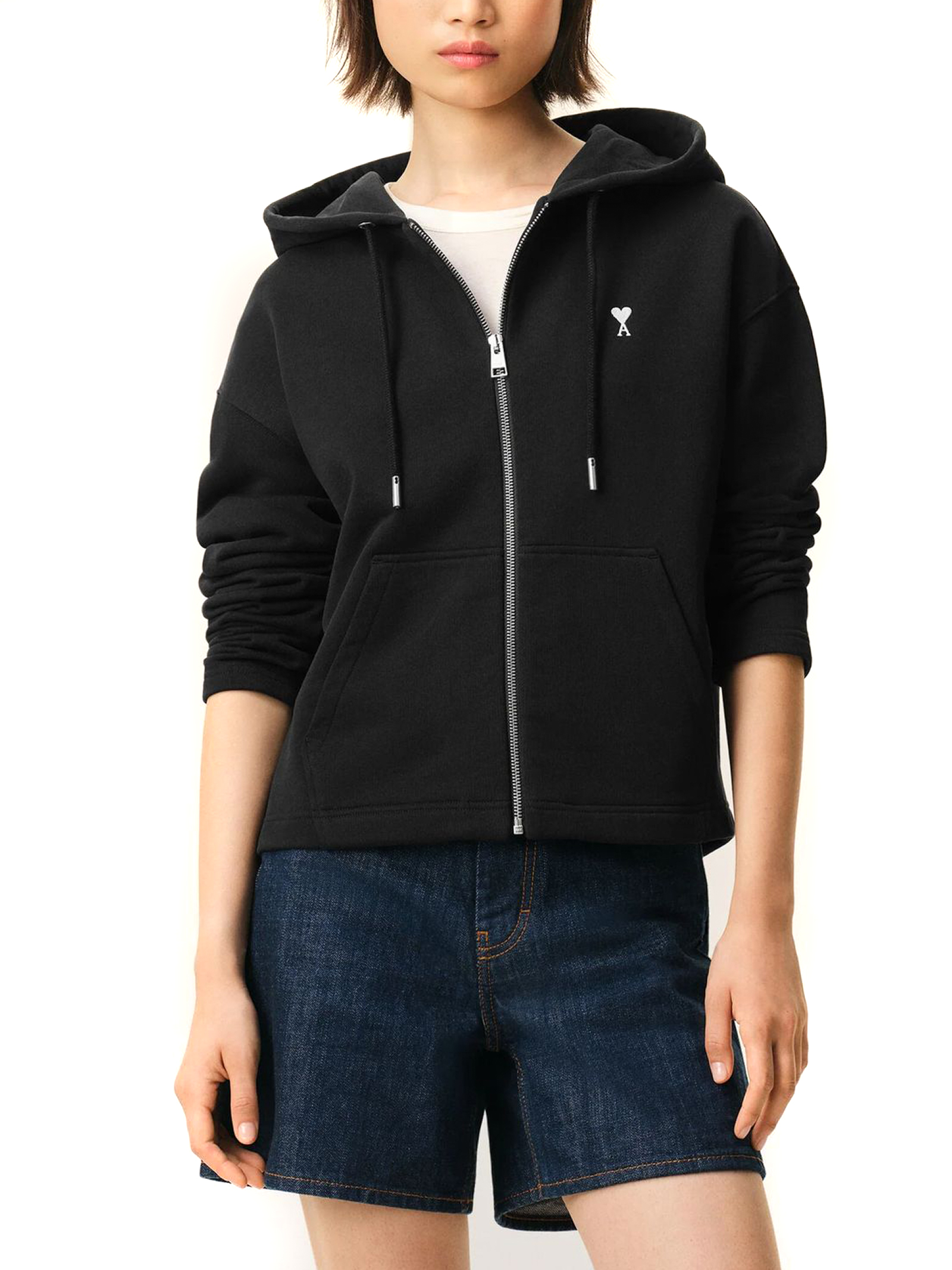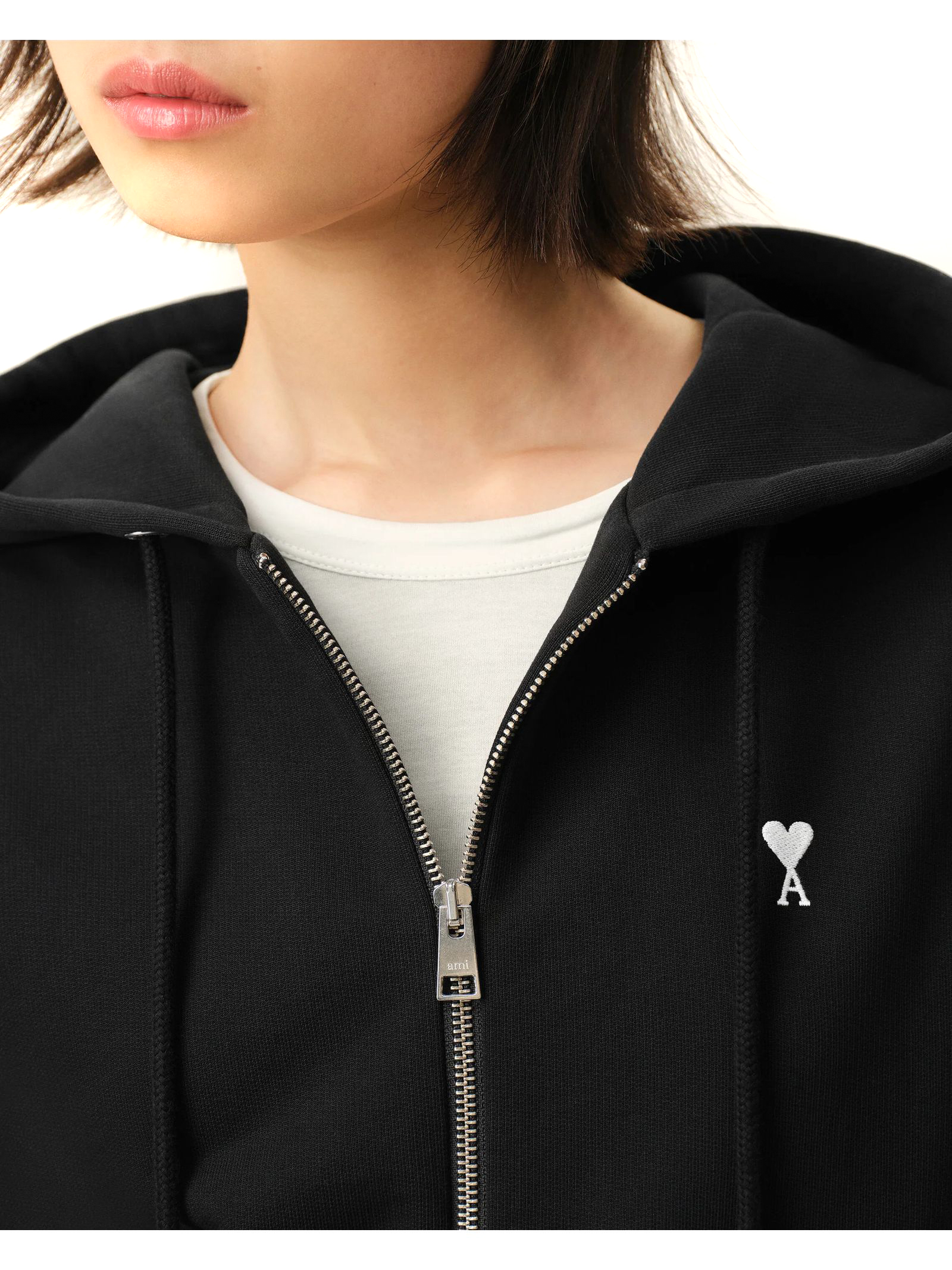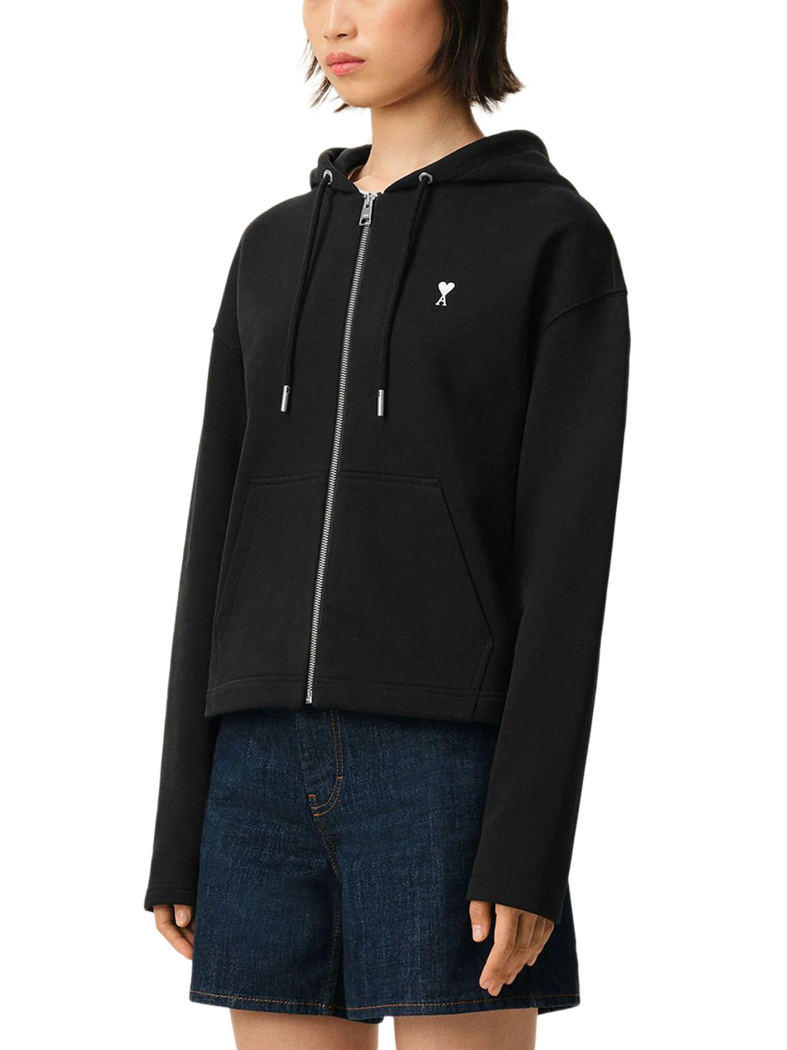 Felpa con cappuccio in pile di cotone nero, taglio classico, ricamo Ami de Coeur bianco crema sul petto, ricamo Ami tono su tono alla base del collo sul retro, terminali in metallo color argento e occhielli con incisione, zip in metallo color argento
