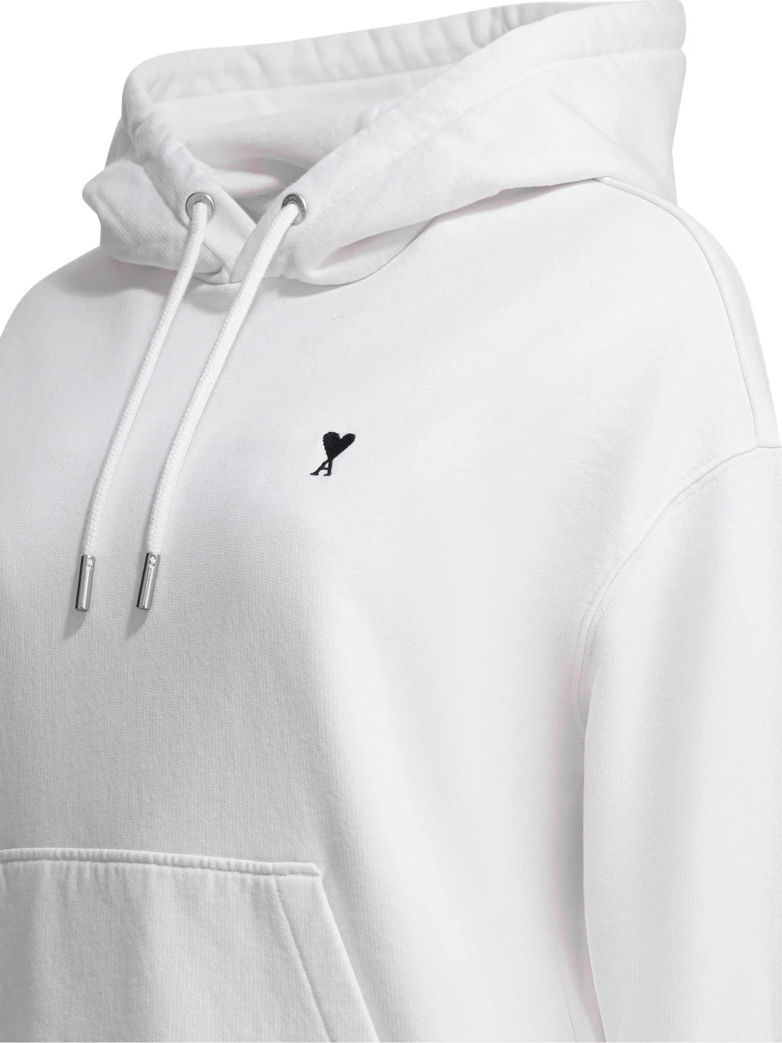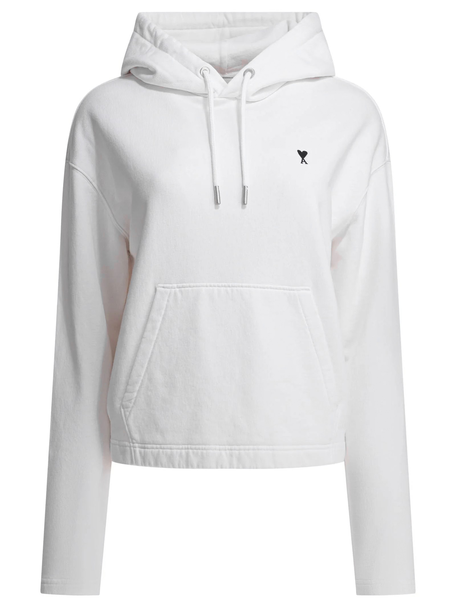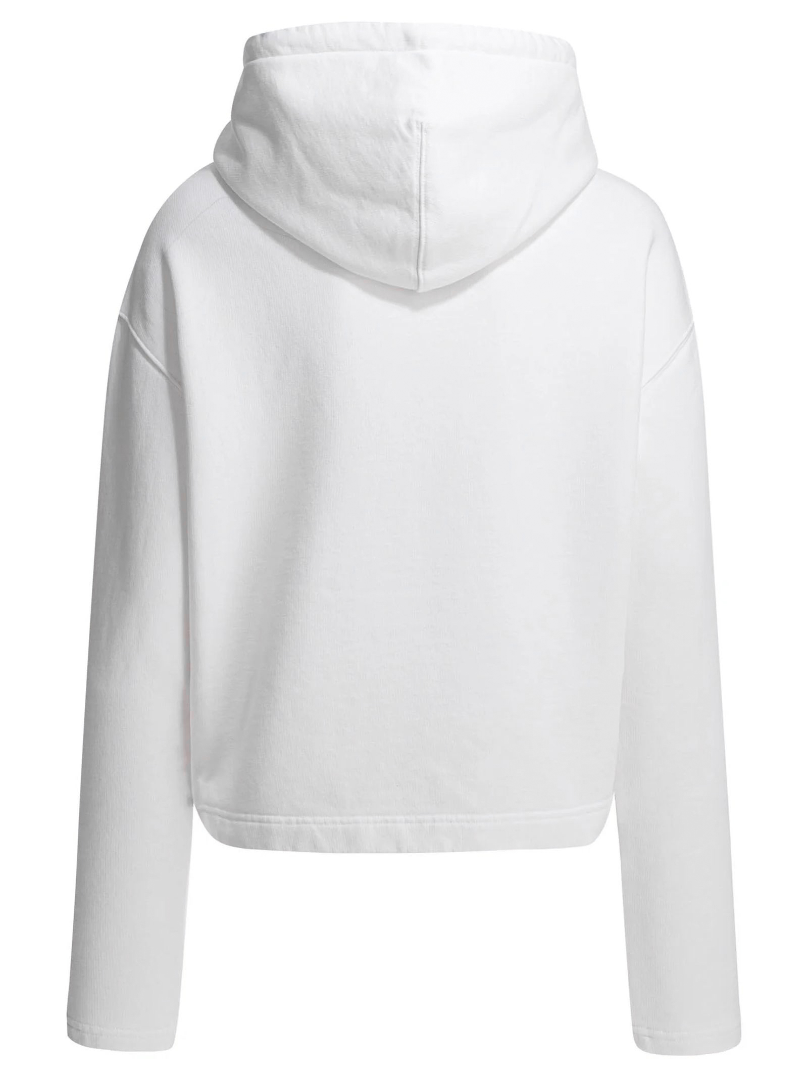 Felpa in cotone bianco con cappuccio, cappuccio con coulisse, applicazione con logo, tasca a marsupio frontale, maniche lunghe, orlo a coste