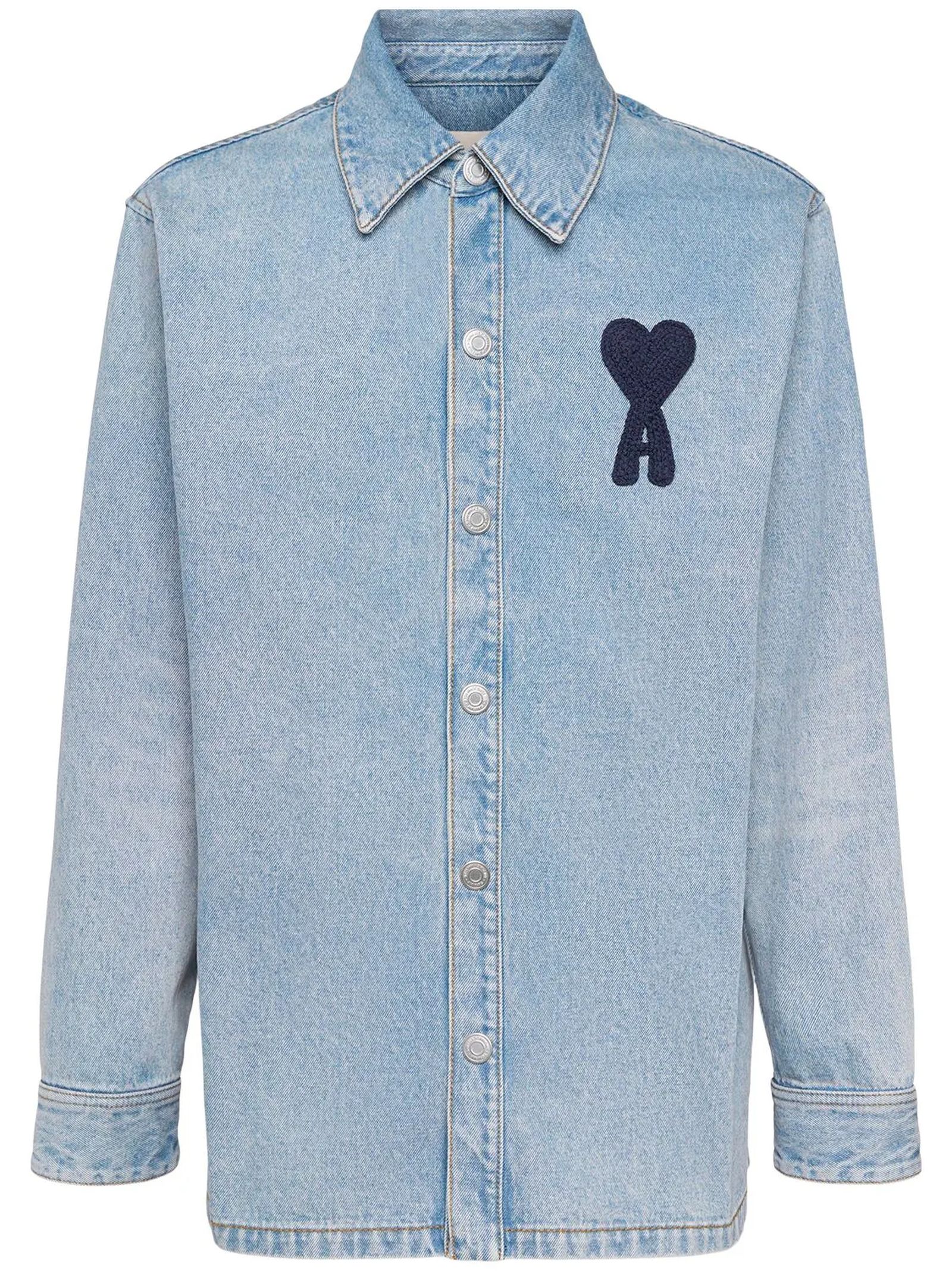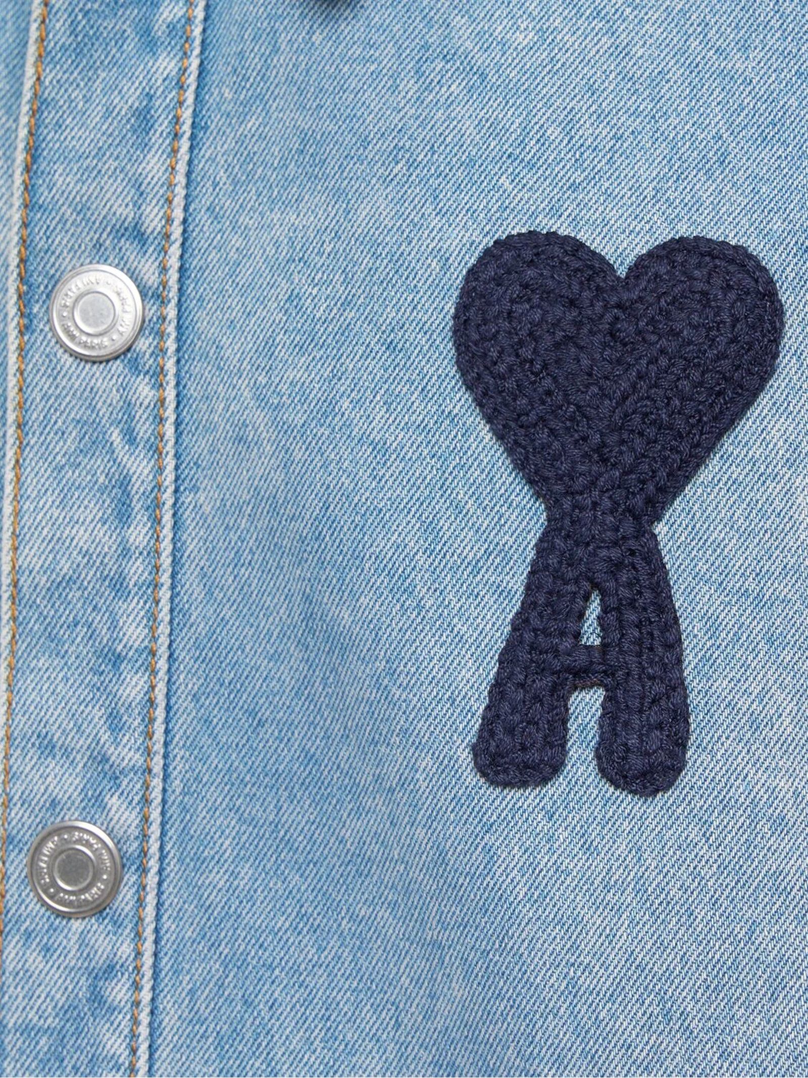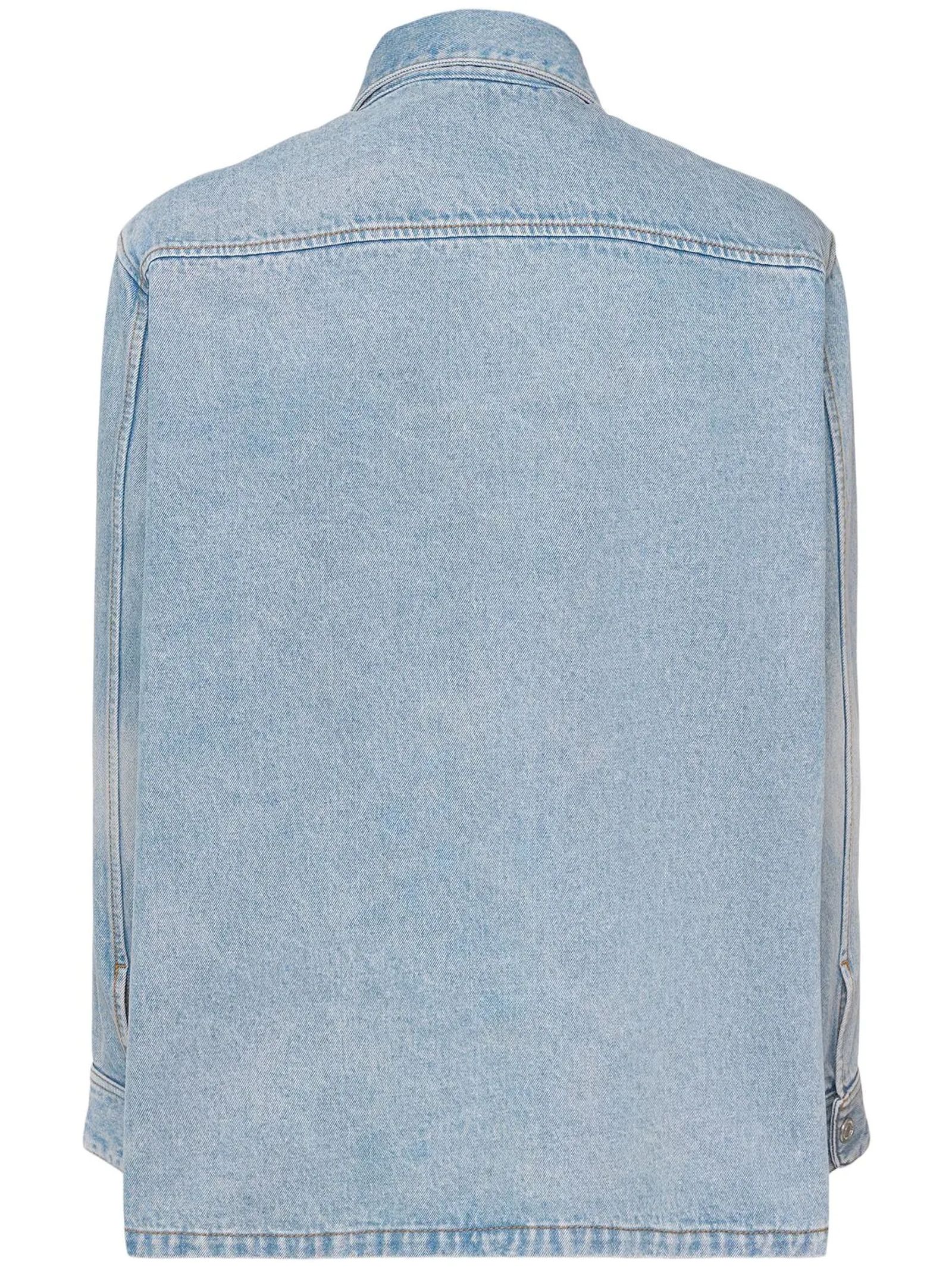 Giacca denim di cotone blu, chiusura frontale con abbottonatura, applicazione con logo sul petto, colletto classico, polsini con abbottonatura