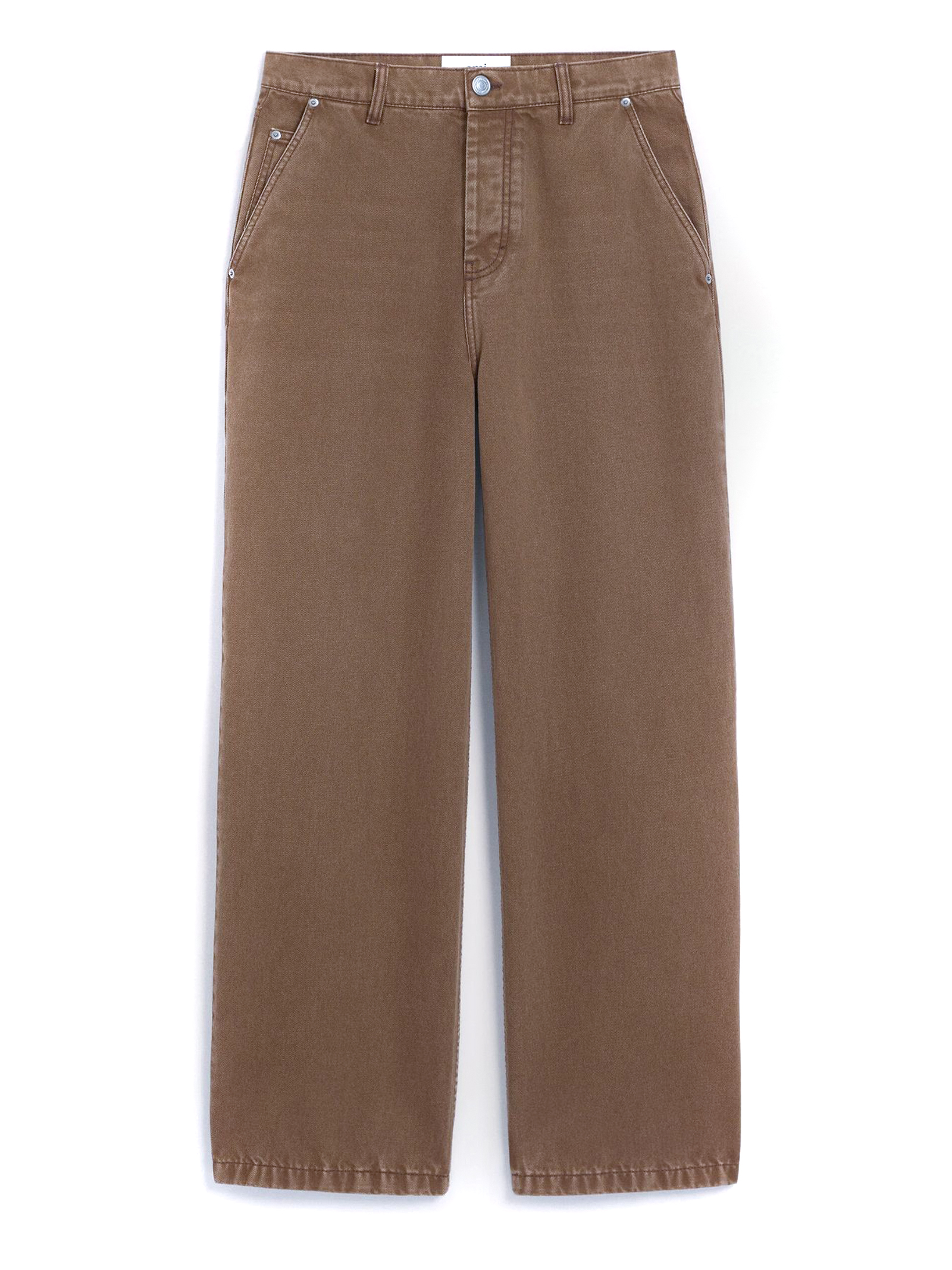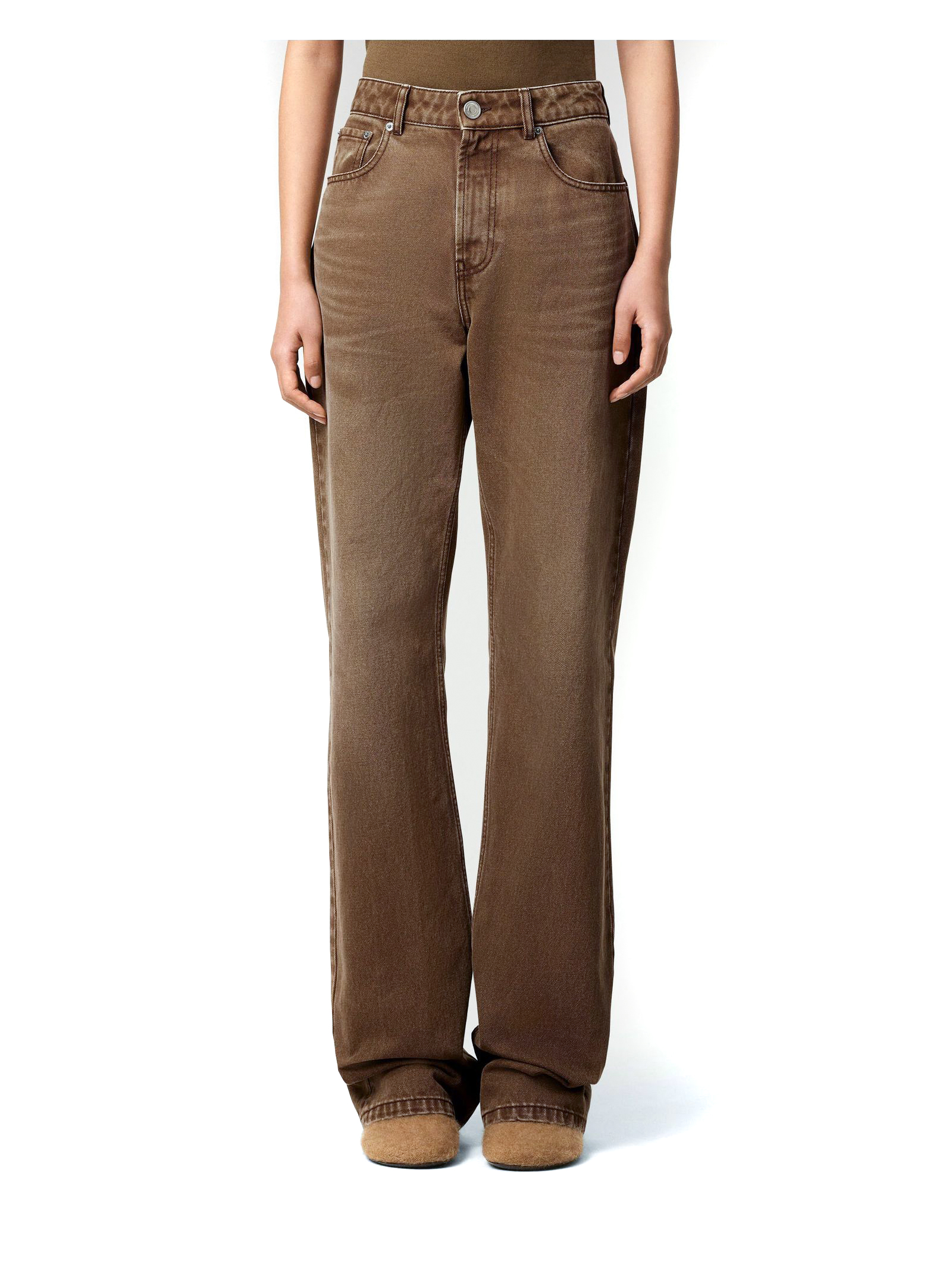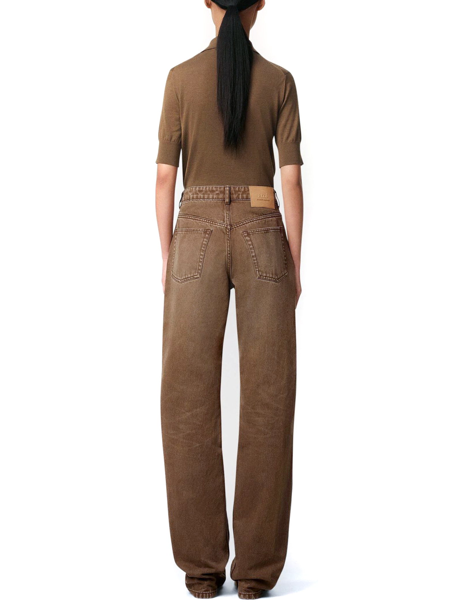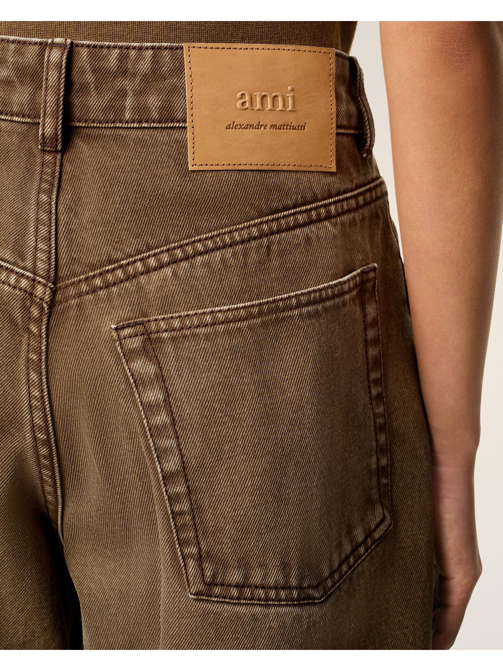 Jeans taglio ampio in twill di cotone marrone, tTaglio classico, vita classica, gamba aderente, chiusura con zip, 5 tasche, rivetti e bottoni in metallo color nichel stile denim, applicazione ami alexandre mattiussi sul retro, impunture color tabacco