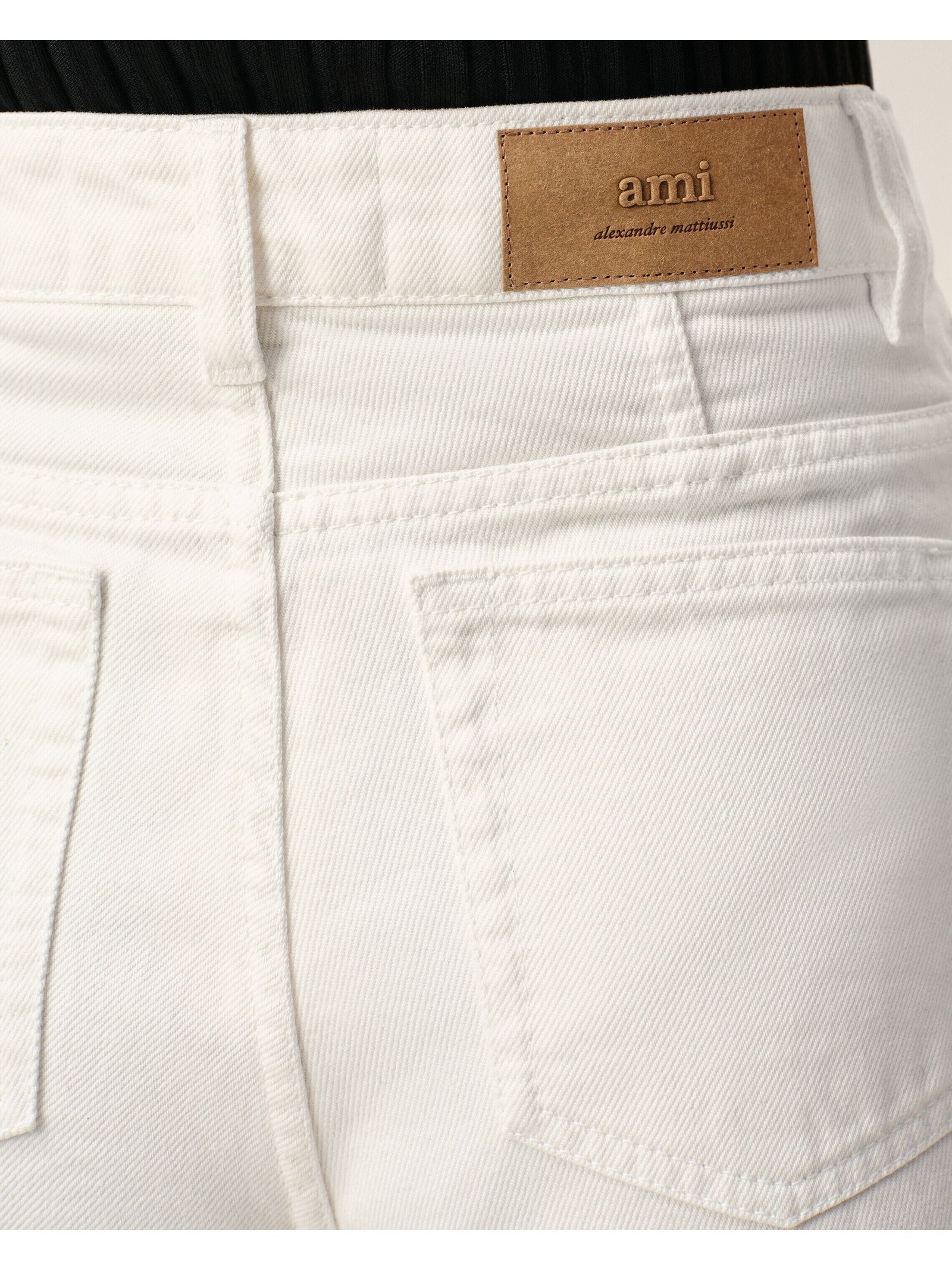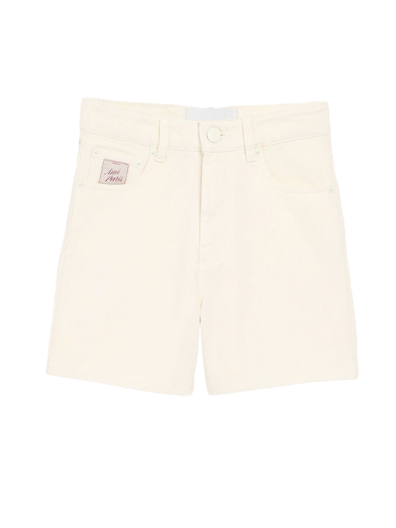 Pantaloncini in twill di cotone bianco, vita regolare, 5 tasche, chiusura con zip, rivetti e bottoni in metallo color denim biancoetichetta ami paris heritage sulla tasca portamonete, etichetta in carta jacron ami alexandre mattiussi sul retro, impunture tono su tono