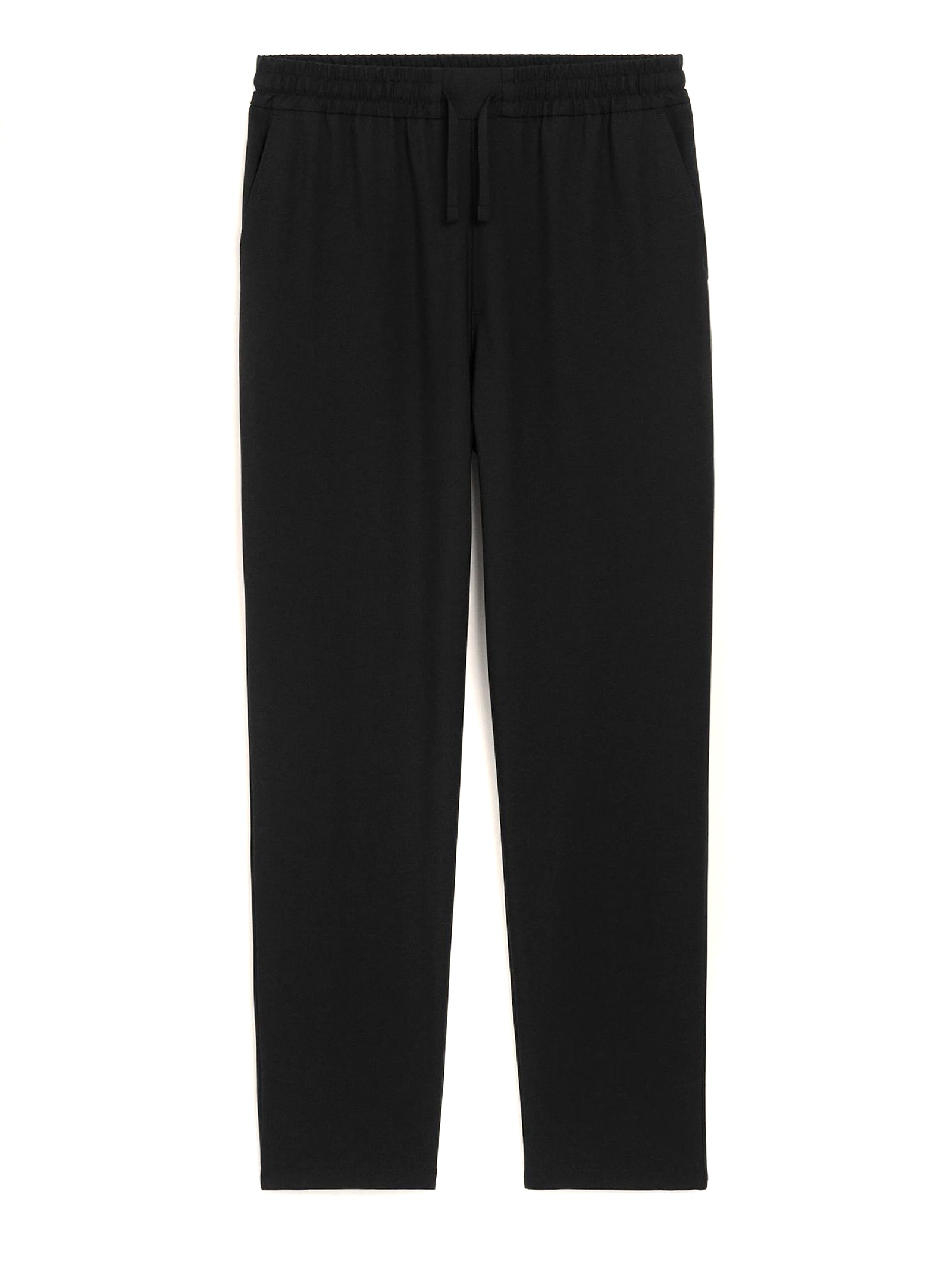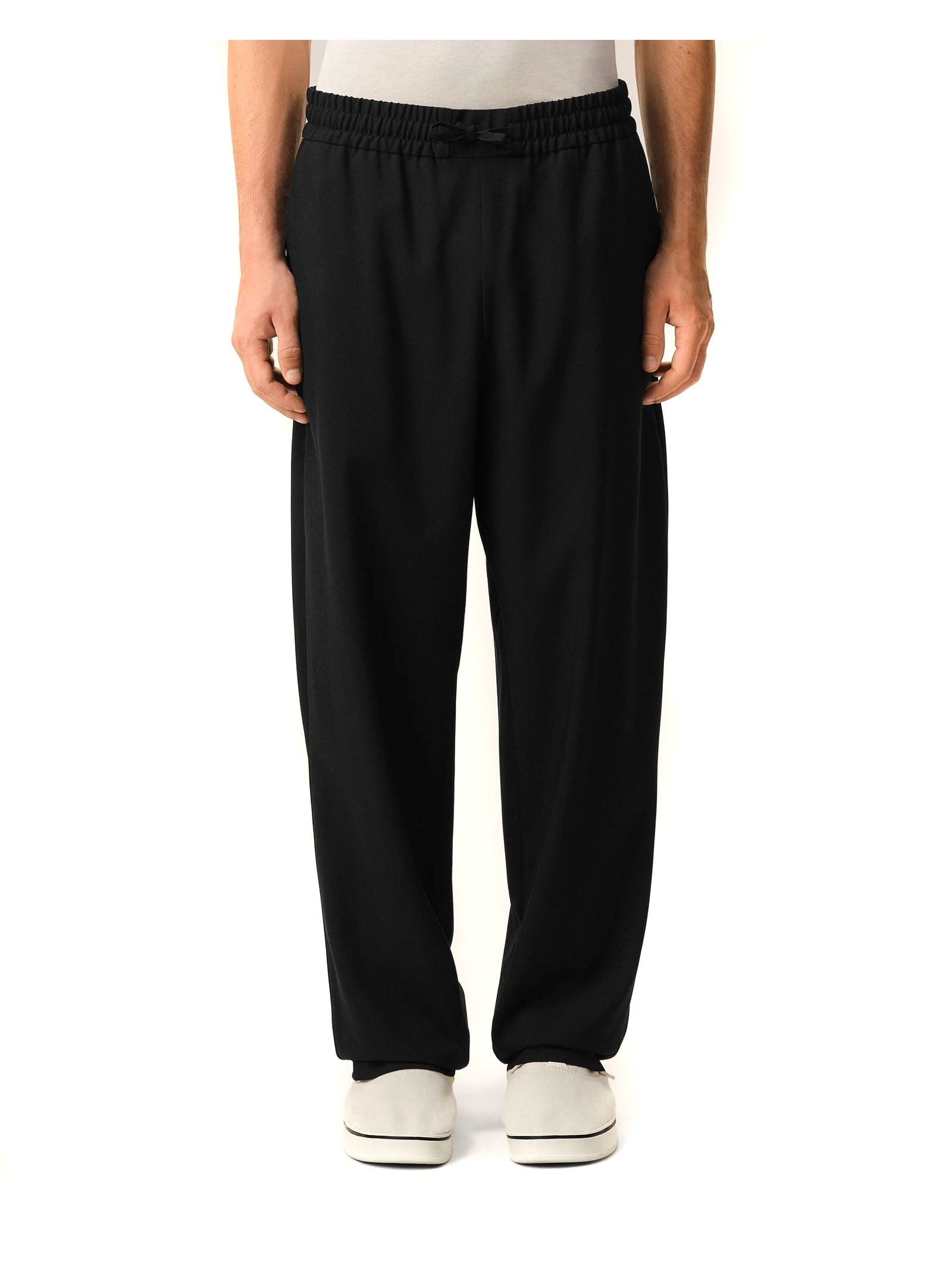 Pantaloni con elastico in vita in gabardine di lana nera, gamba dritta, elastico in vita con coulisse, tasche applicate sul retro, placca Ami de Coeur sulla tasca posteriore.