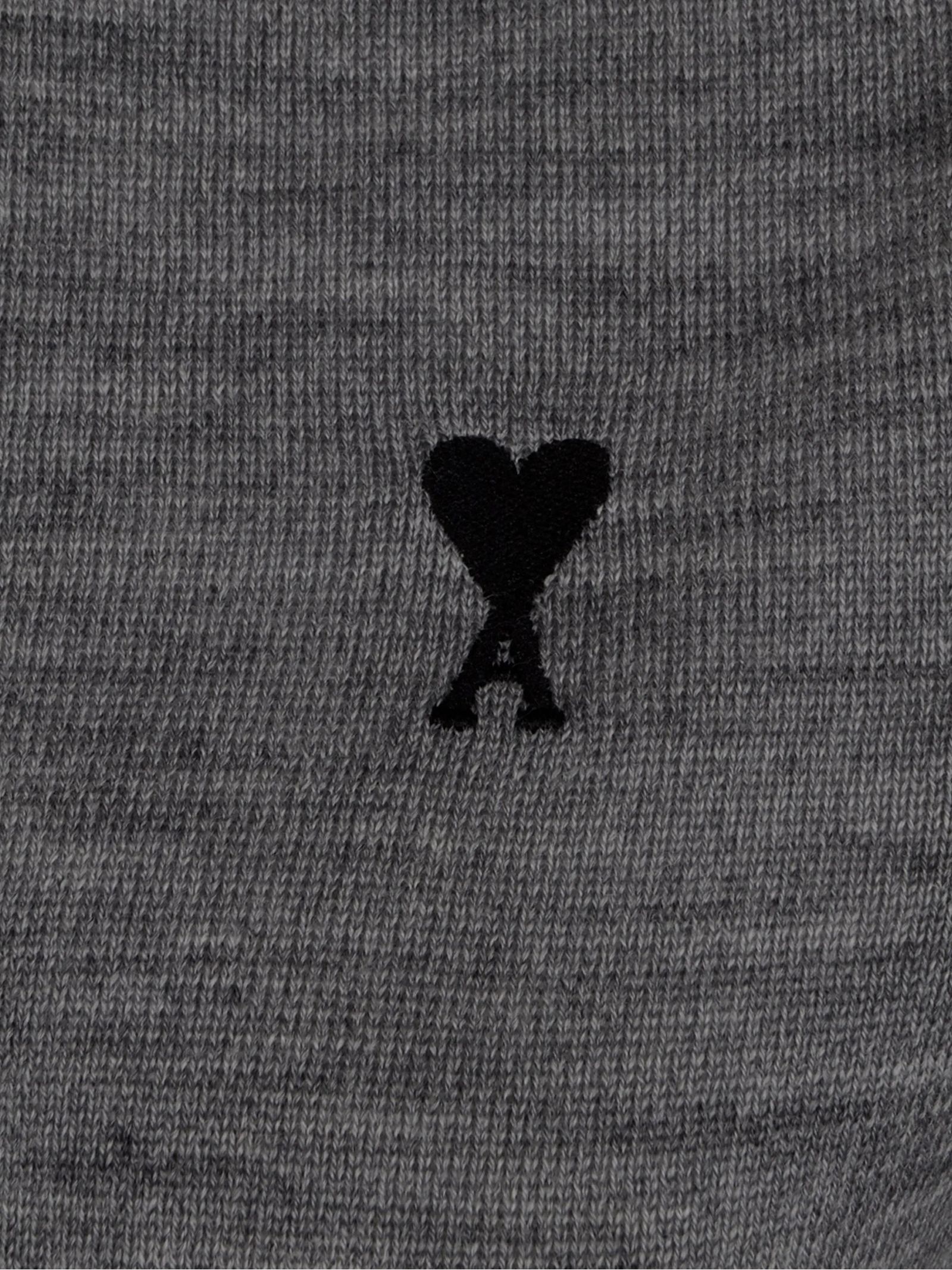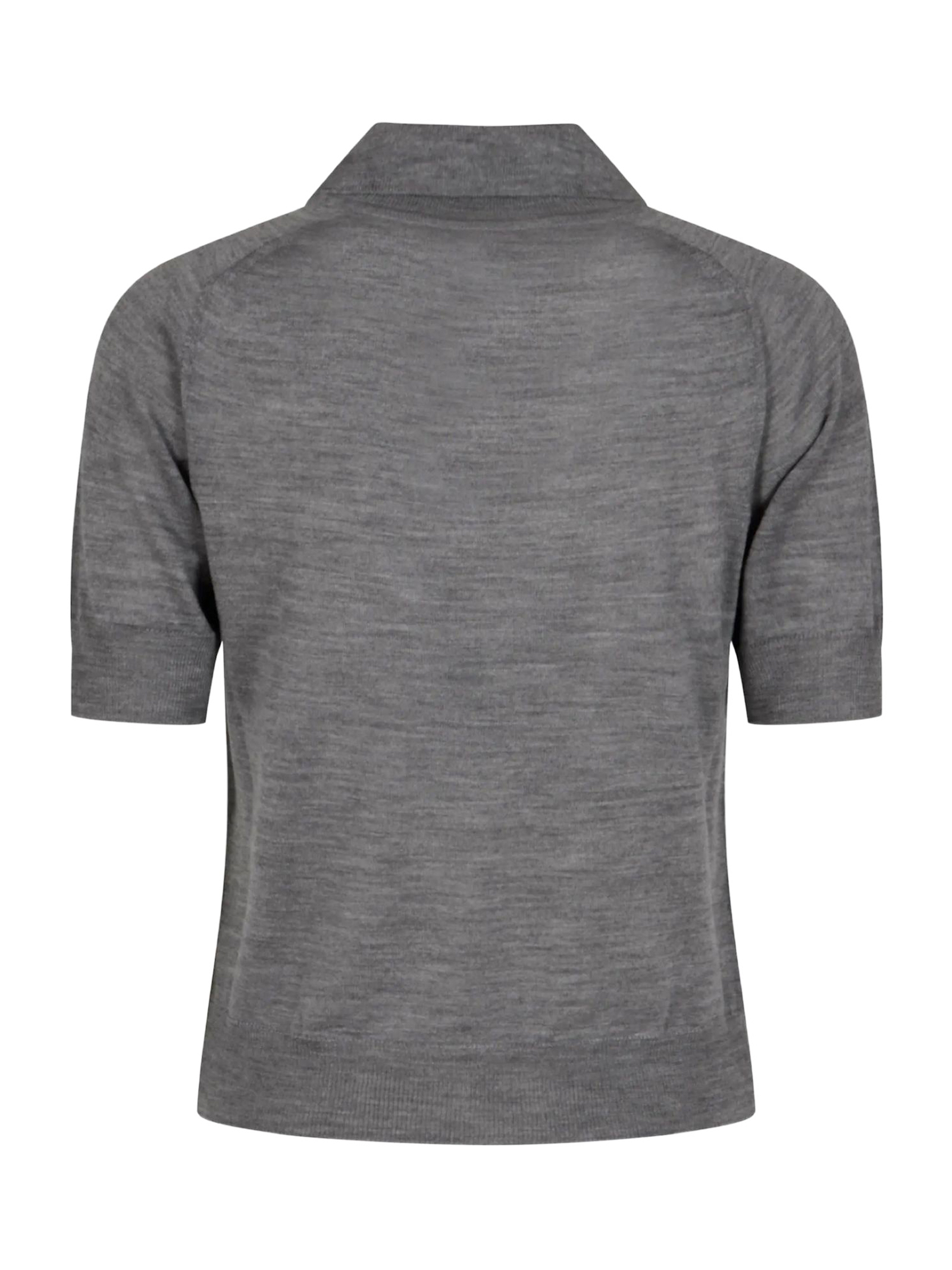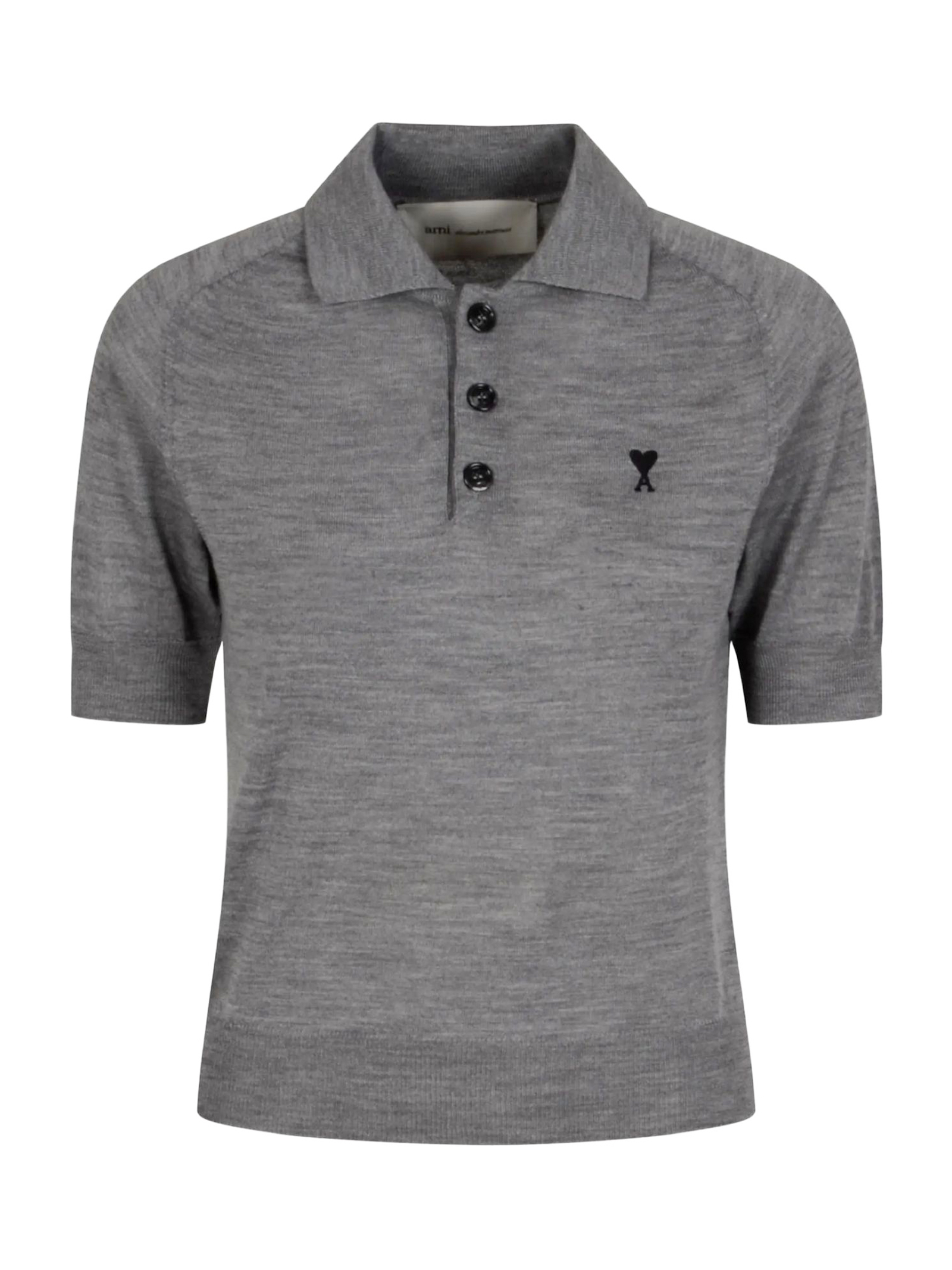 Polo in lana merino grigio con colletto classico, logo ricamato sul petto, finiture a costine