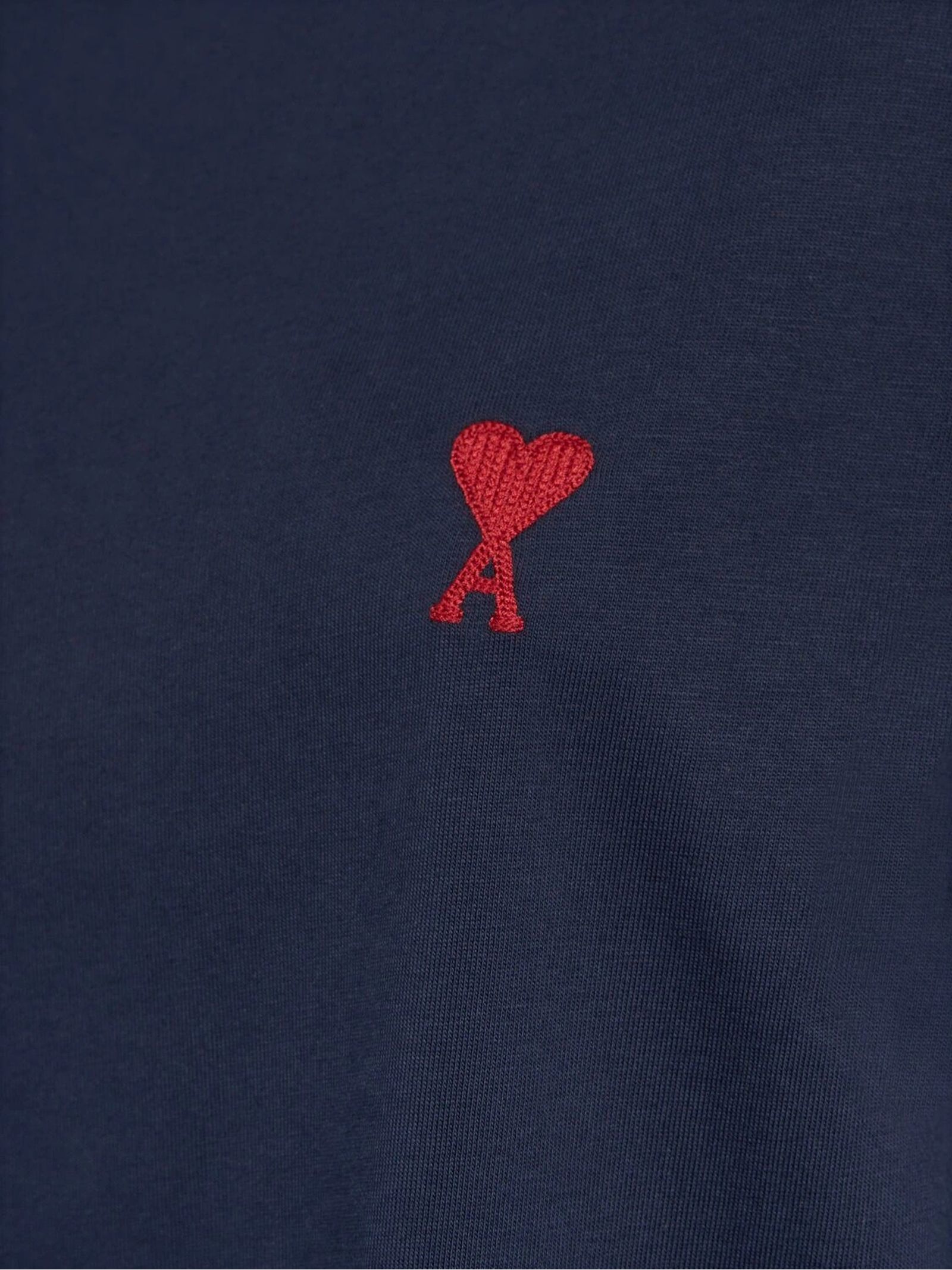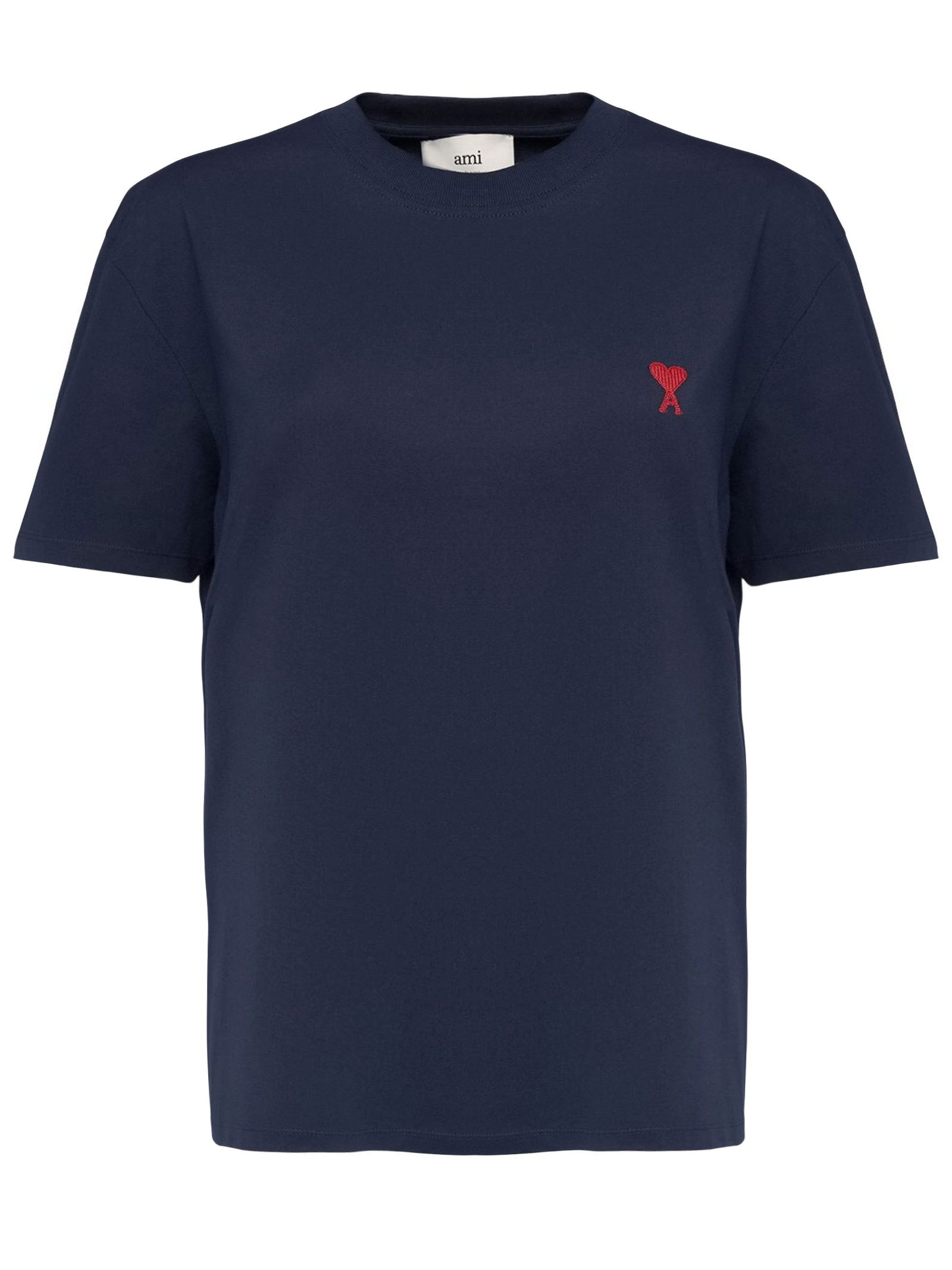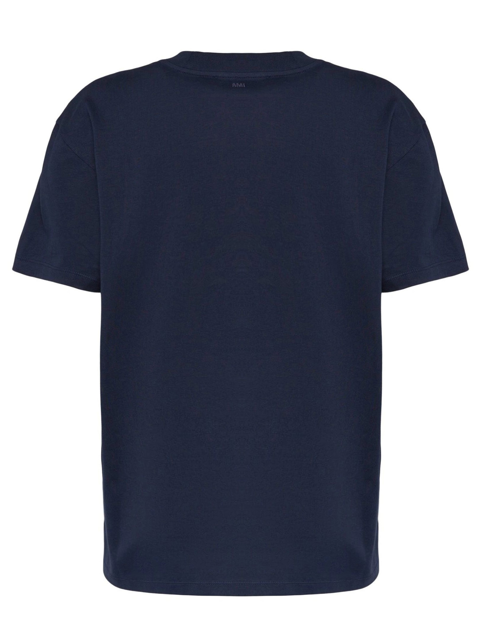 T-shirt in cotone biologico blu, trama jersey, caratteristico motivo con monogramma Ami de Coeur, girocollo, maniche con spalle scese, maniche corte, orlo dritto