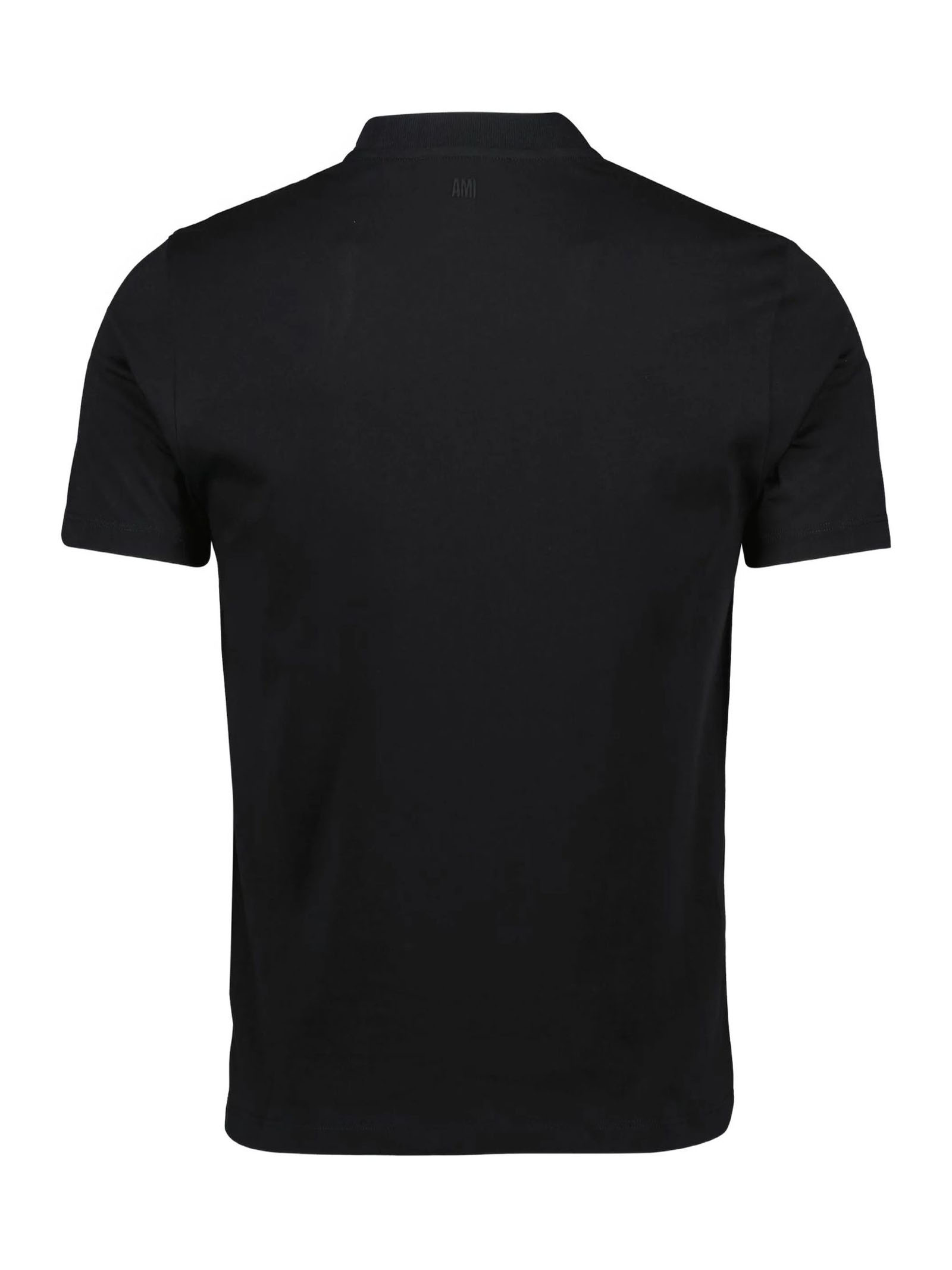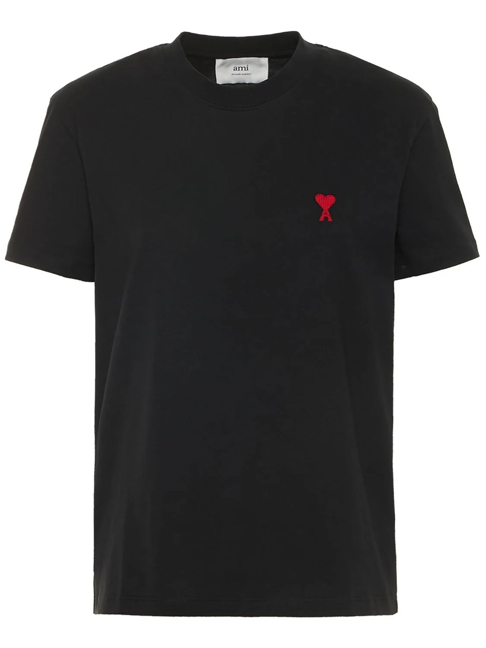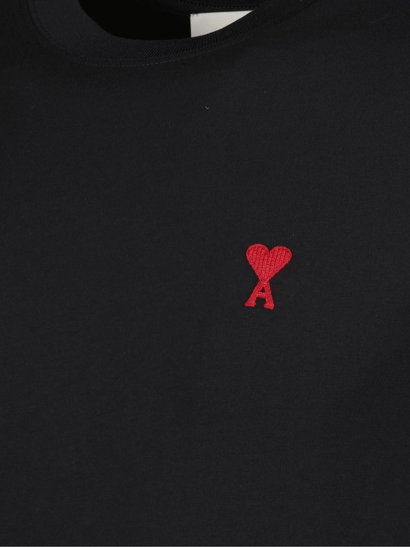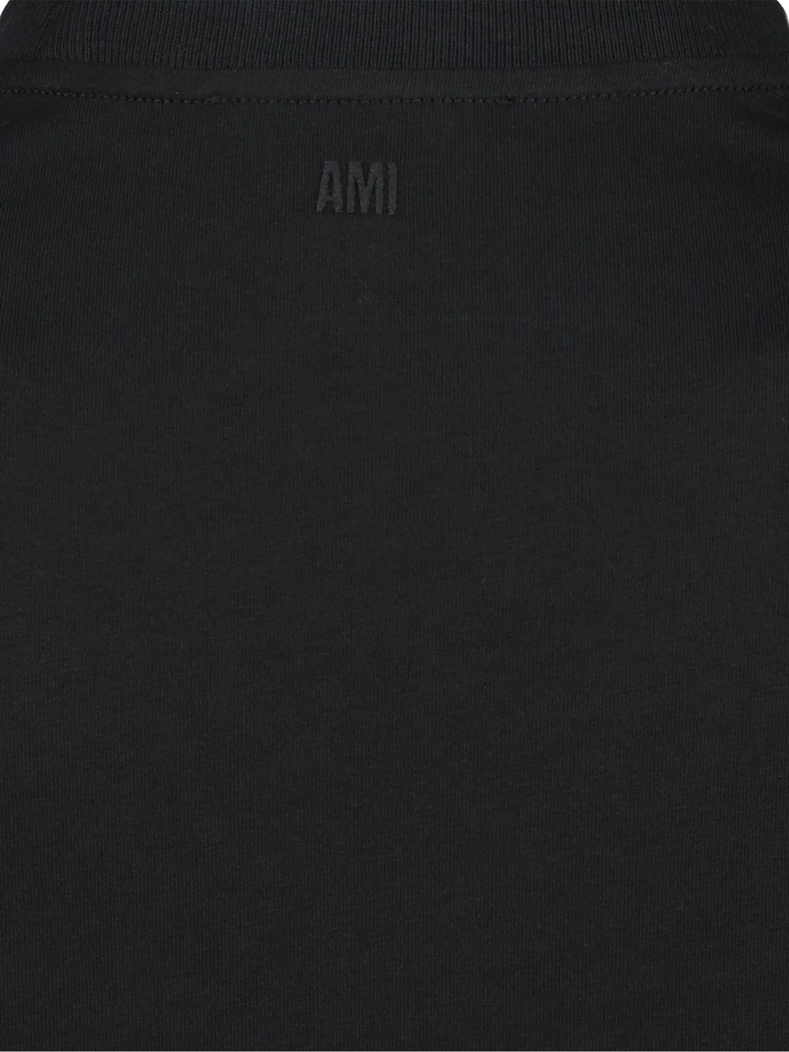 T-shirt in cotone biologico nero, trama jersey, caratteristico motivo con monogramma Ami de Coeur, girocollo, maniche con spalle scese, maniche corte, orlo dritto