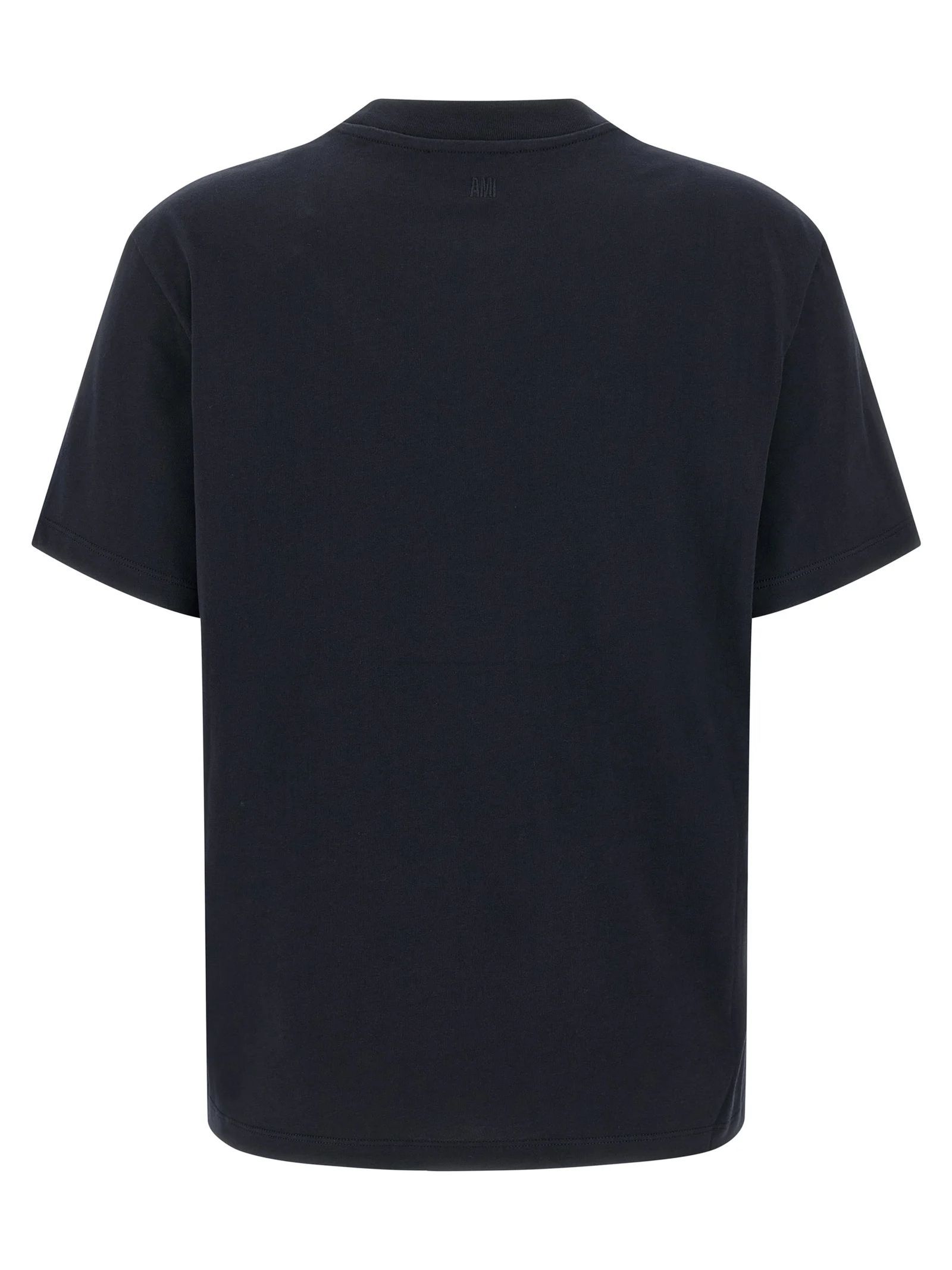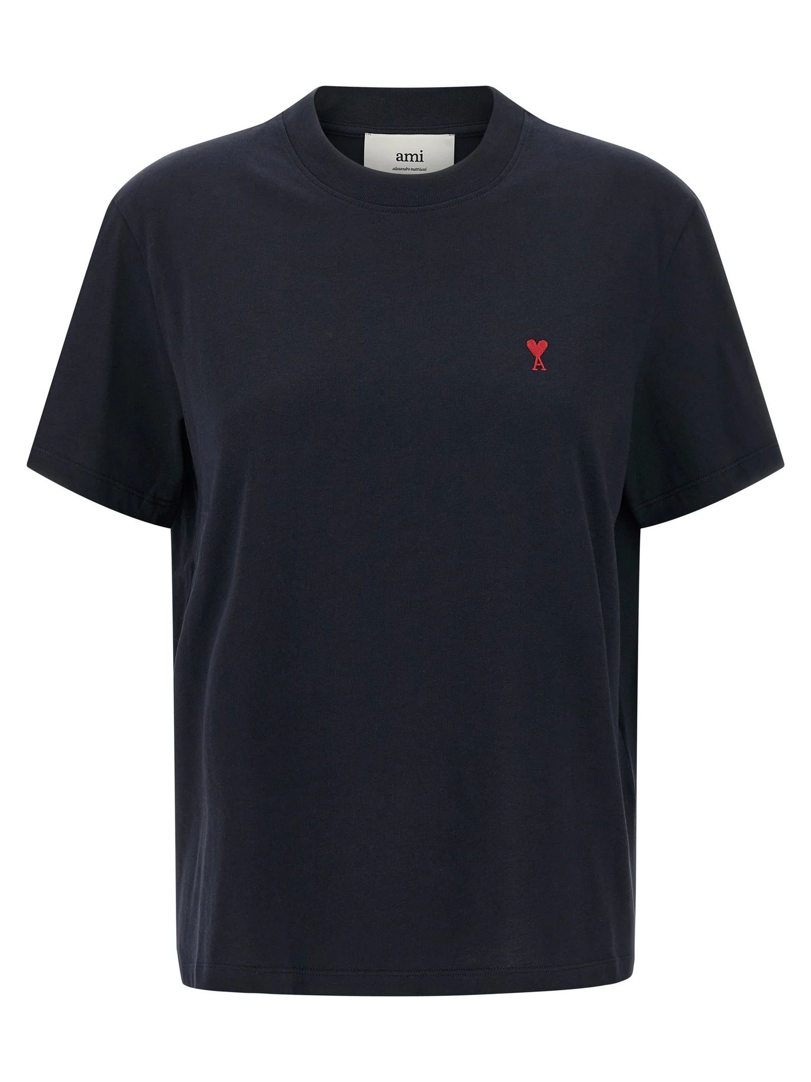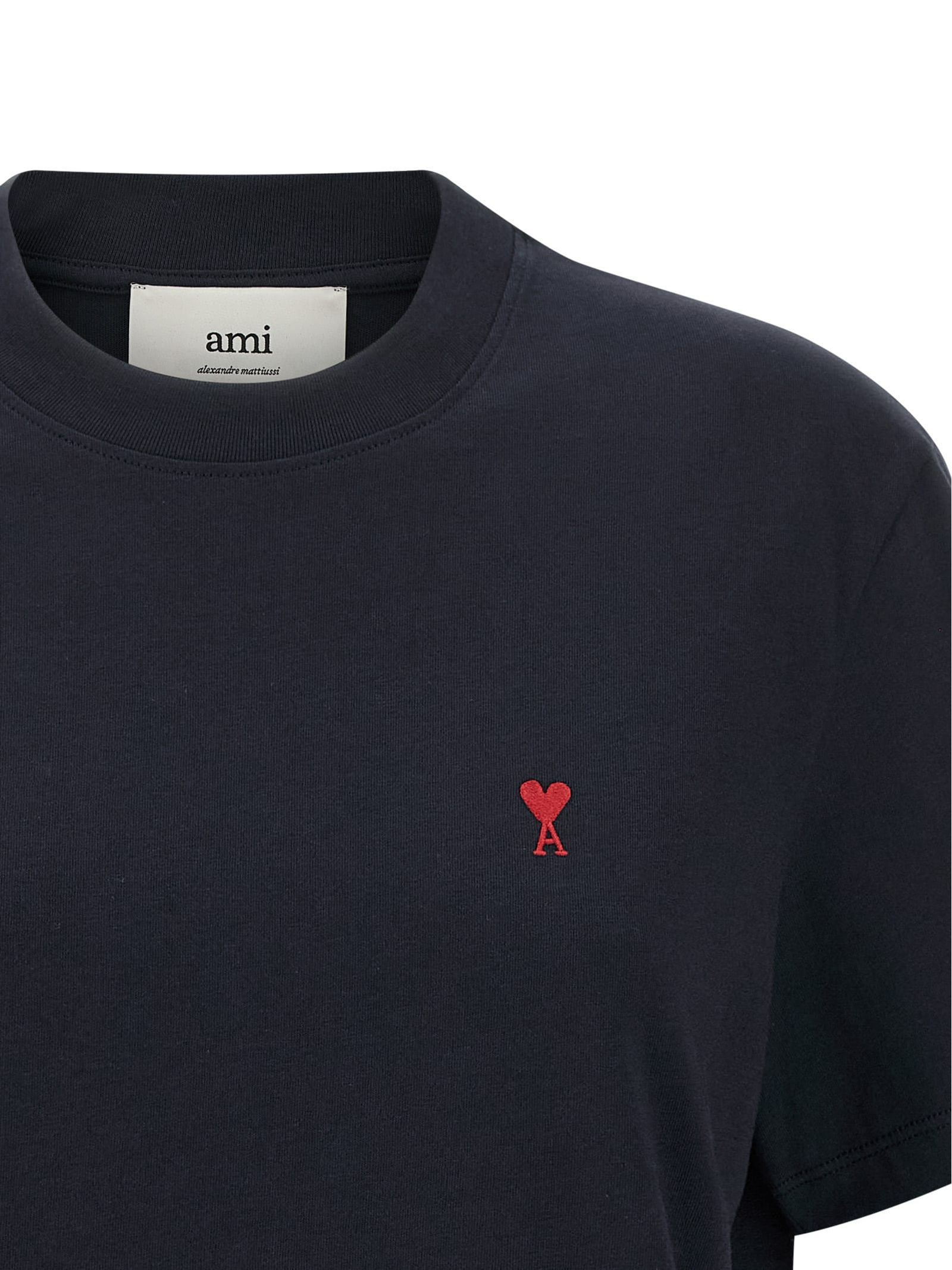 T-shirt in jersey di cotone biologico blu, vestibilità classica, prodotto unisex, ricamo Ami de Coeur rosso sul petto, ricamo Ami tono su tono sotto lo scollo posteriore