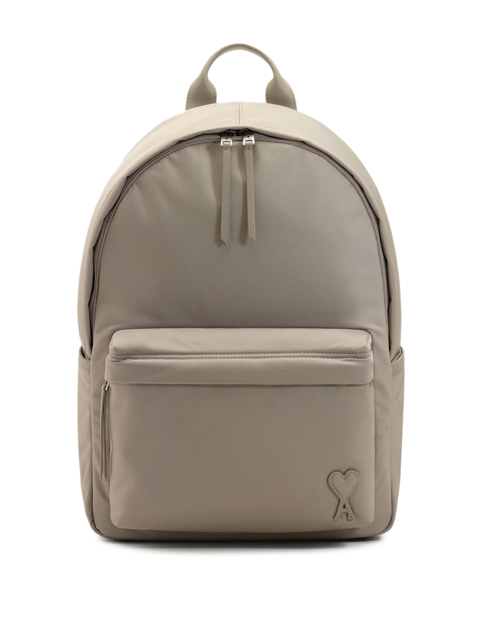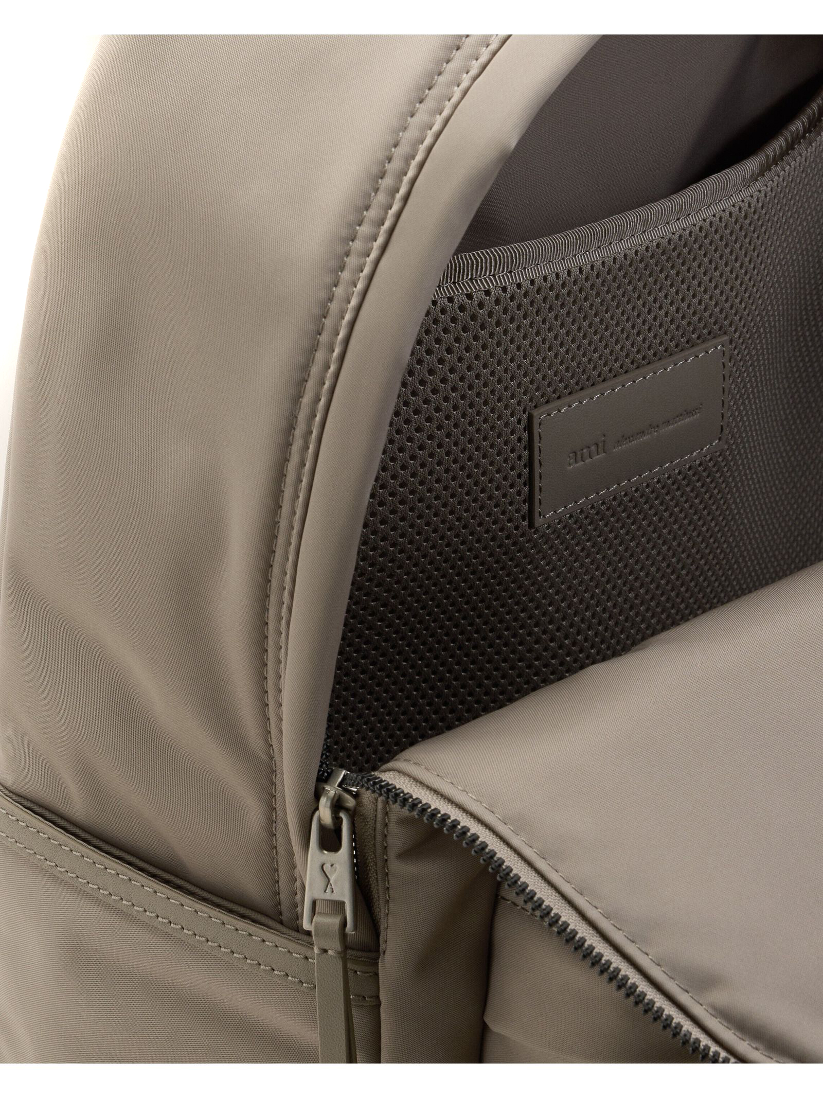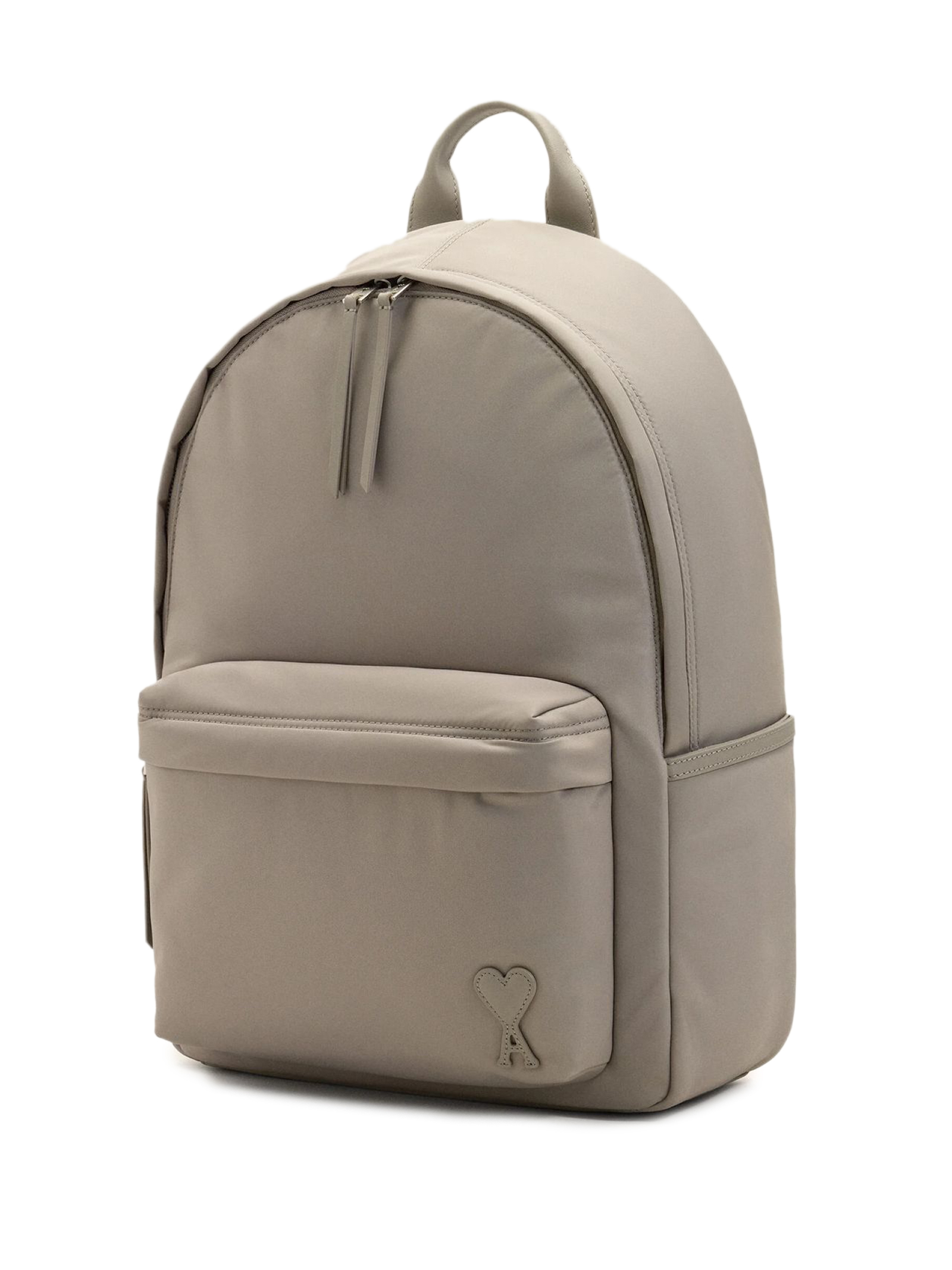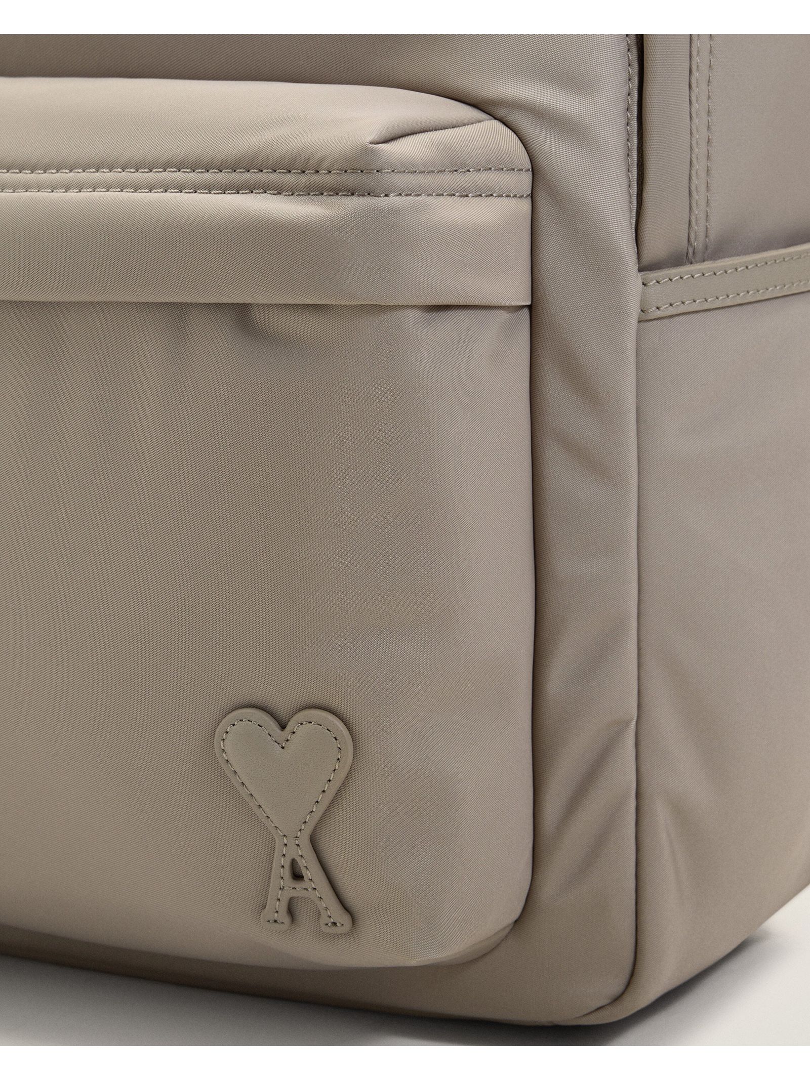 Zaino imbottito Marcel in tela di nylon grigio, prodotto unisex, tela di nylon idrorepellente, dettagli e base dello zaino in pelle liscia, chiusura con zip, dettagli in metallo color argento satinato, uno scomparto centrale con zip e divisorio in rete imbottito, una tasca frontale con zip e due tasche laterali, applicazione Ami de Coeur in pelle liscia, spallacci imbottiti regolabili, fodera in tela di nylon, dimensioni: 43,5 x 32 x 13 cm