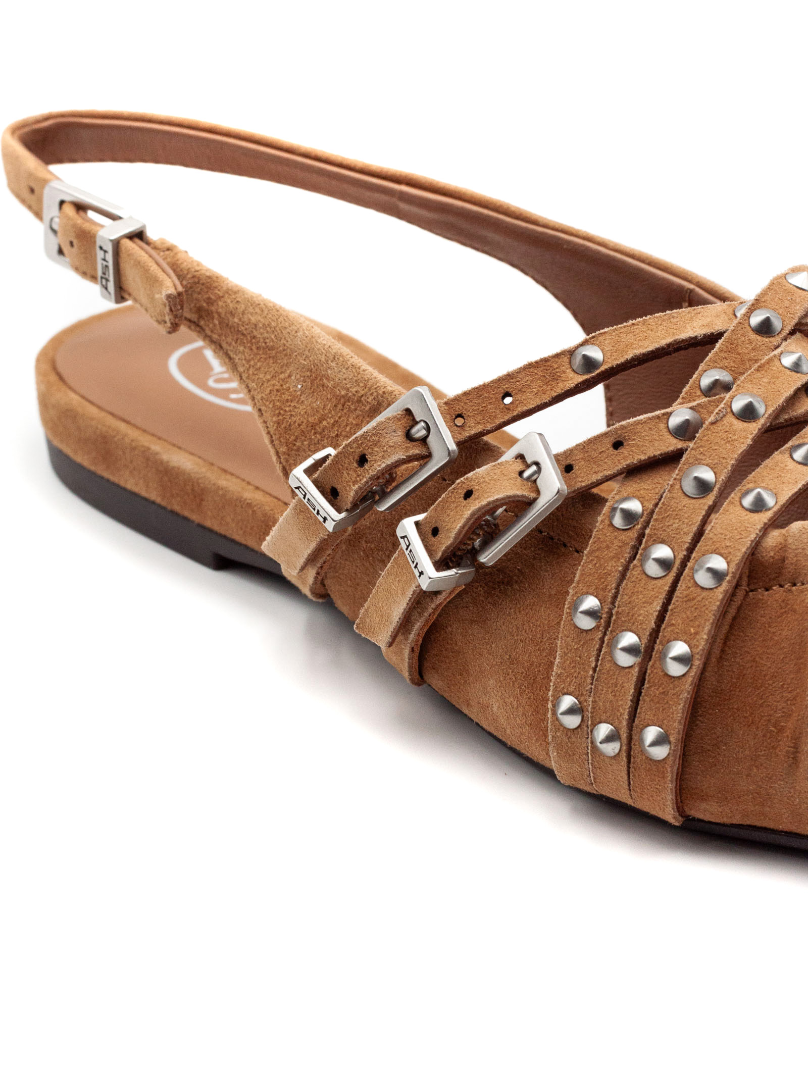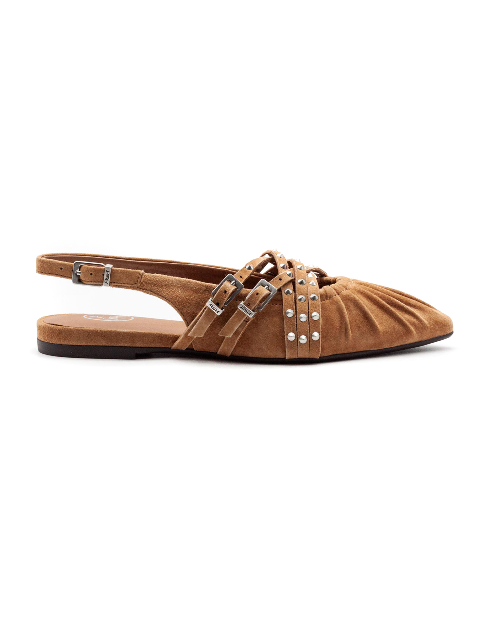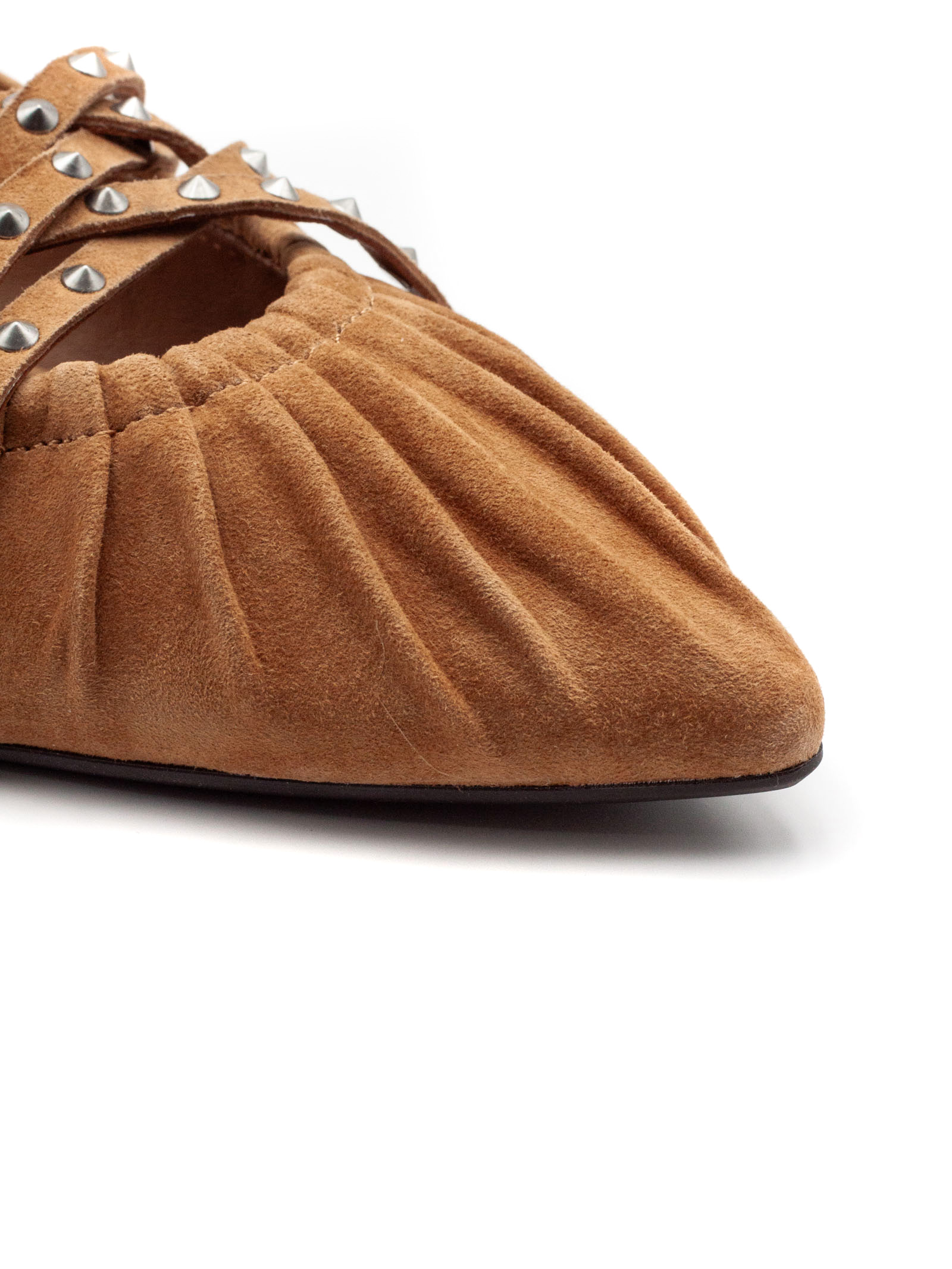Ballerina slingback in suede marrone, punta affusolata, cinturini multipli con fibbie metalliche, borchie decorative, suola bassa