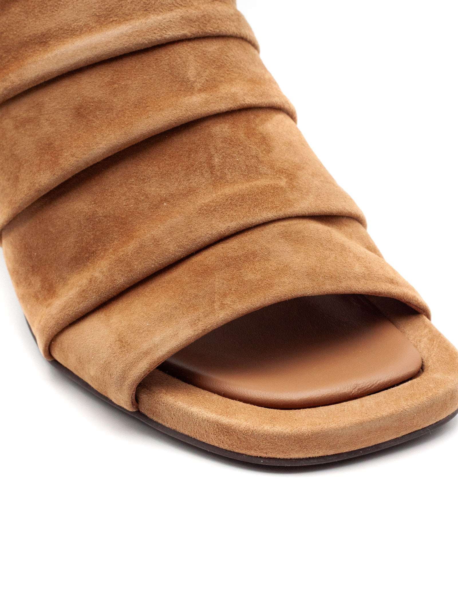 Sandalo Eva in suede beige, punta aperta, fascia ampia arricciata, tacco medio largo, suola sagomata, altezza tacco 7 cm