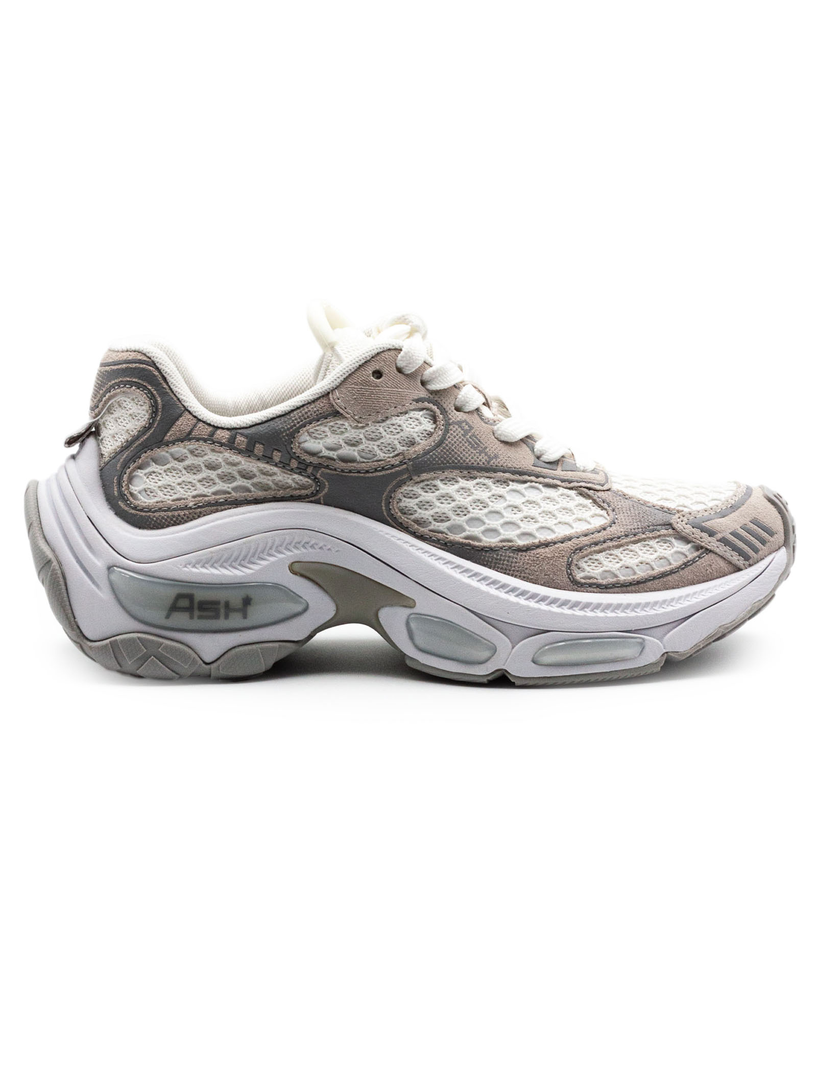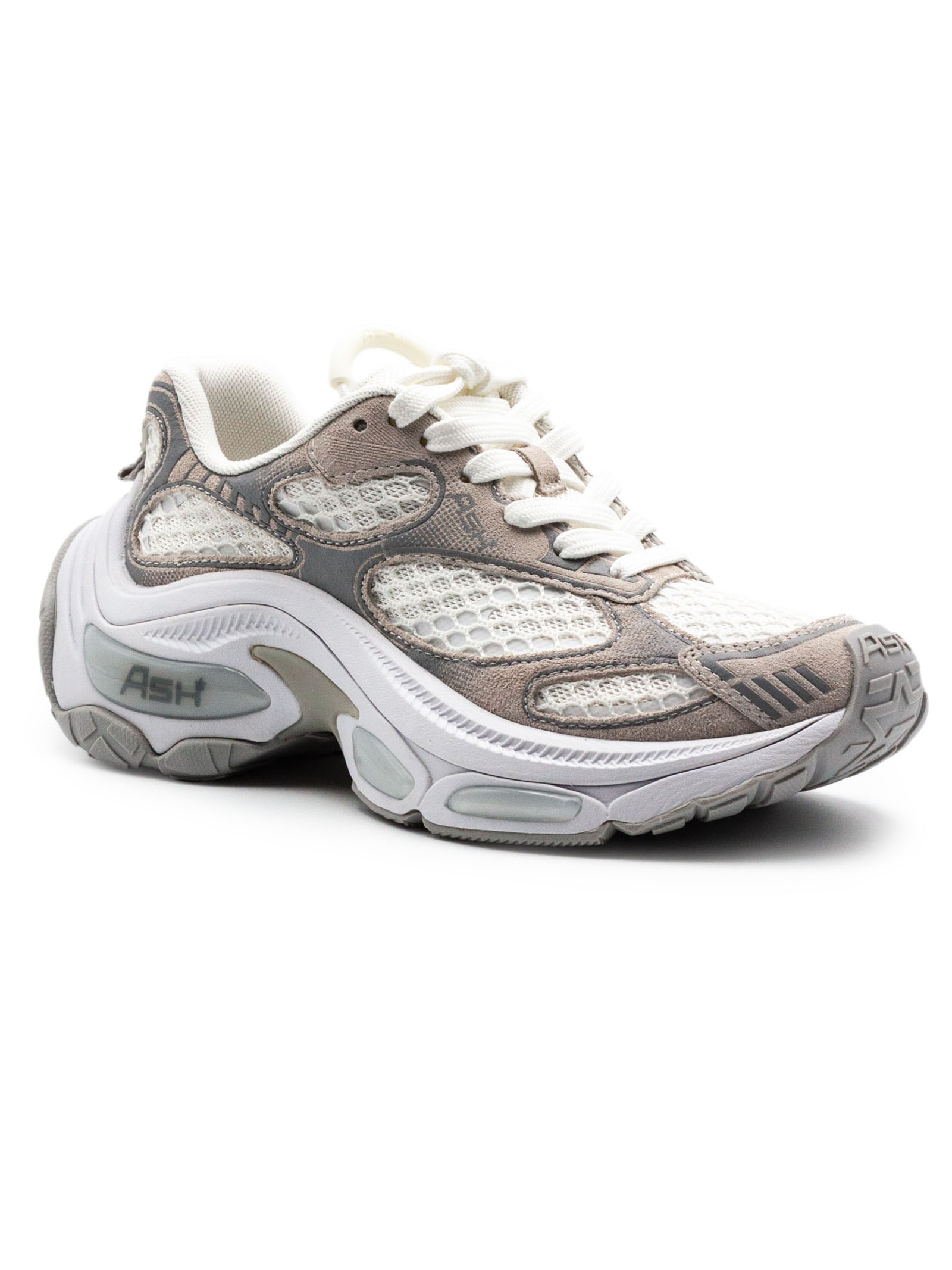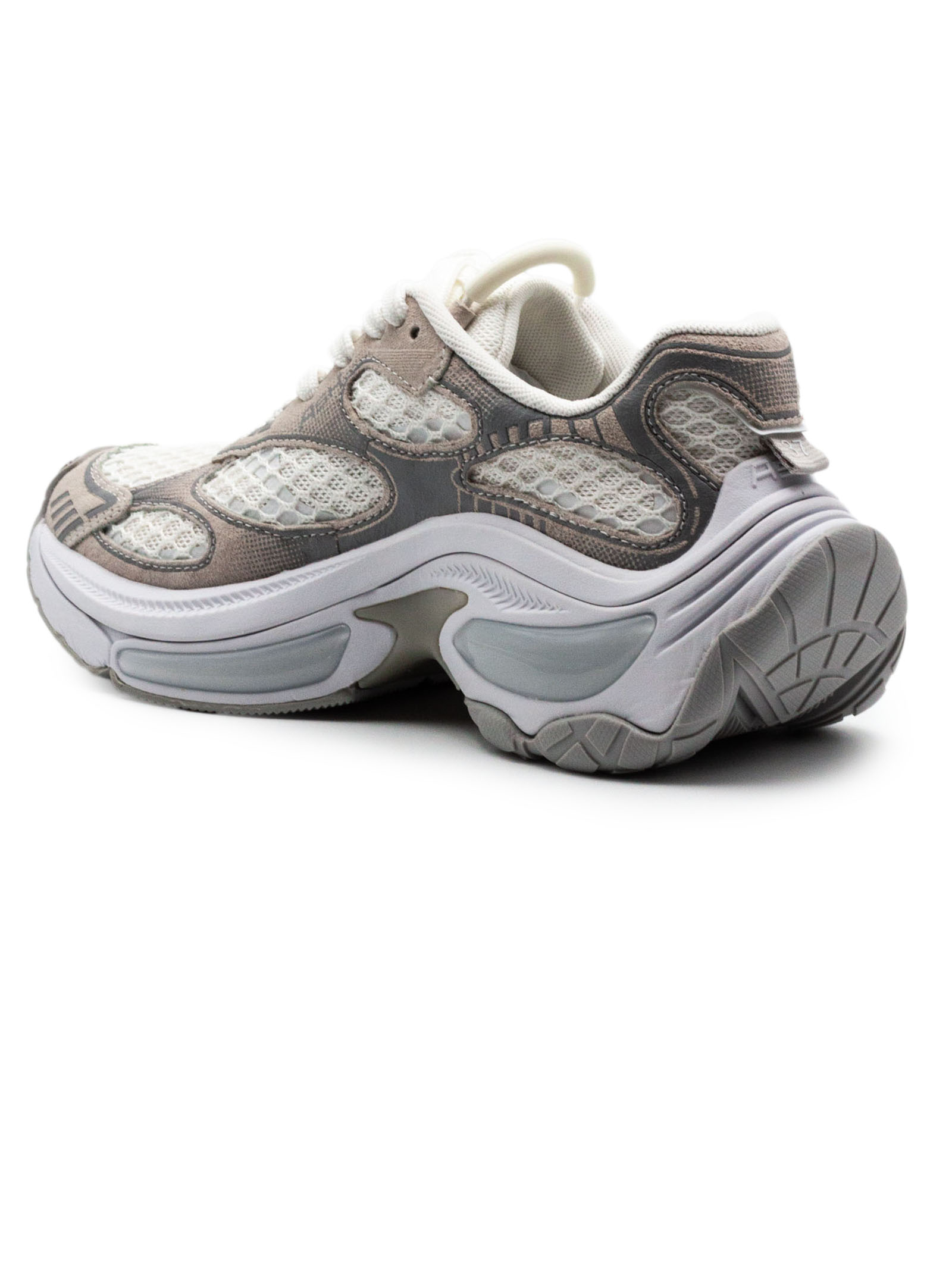 Sneakers Dragon in mesh traspirante e materiali tecnici, colore bianco e grigio, inserti a contrasto, chiusura con lacci, suola chunky ammortizzata