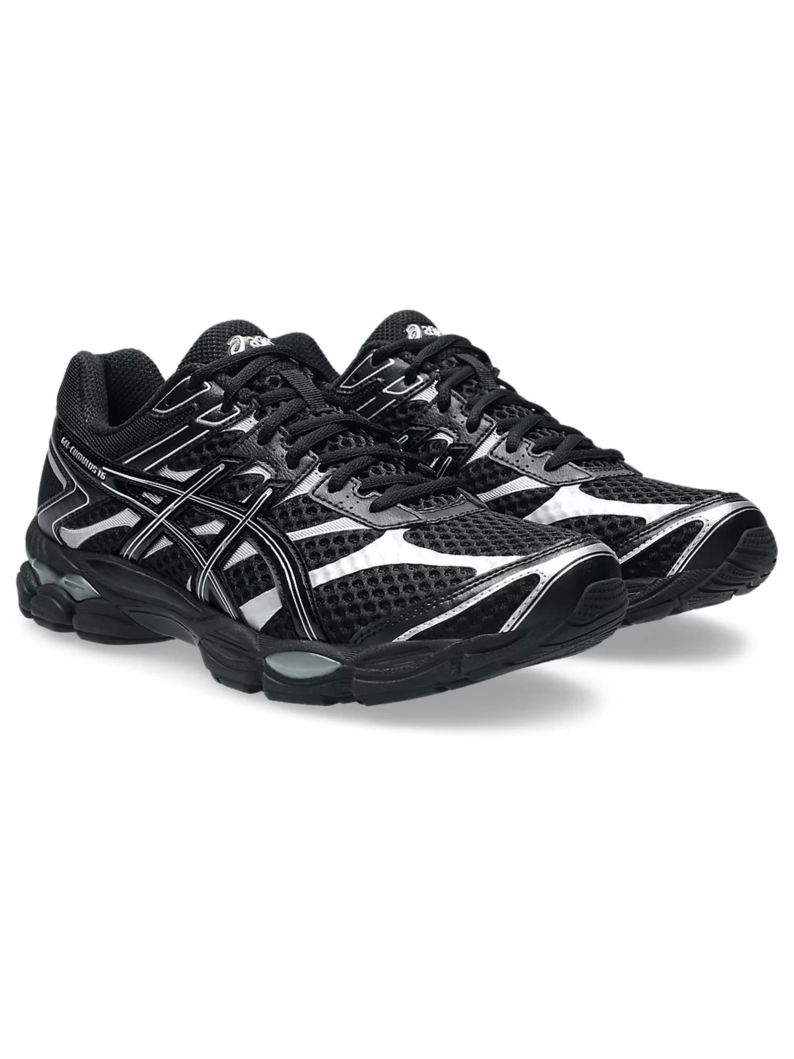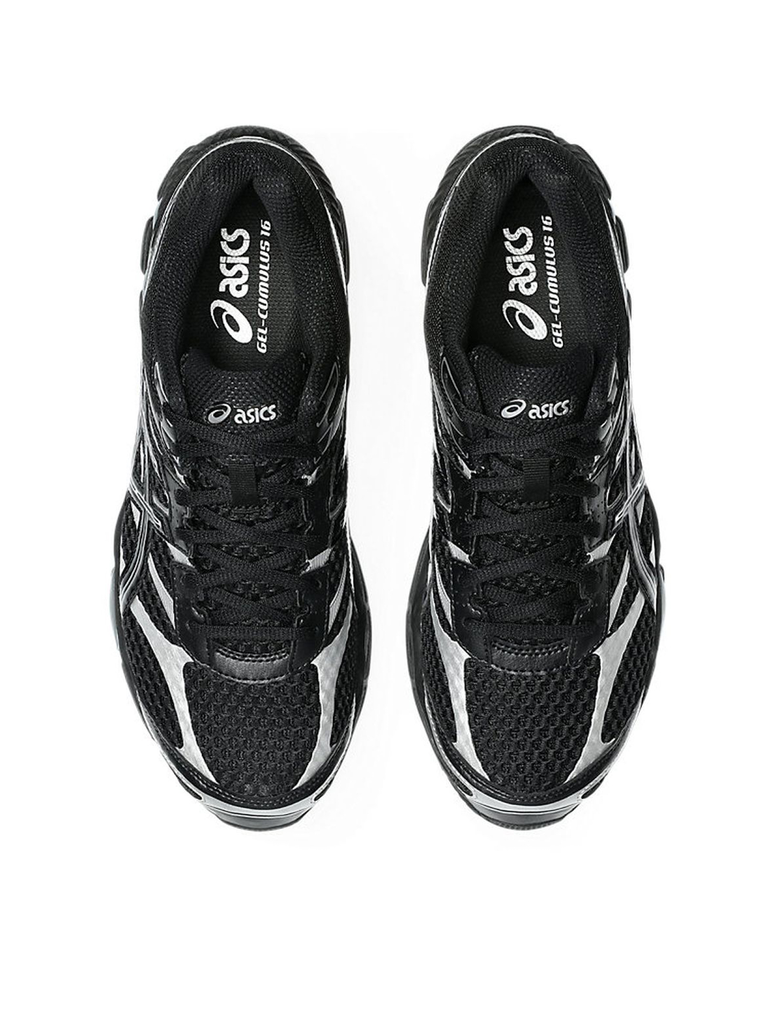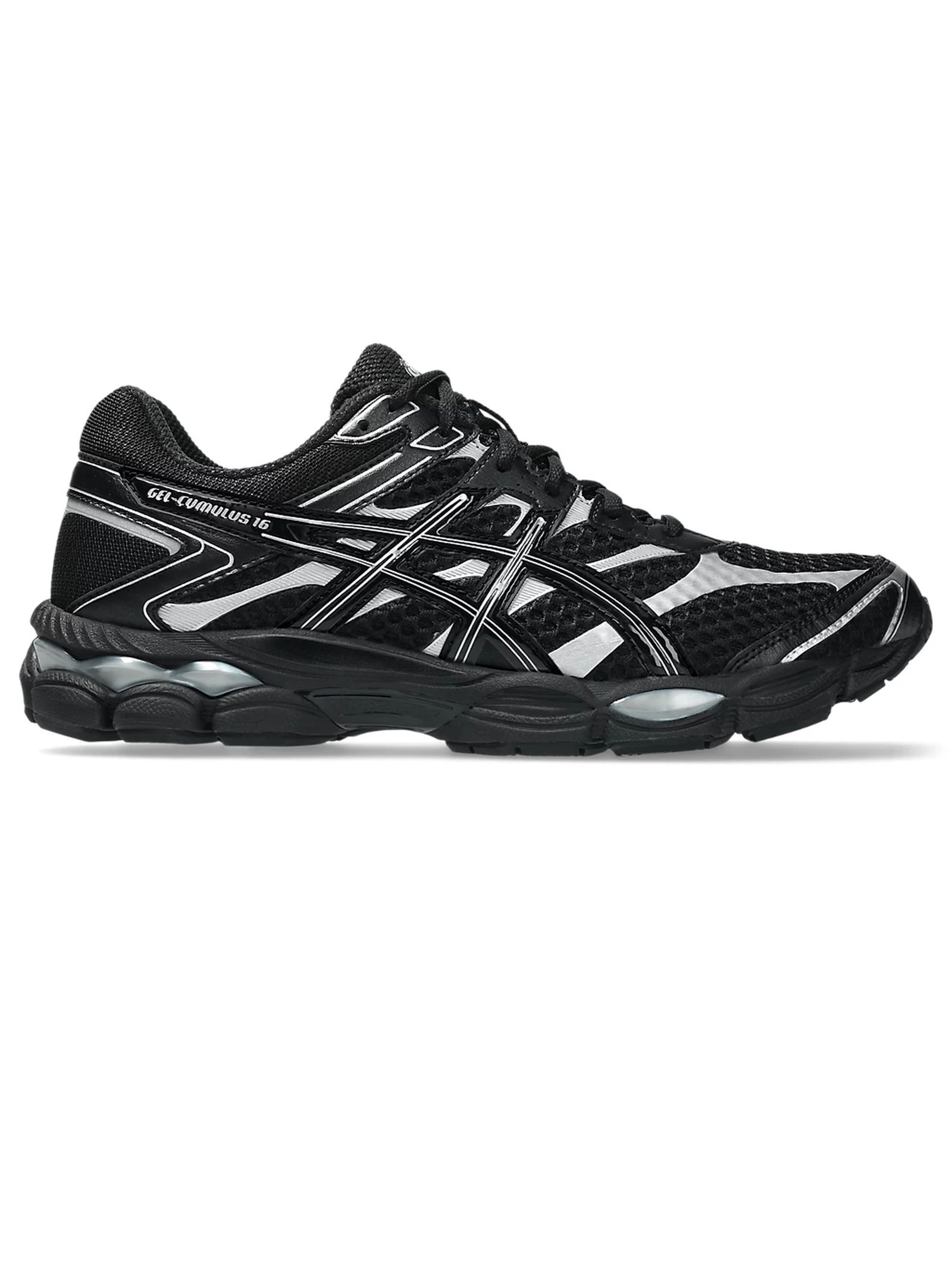 Sneakers GEL-CUMULUS 16 nero, dettaglio logo, chiusura con lacci, suola in rilievo
