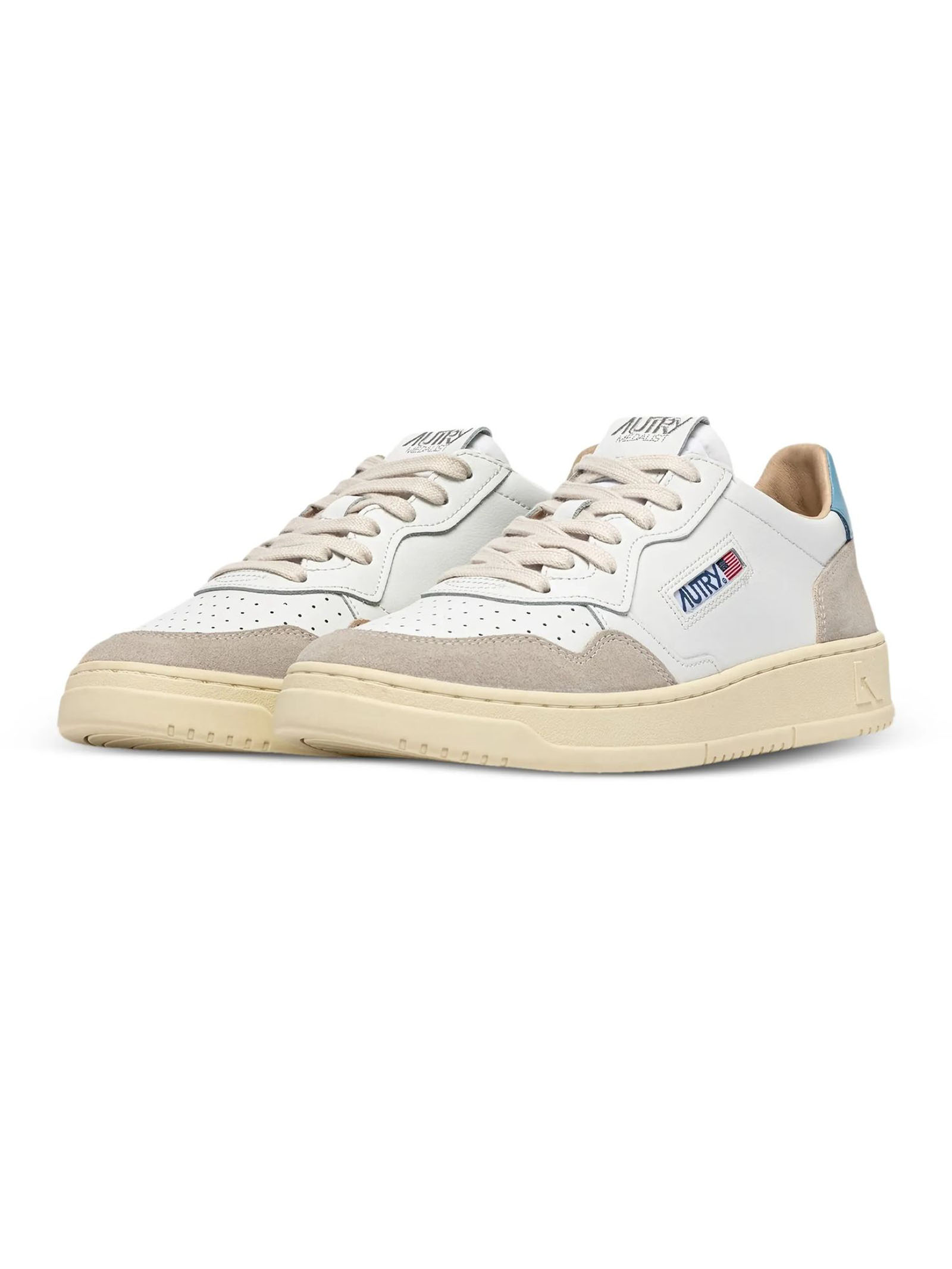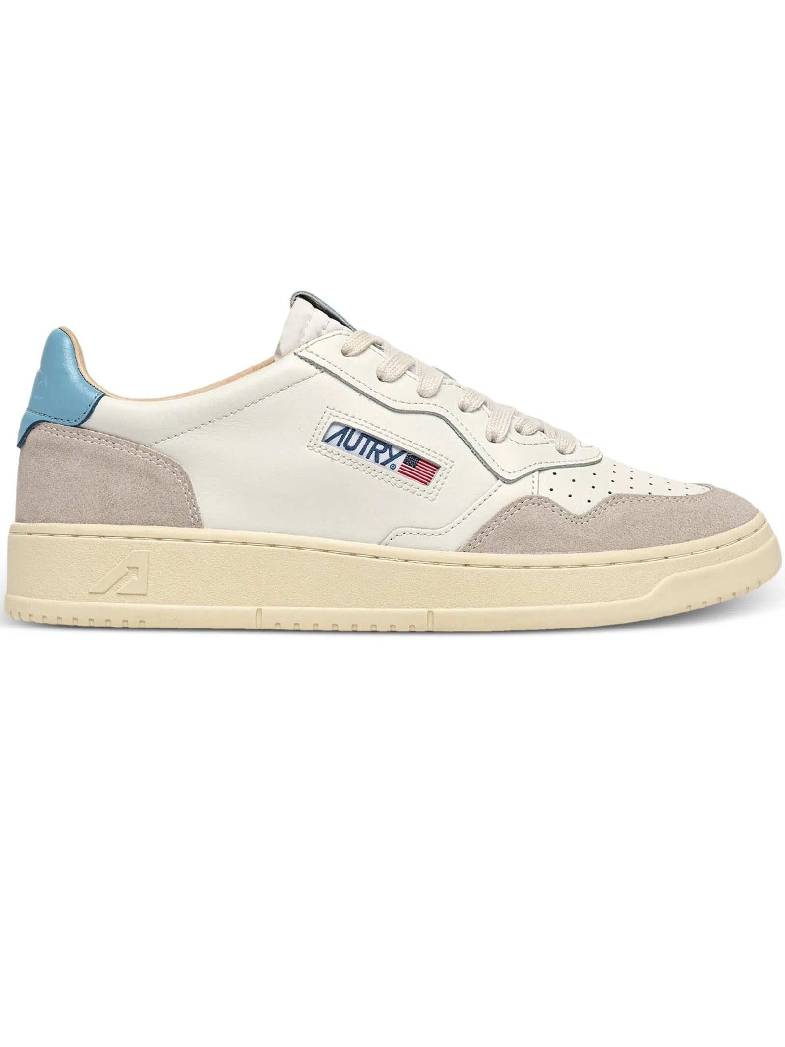 Sneakers Medalist Low In Pelle Bianca E Azzurra, Punta con microfori, Lacci piatti in cotone, Label con ricamo cucita sulla linguetta, Colletto imbottito, Fodera in pelle e spugna di cotone, Soletta in pelle rialzata di 2 cm, Suola in gomma, Altezza suola: 2,5-3,5 cm, Tomaia: 100% pelle bovina, Fodera: 40% pelle di maiale; 50% spugna; 10% nylon, Suola: 100% gomma