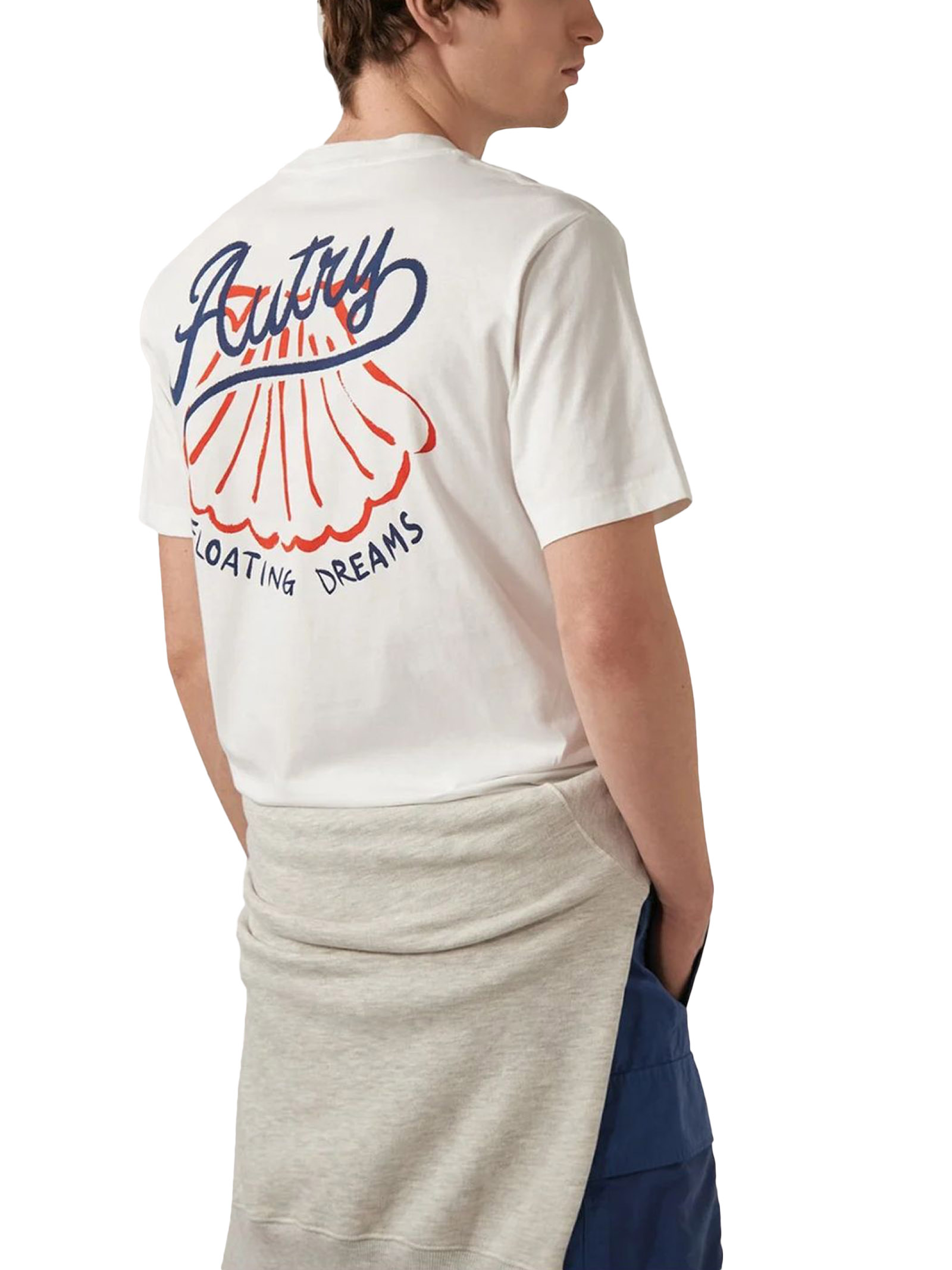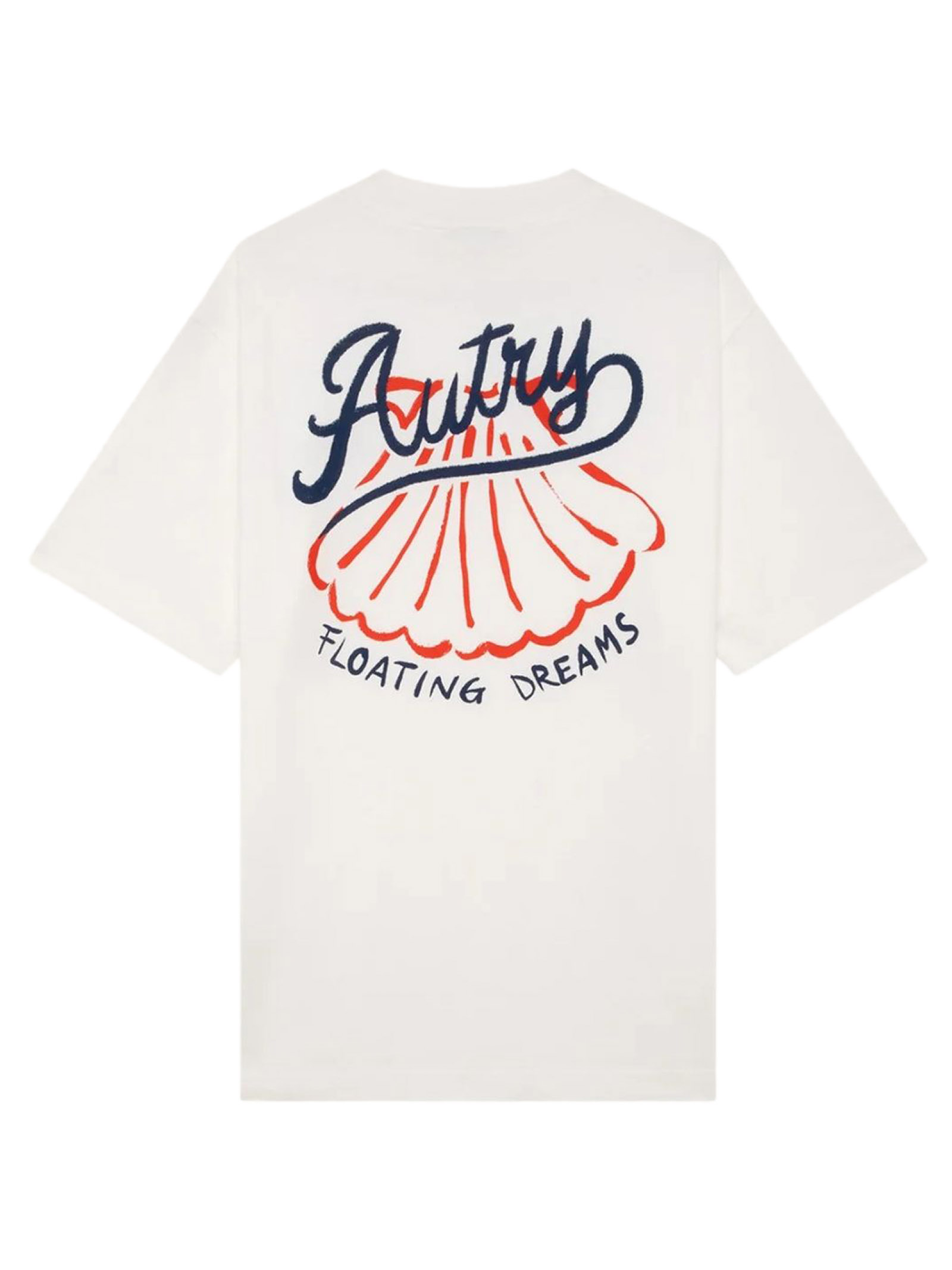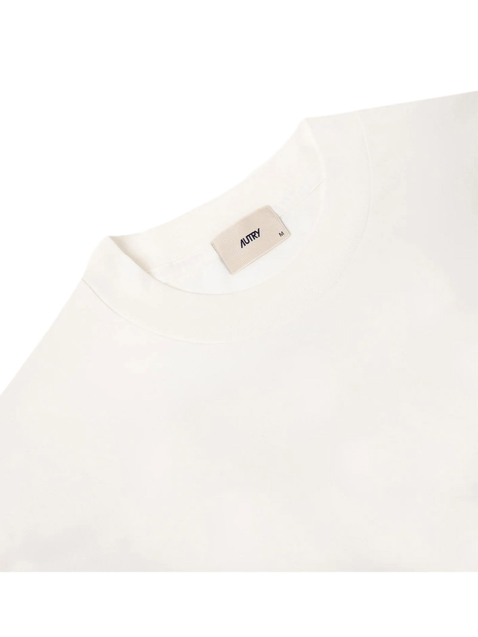 T-shirt in cotone bianco con girocollo, collo a coste, nastro di rinforzo da spalla a spalla, stampa ad acqua del logo sul davanti, stampa ad acqua shell sul retro, loose fit