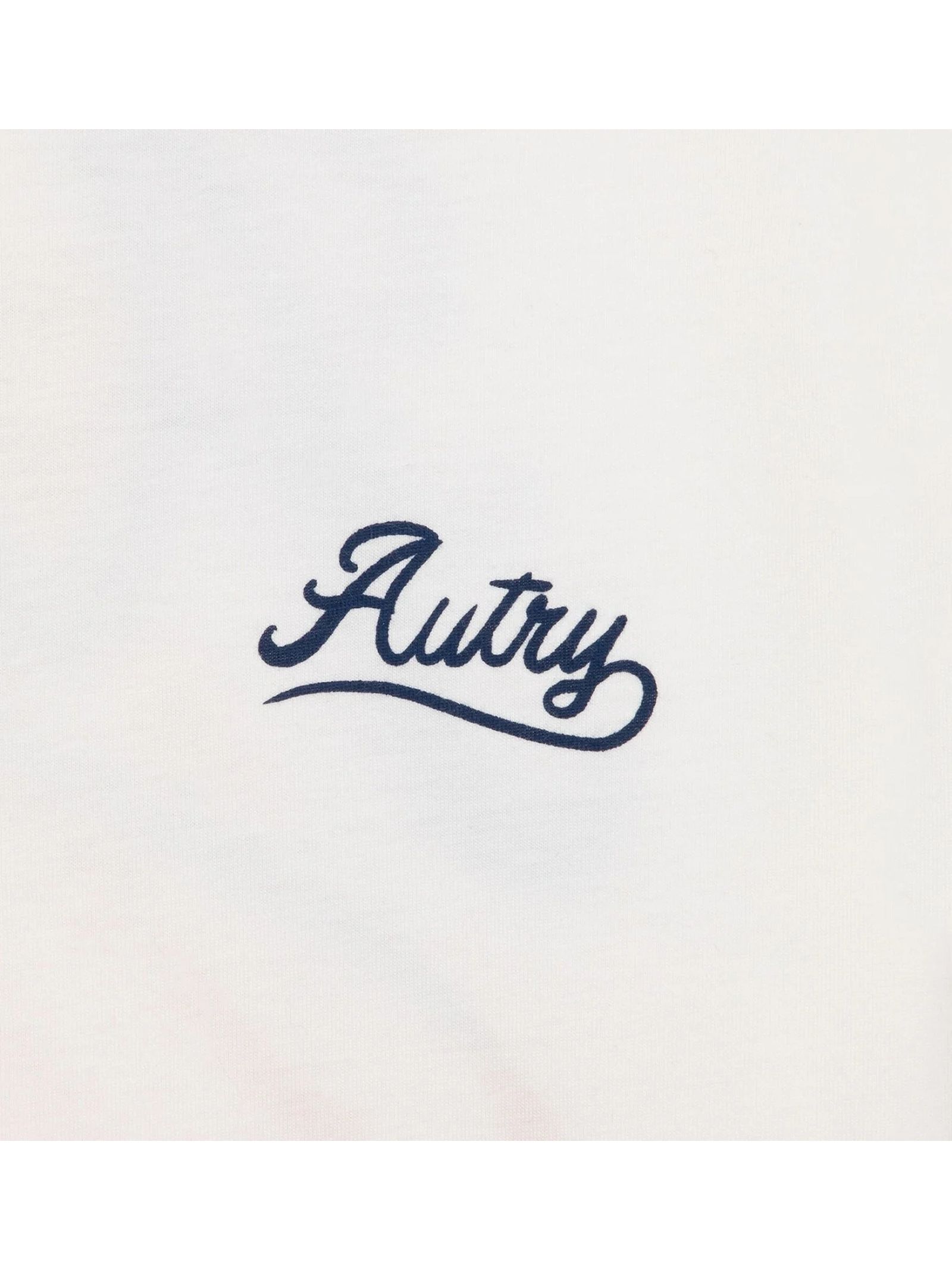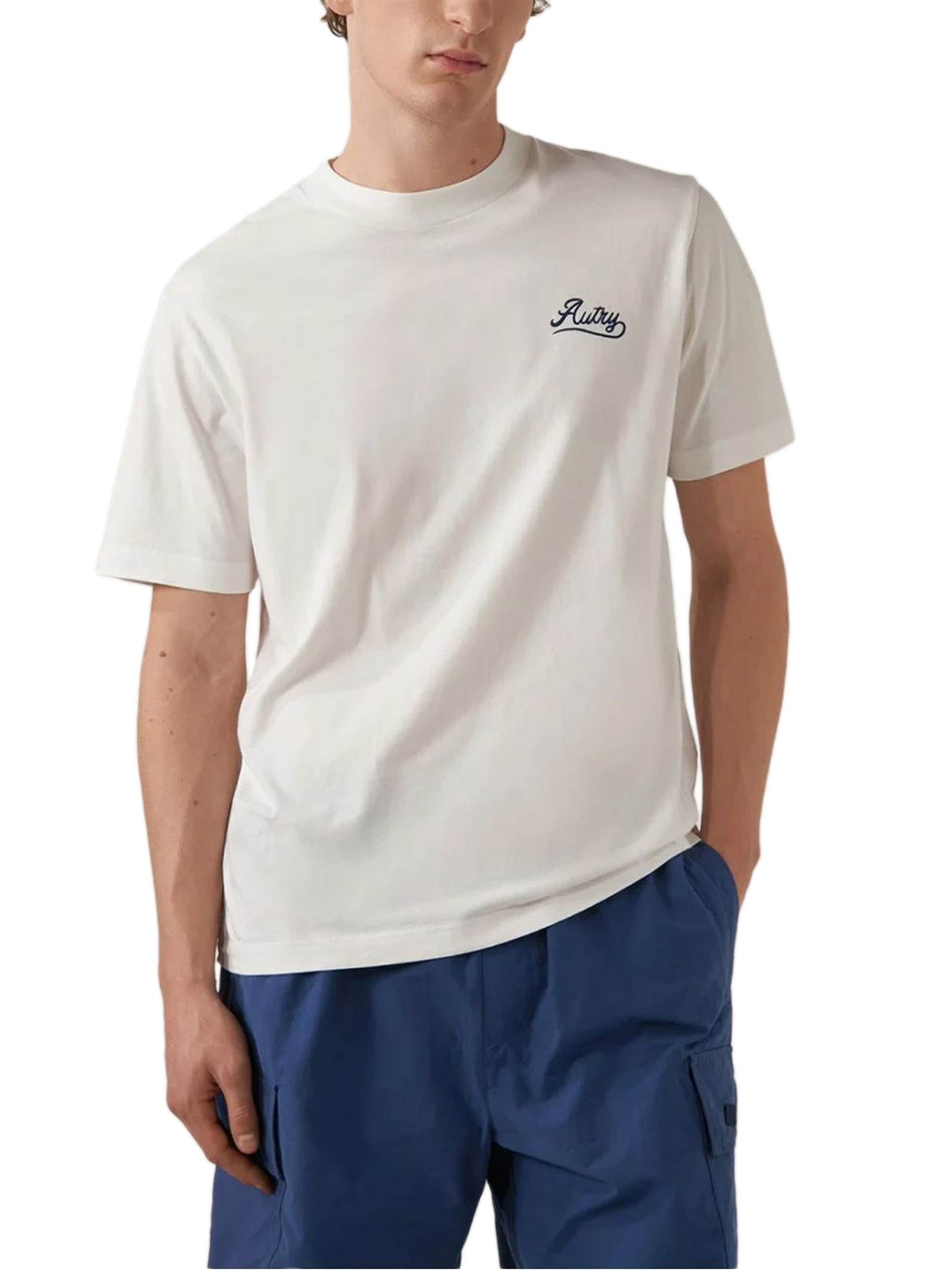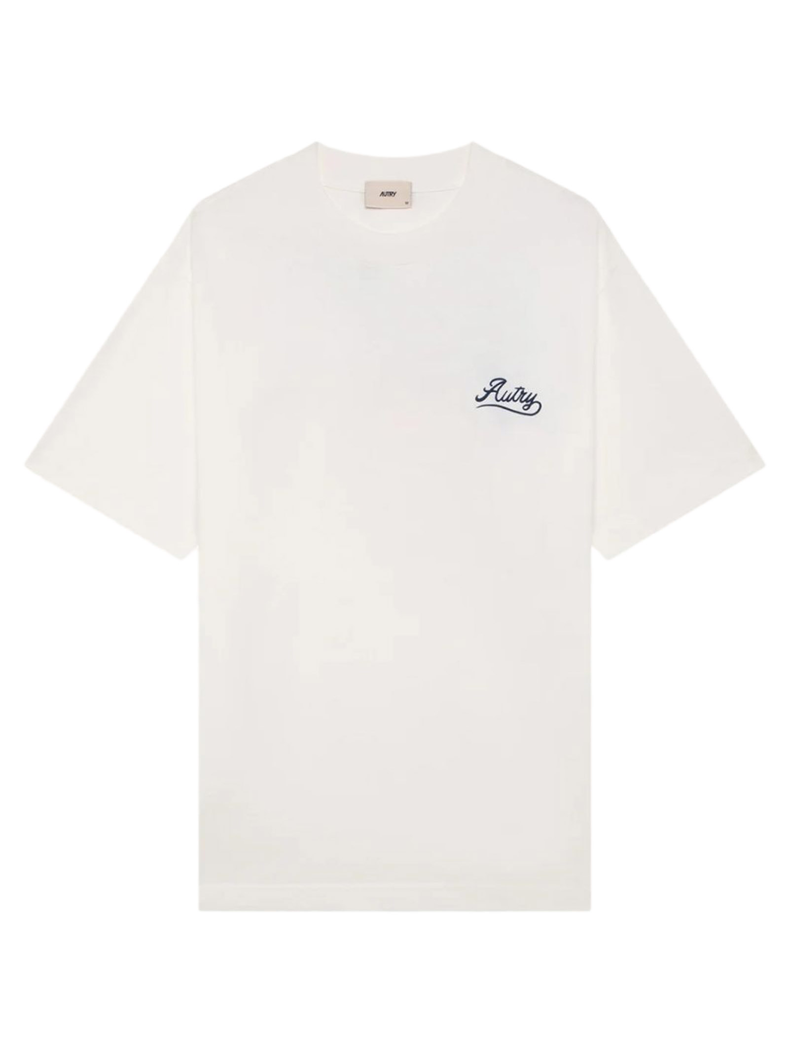 T-shirt in cotone bianco con girocollo, collo a coste, nastro di rinforzo da spalla a spalla, stampa ad acqua del logo sul davanti, stampa ad acqua shell sul retro, loose fit
