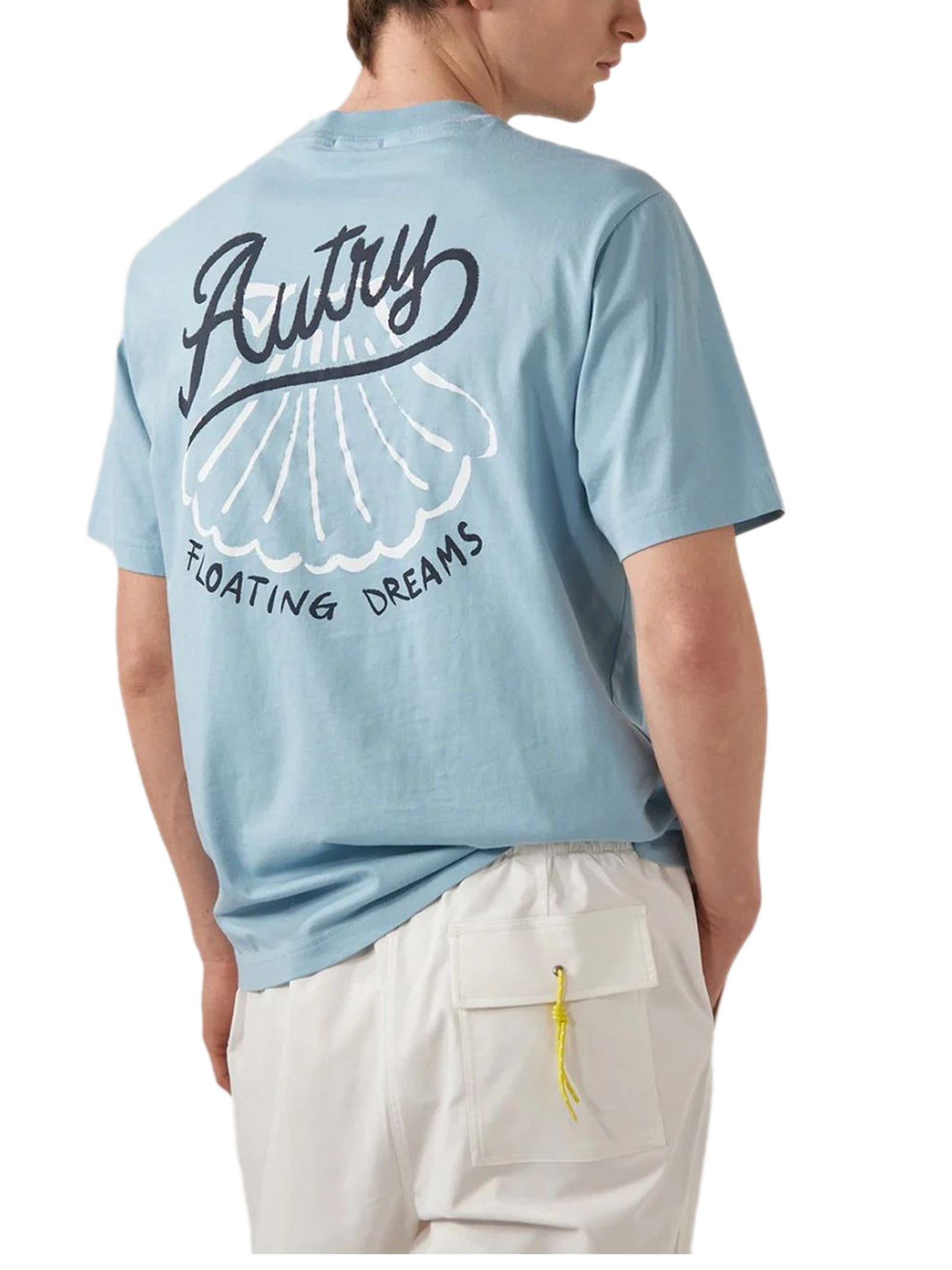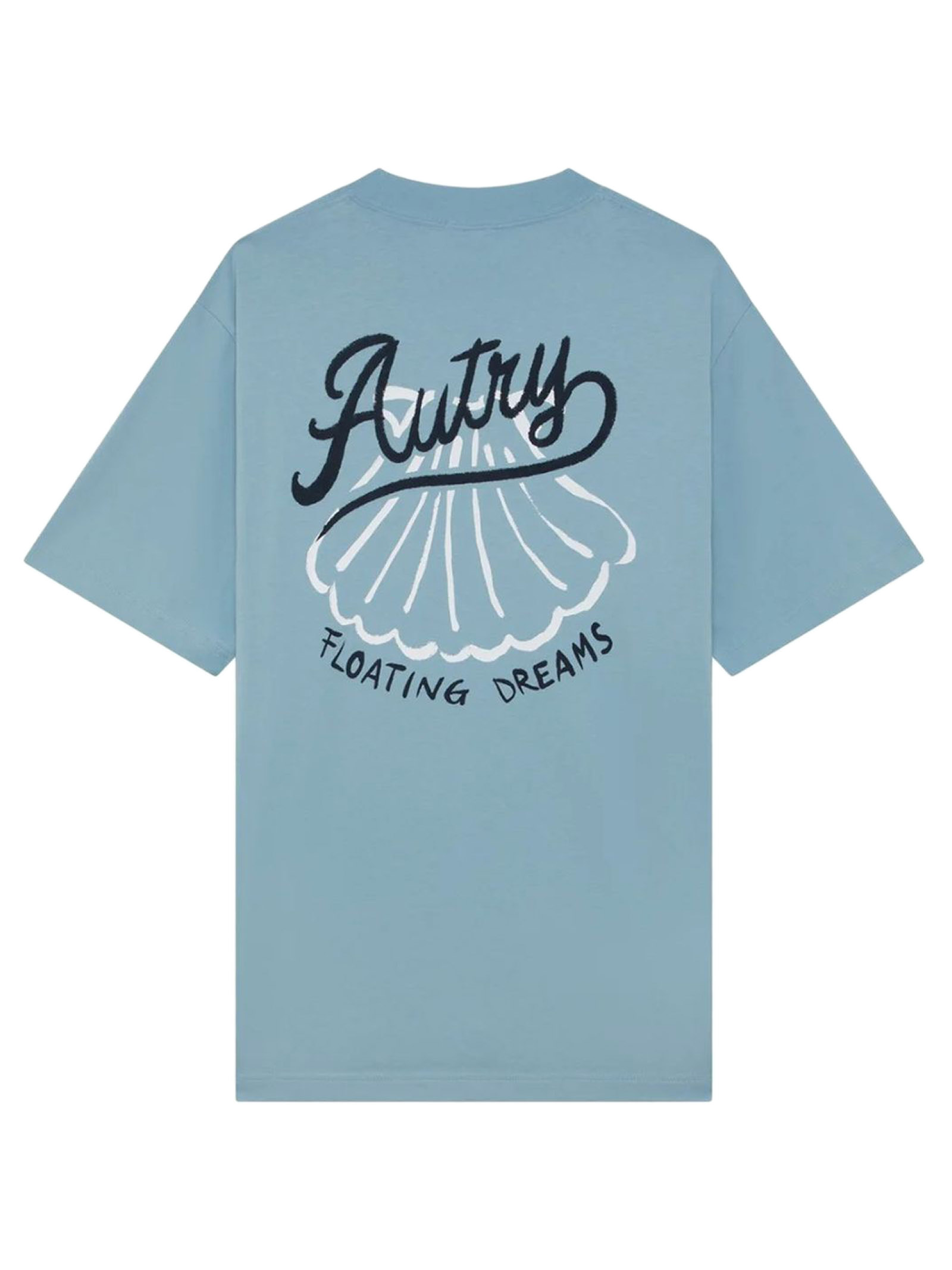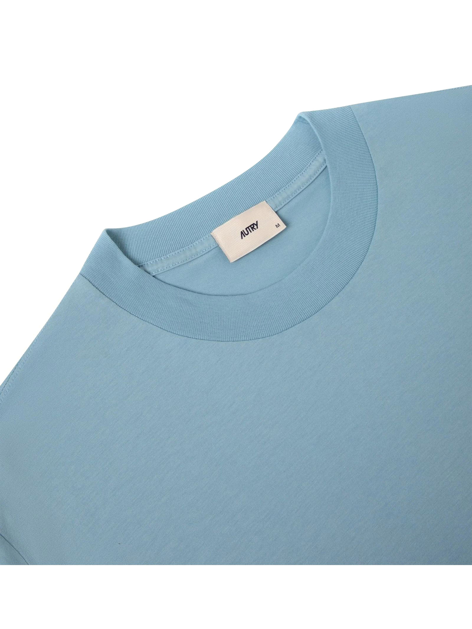 T-shirt in cotone blu chiaro con girocollo, collo a coste, nastro di rinforzo da spalla a spalla, stampa ad acqua del logo sul davanti, stampa ad acqua shell sul retro, loose fit