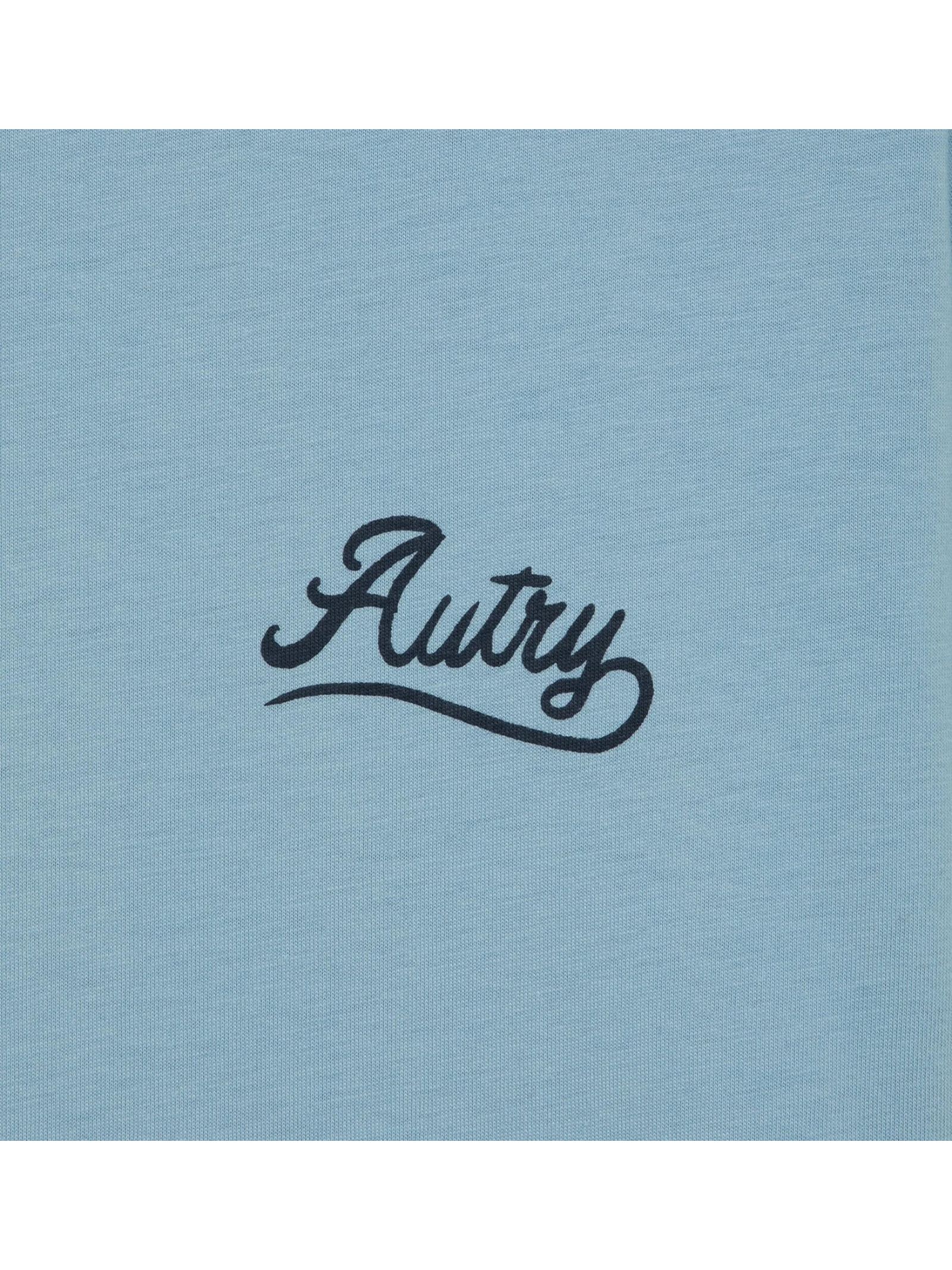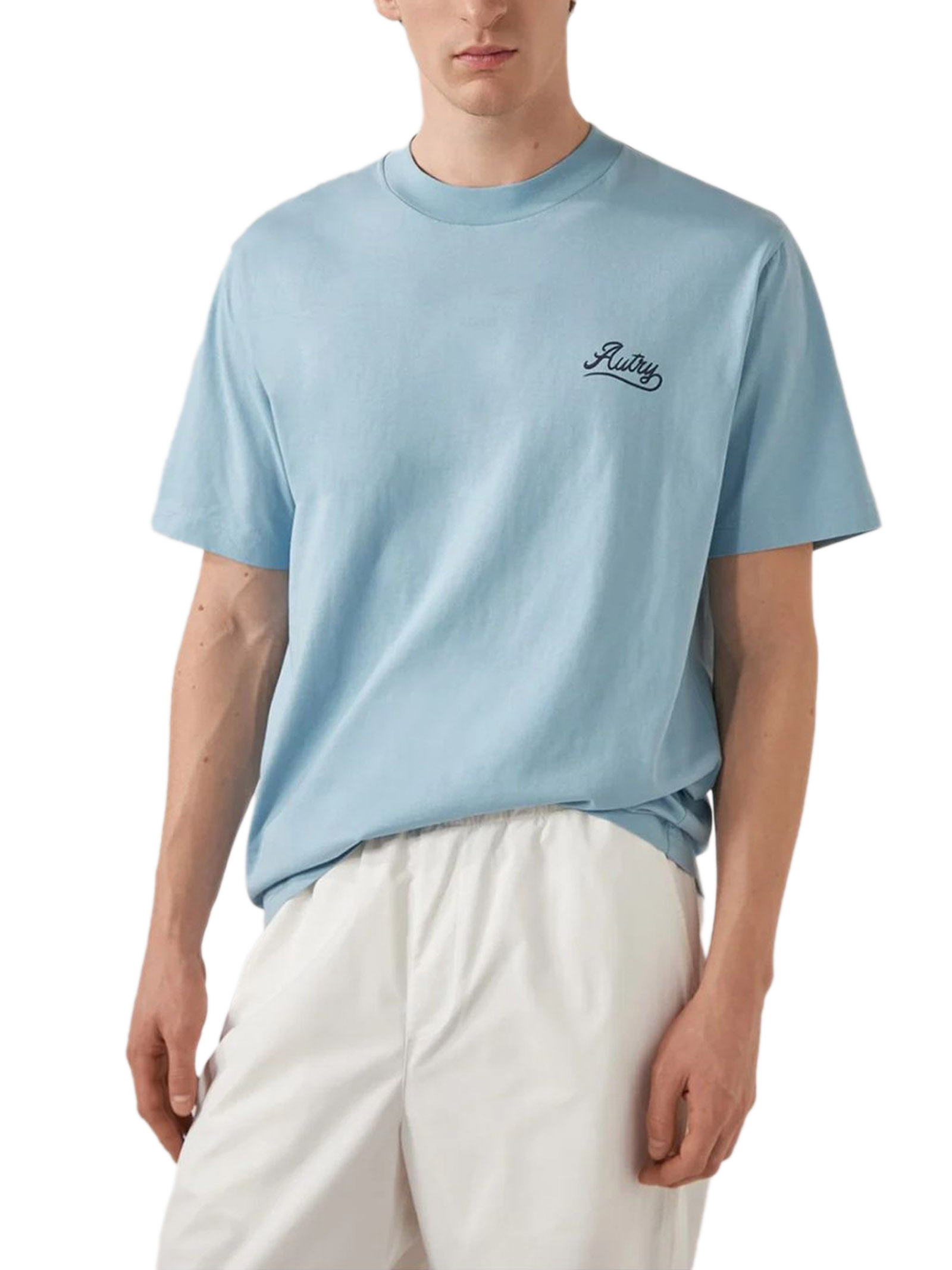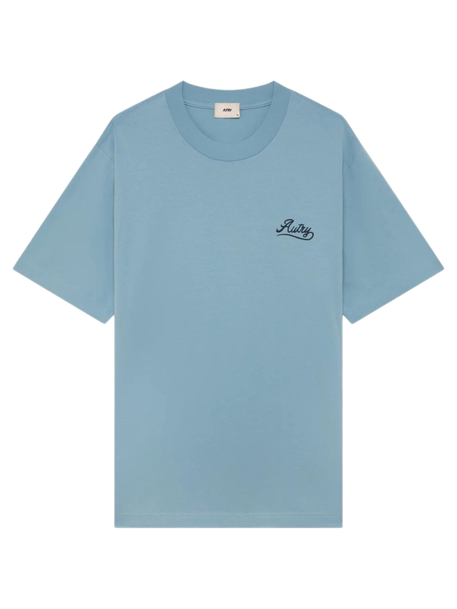T-shirt in cotone blu chiaro con girocollo, collo a coste, nastro di rinforzo da spalla a spalla, stampa ad acqua del logo sul davanti, stampa ad acqua shell sul retro, loose fit