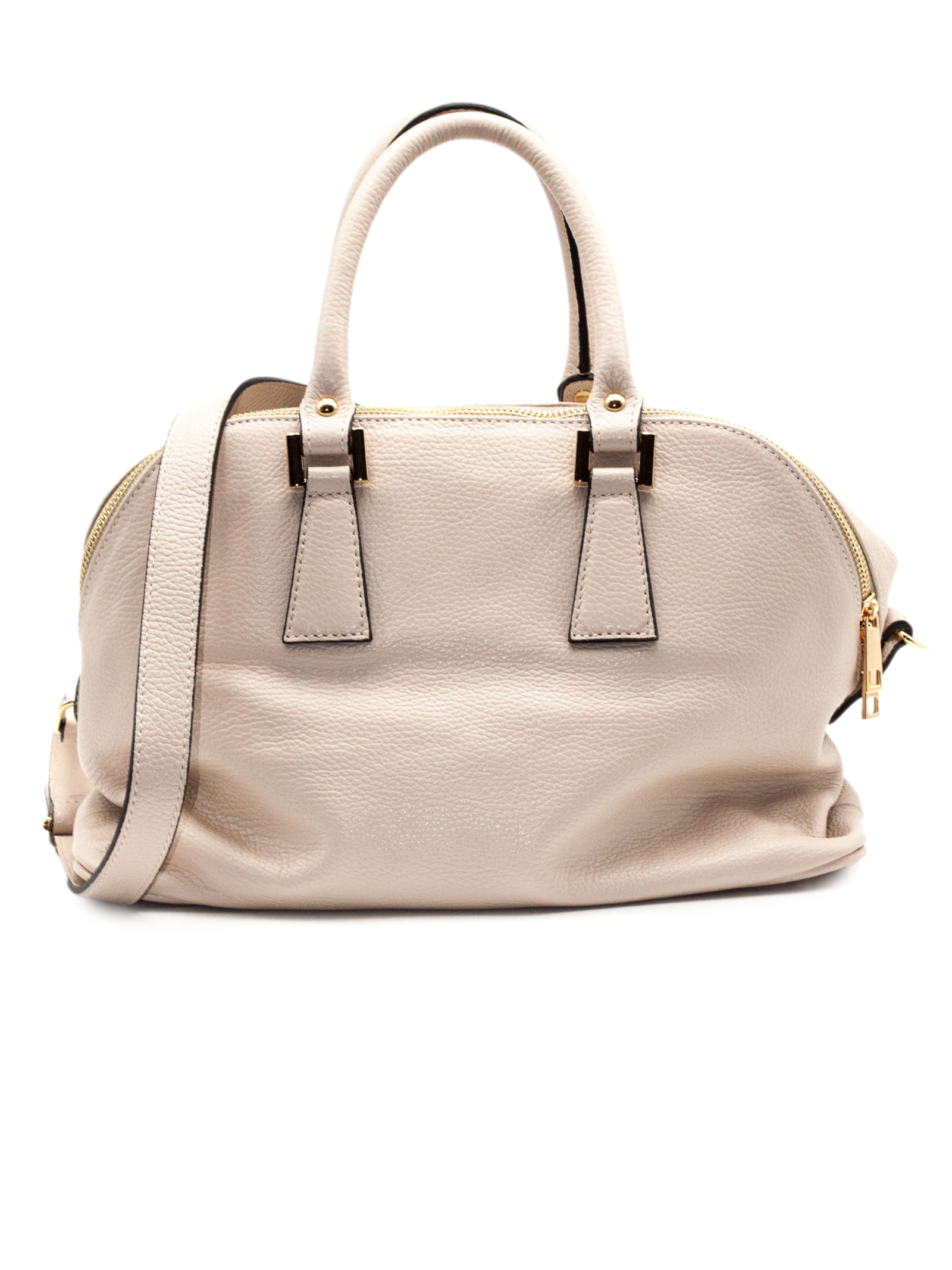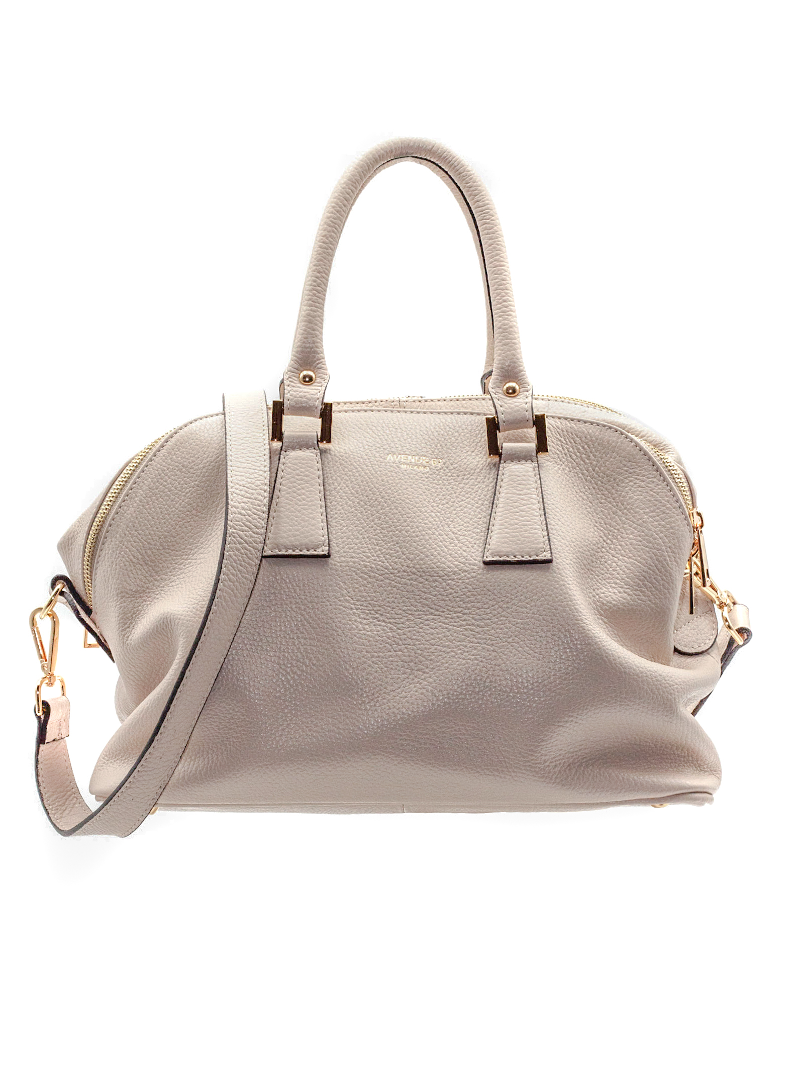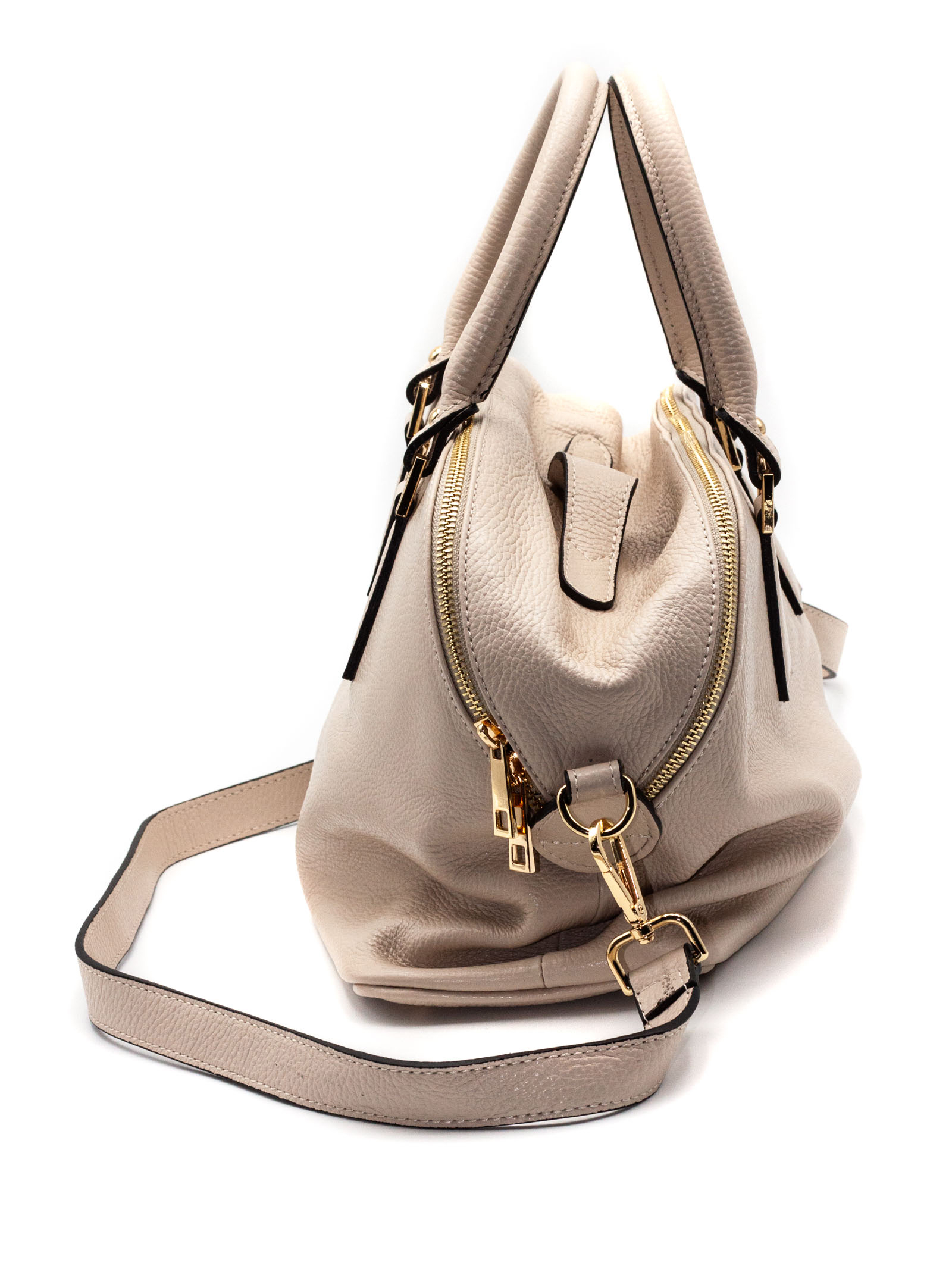 Borsa in pelle morbida martellata beige, doppio manico, doppia chiusura con zip, tasca interna con zip e doppia tasca portaoggetti con patella, unico vano interno, tracolla rimovibile e regolabile lunghezza massima 128 cm, L.35 A.24 P.14