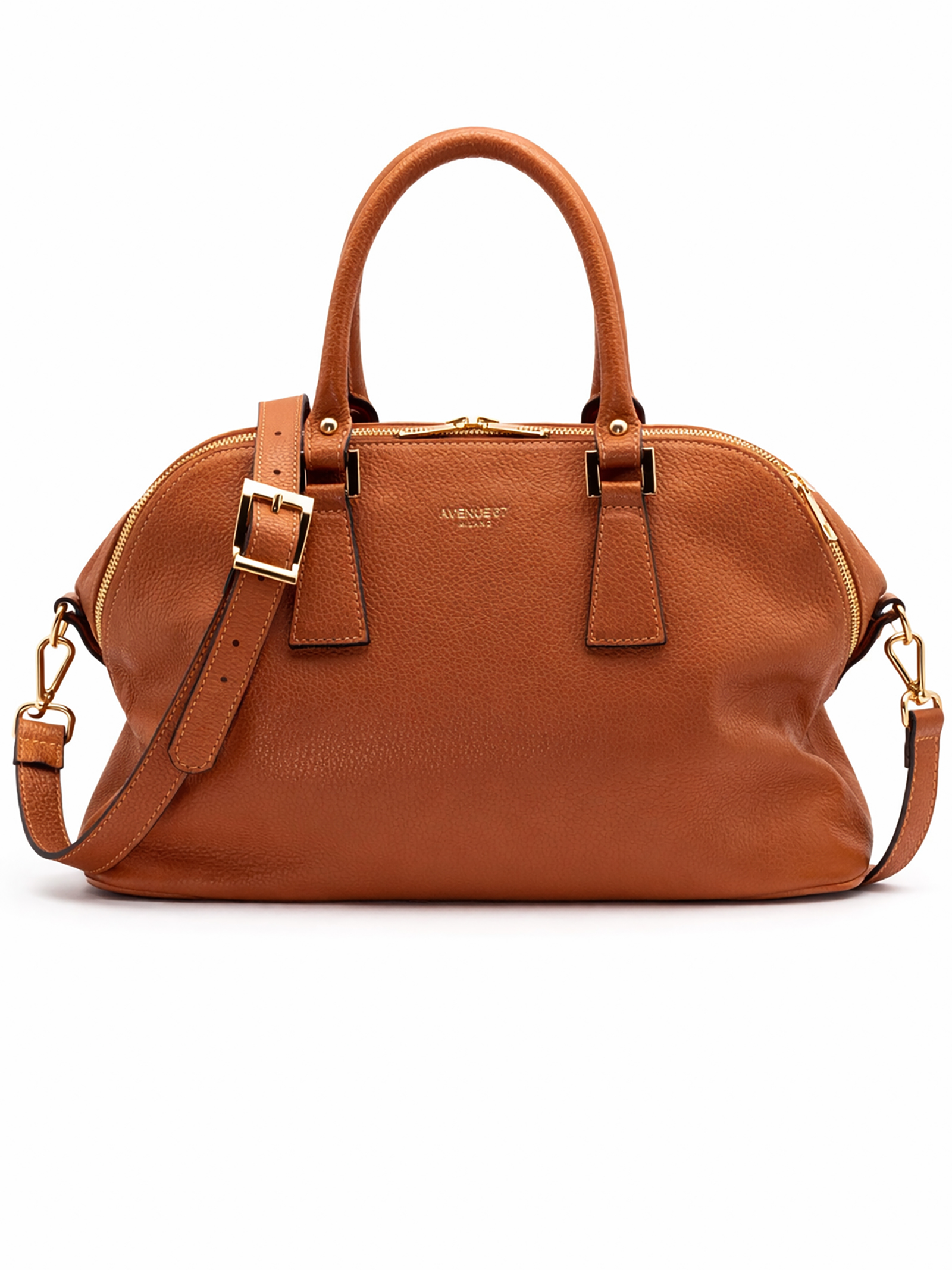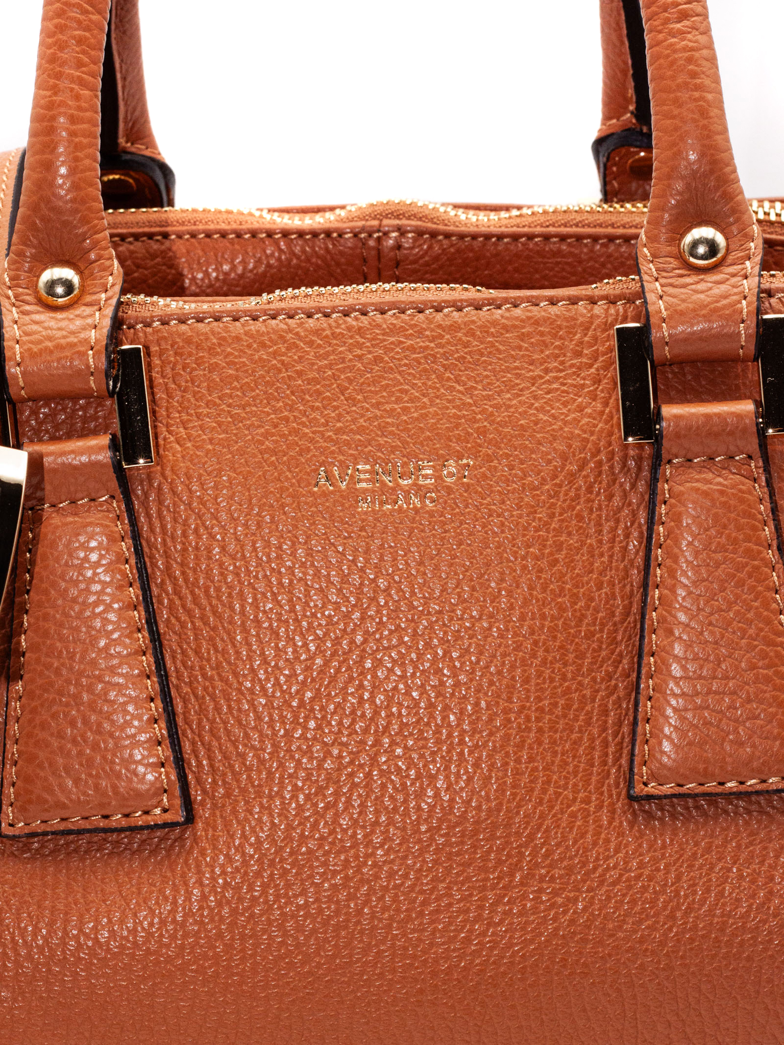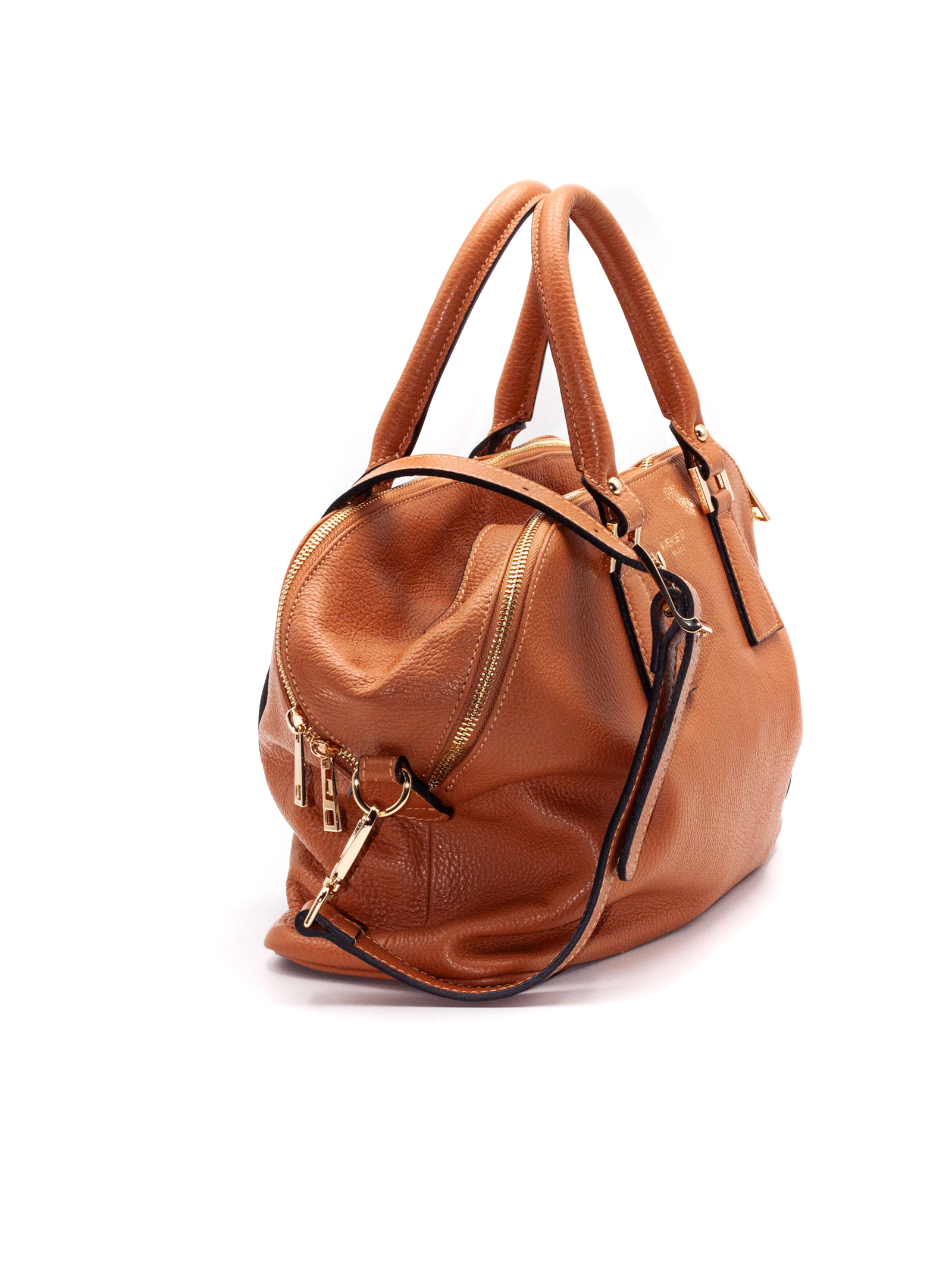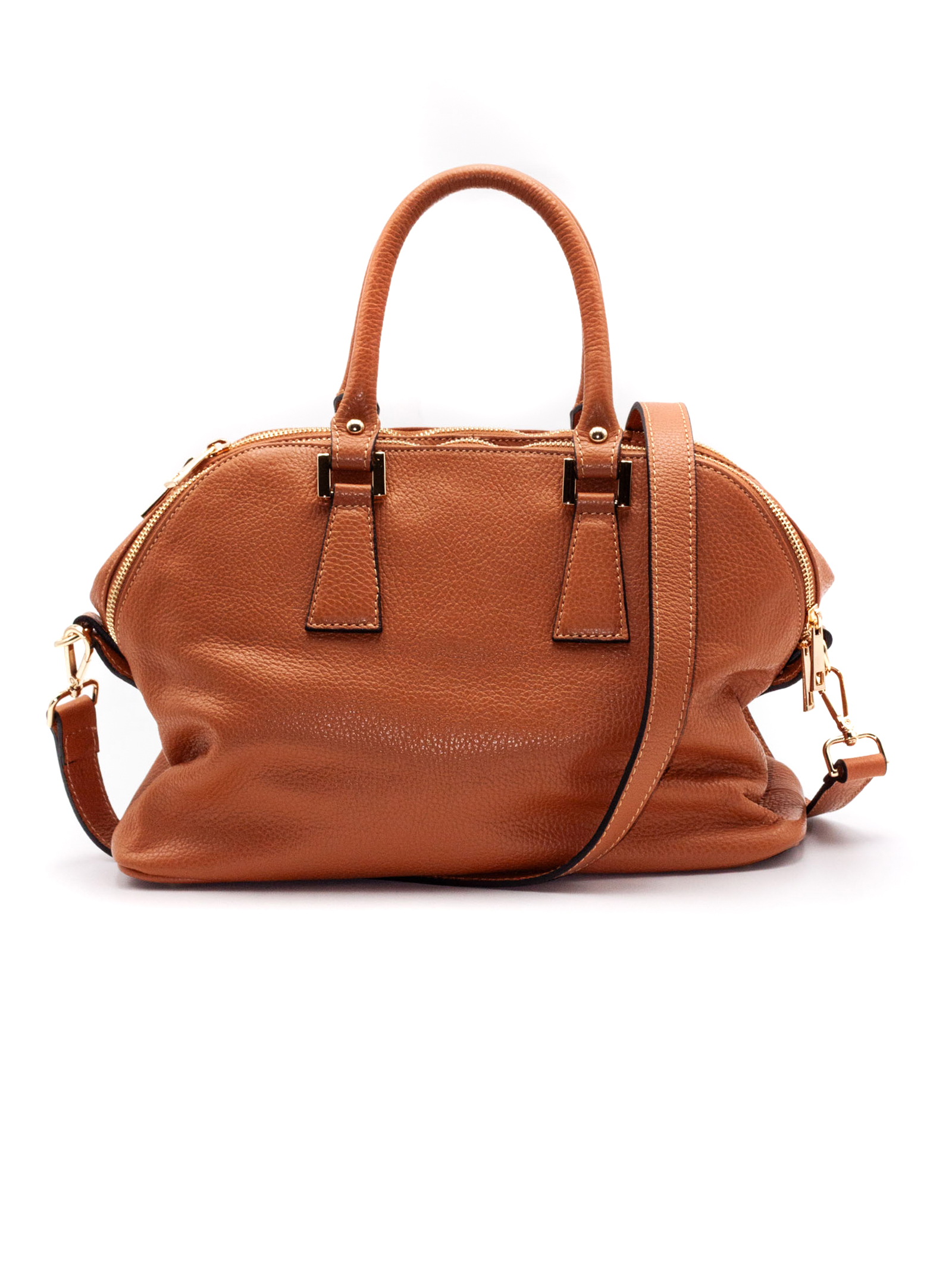 Borsa in pelle morbida martellata marrone, doppio manico, doppia chiusura con zip, tasca interna con zip e doppia tasca portaoggetti con patella, unico vano interno, tracolla rimovibile e regolabile lunghezza massima 128 cm, L.35 A.24 P.14