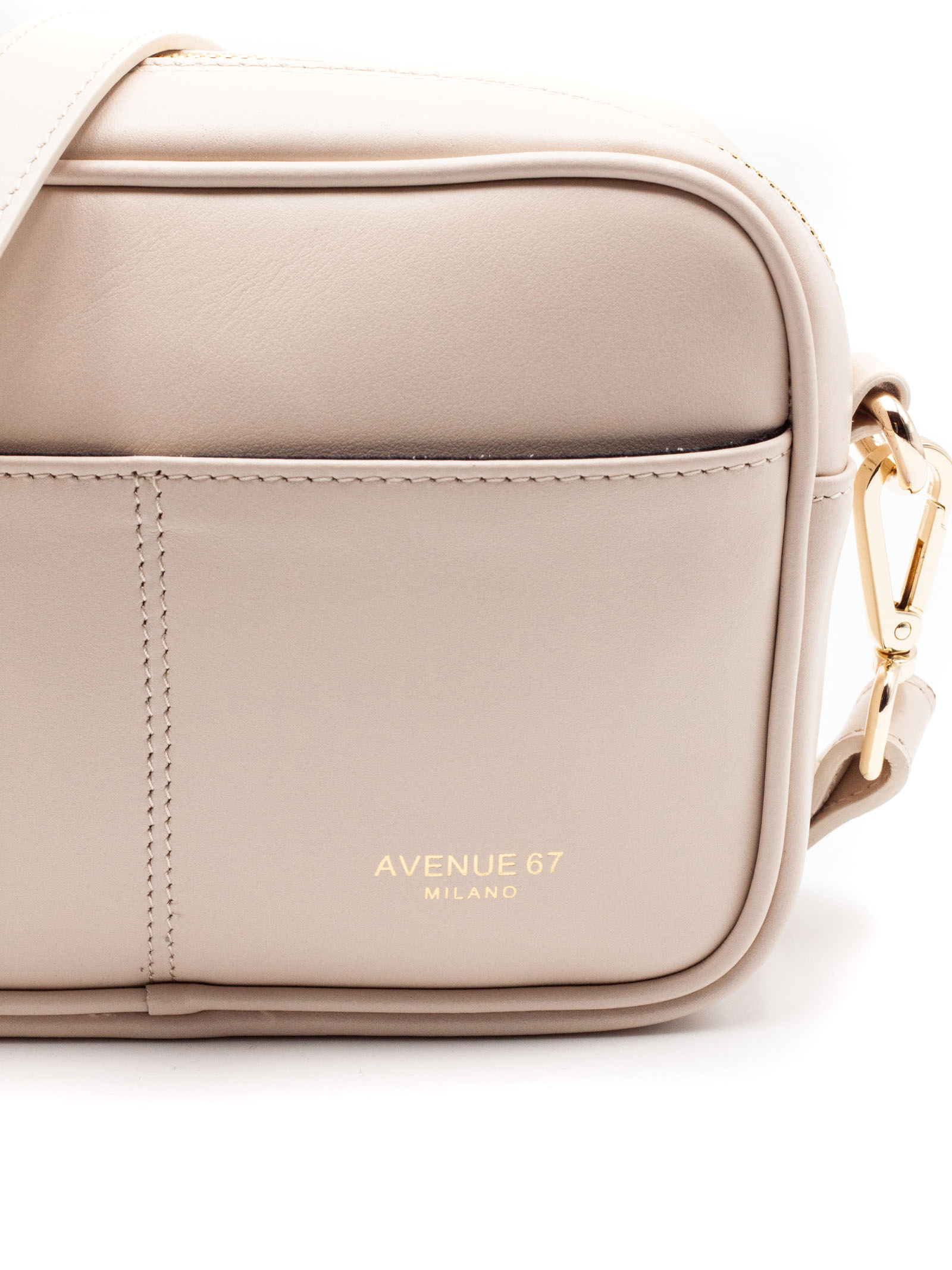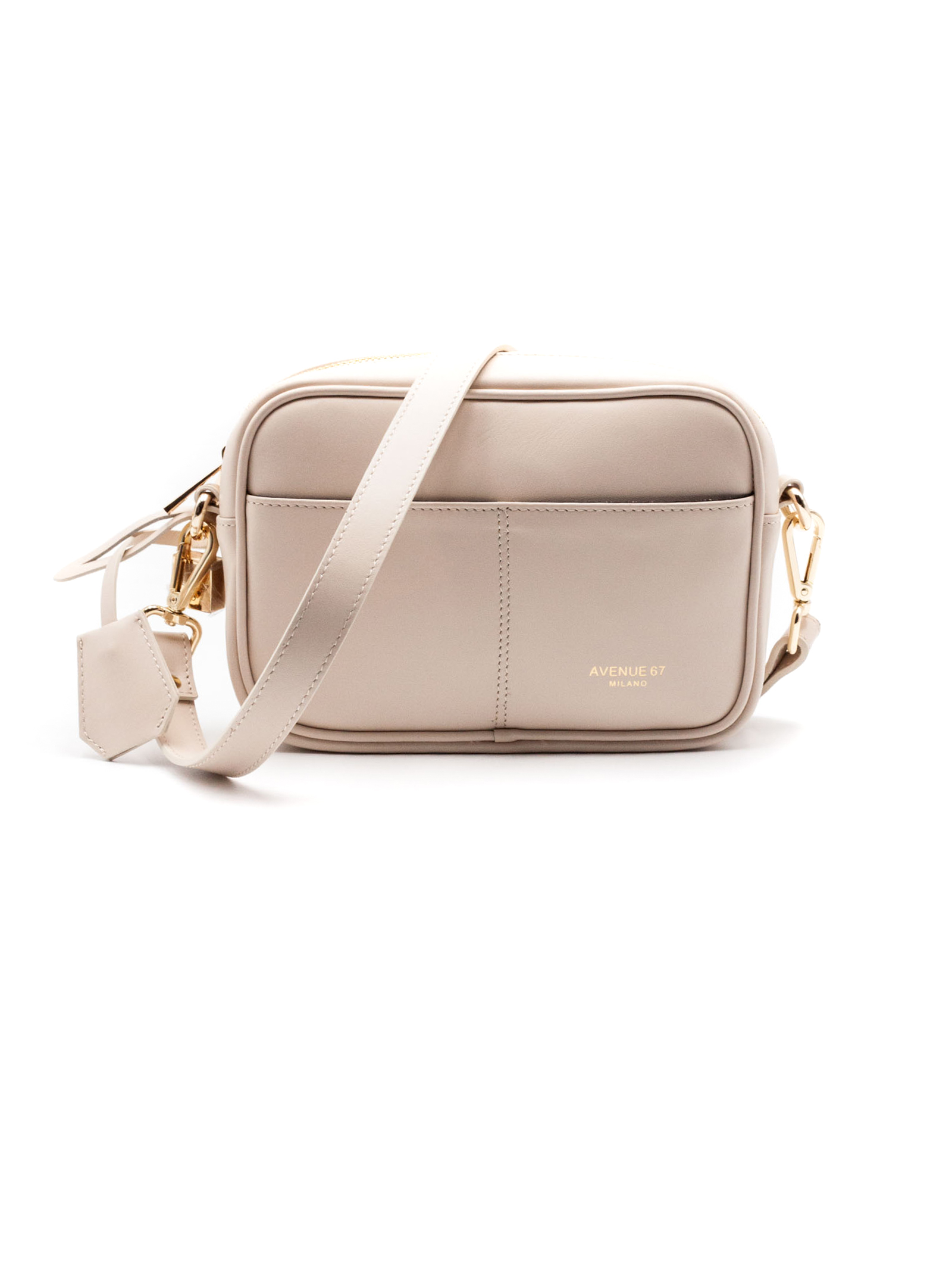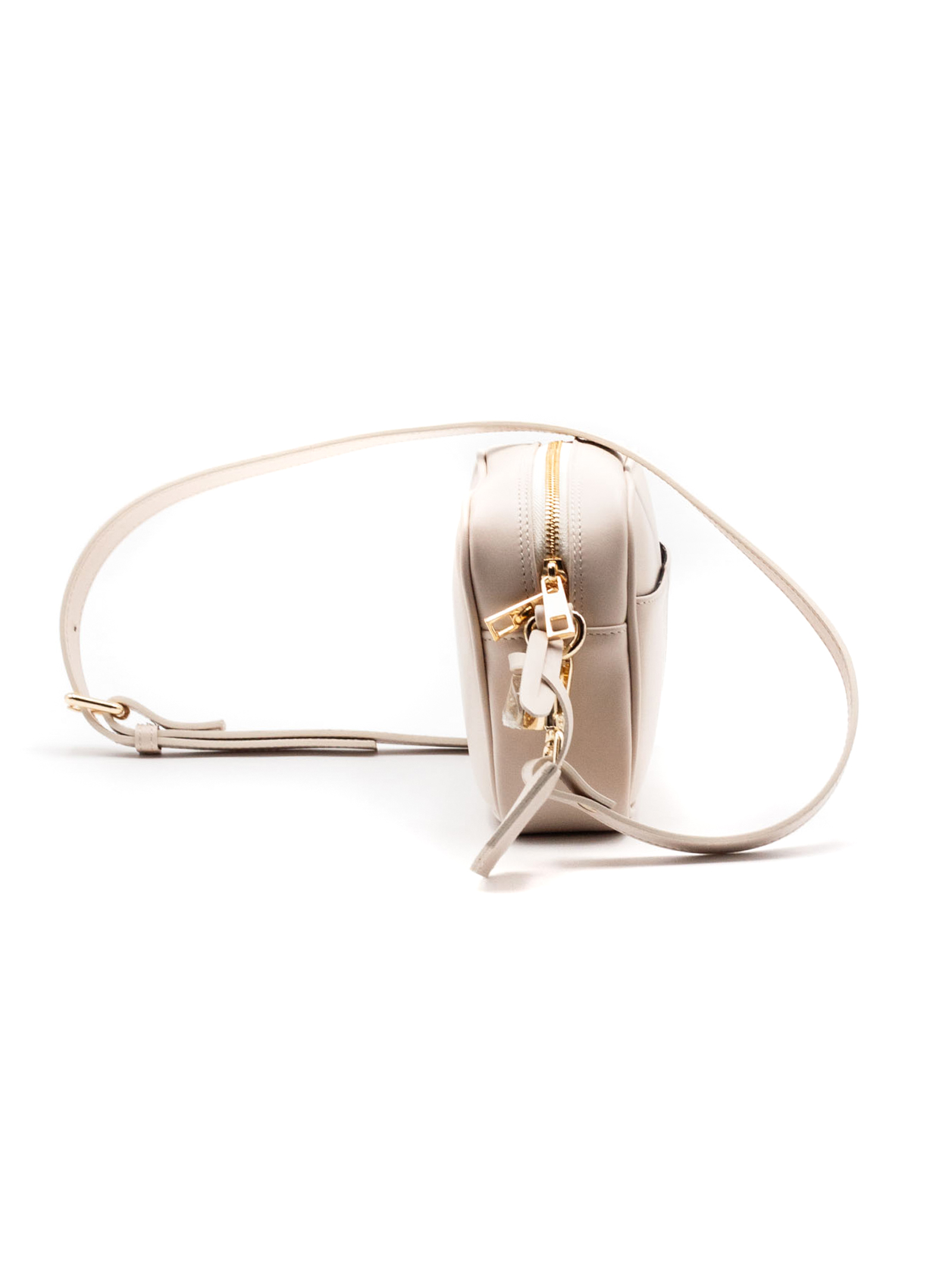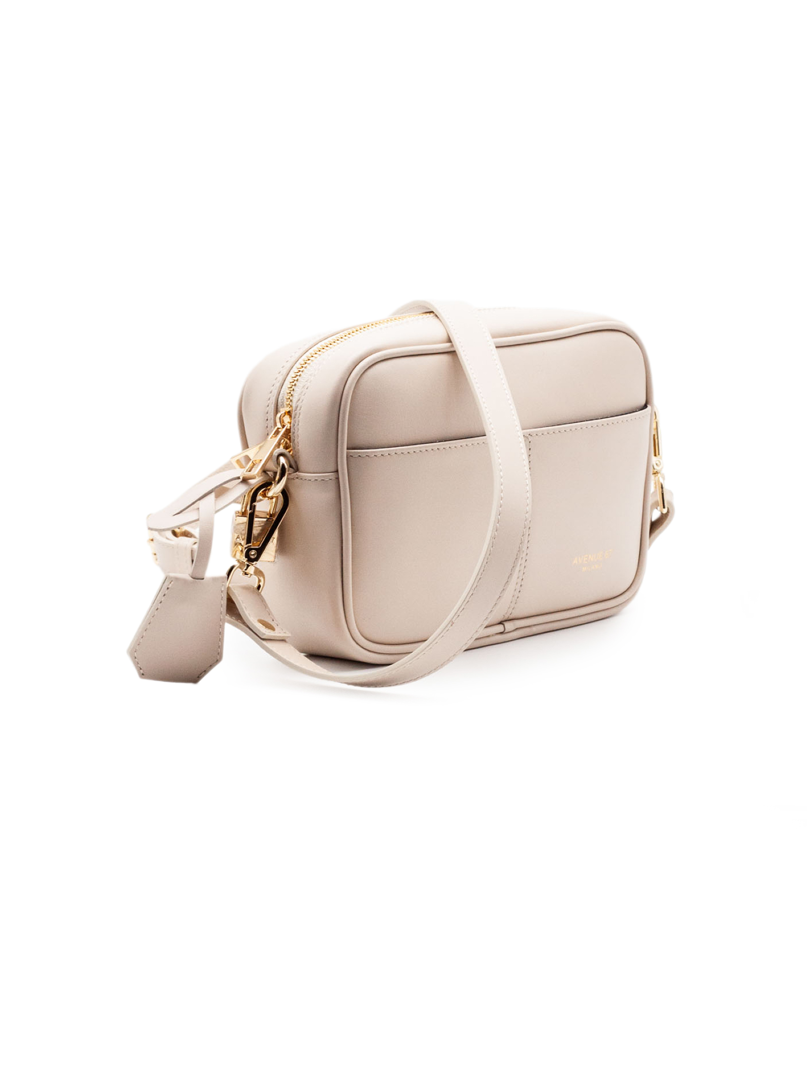 Camera bag in pelle beige, chiusura con zip doppio cursore, pendente con chiave e lucchetto, unico vano centrale, tasca interna con zip, tasca portaoggetti, doppia tasca esterna, tracolla rimovibile e regolabile max cm.115, dimensioni L.20 H.14 P.6