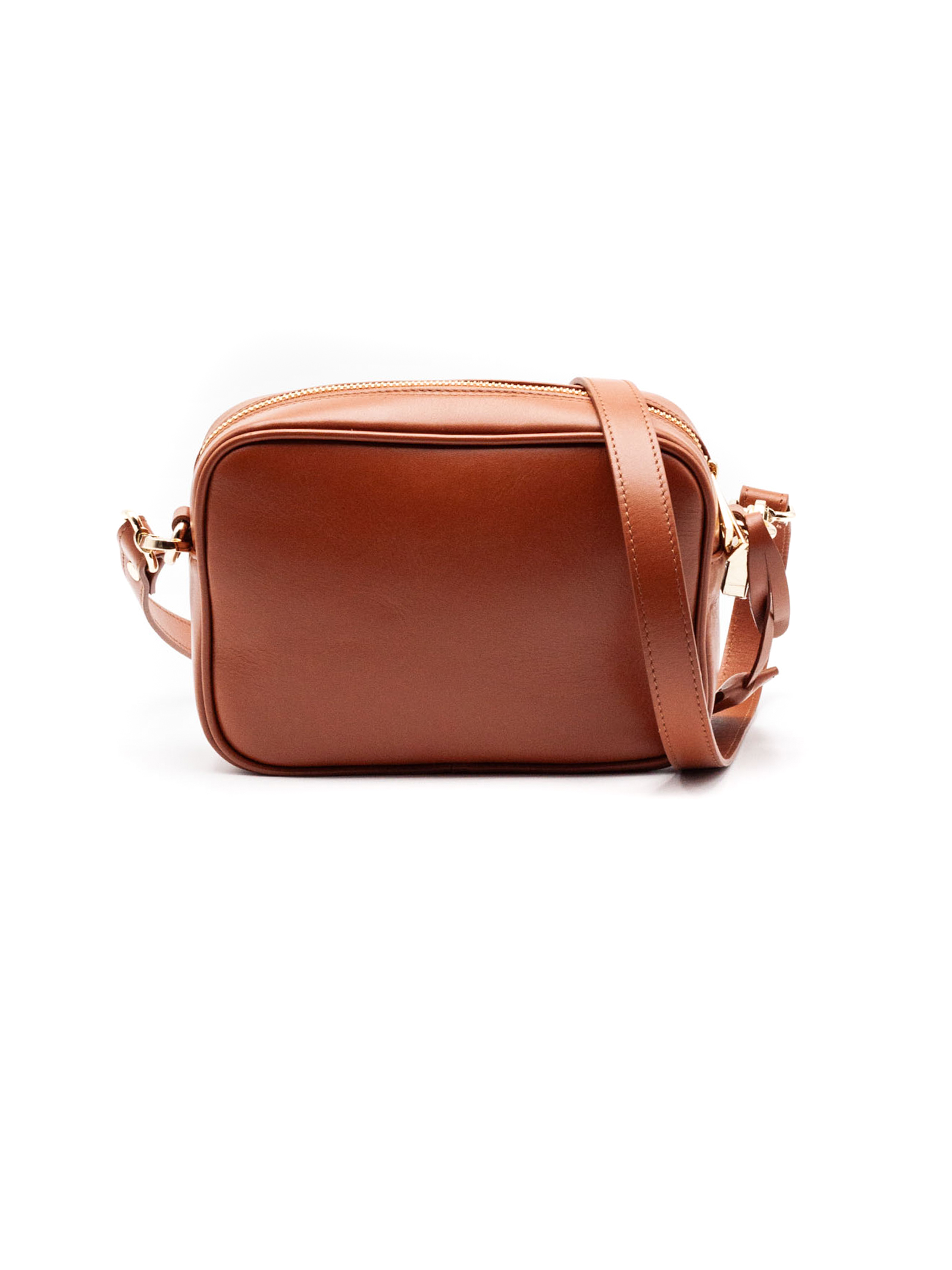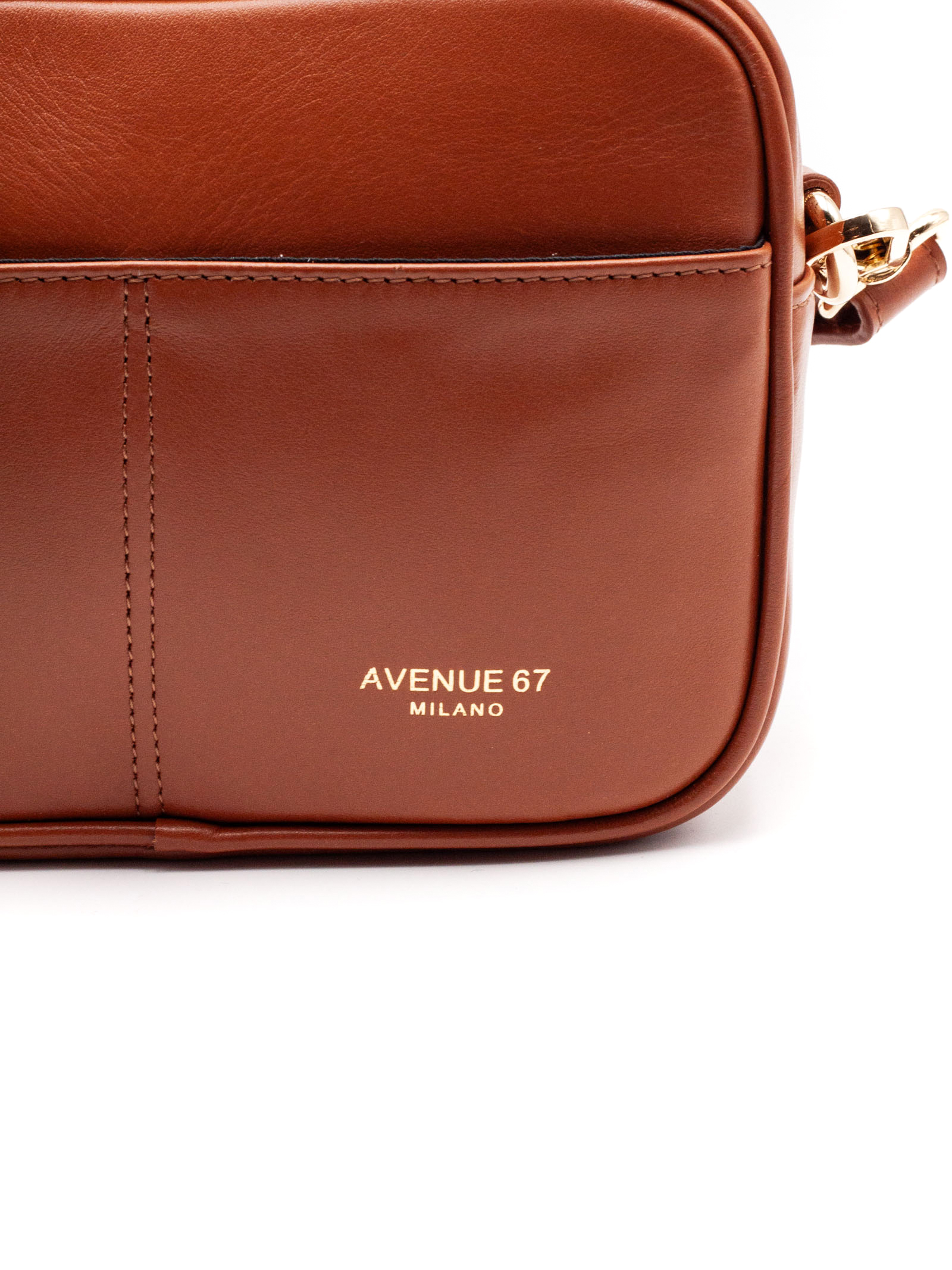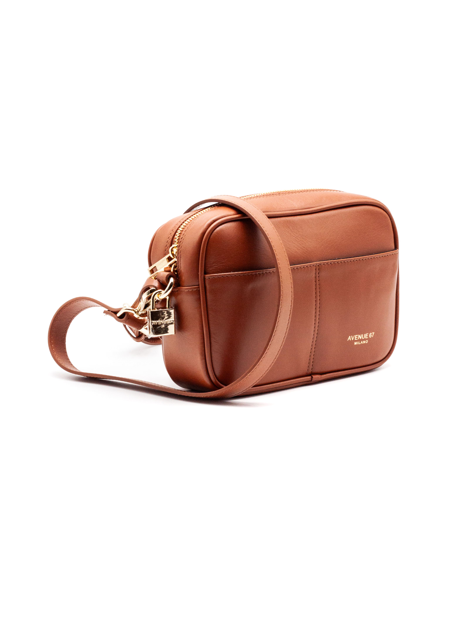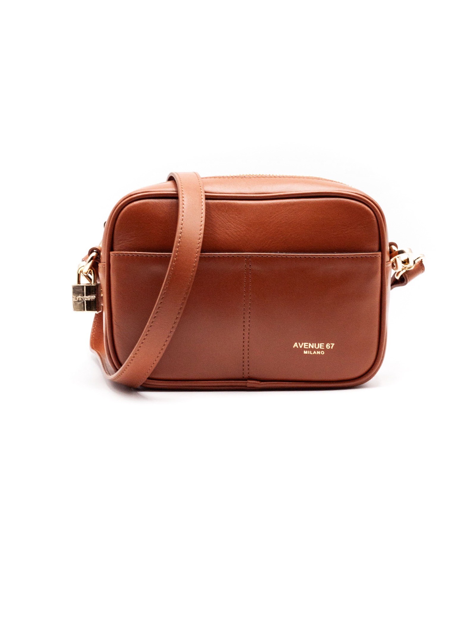 Camera bag in pelle marrone, chiusura con zip doppio cursore, pendente con chiave e lucchetto, unico vano centrale, tasca interna con zip, tasca portaoggetti, doppia tasca esterna, tracolla rimovibile e regolabile max cm.115, dimensioni L.20 H.14 P.6