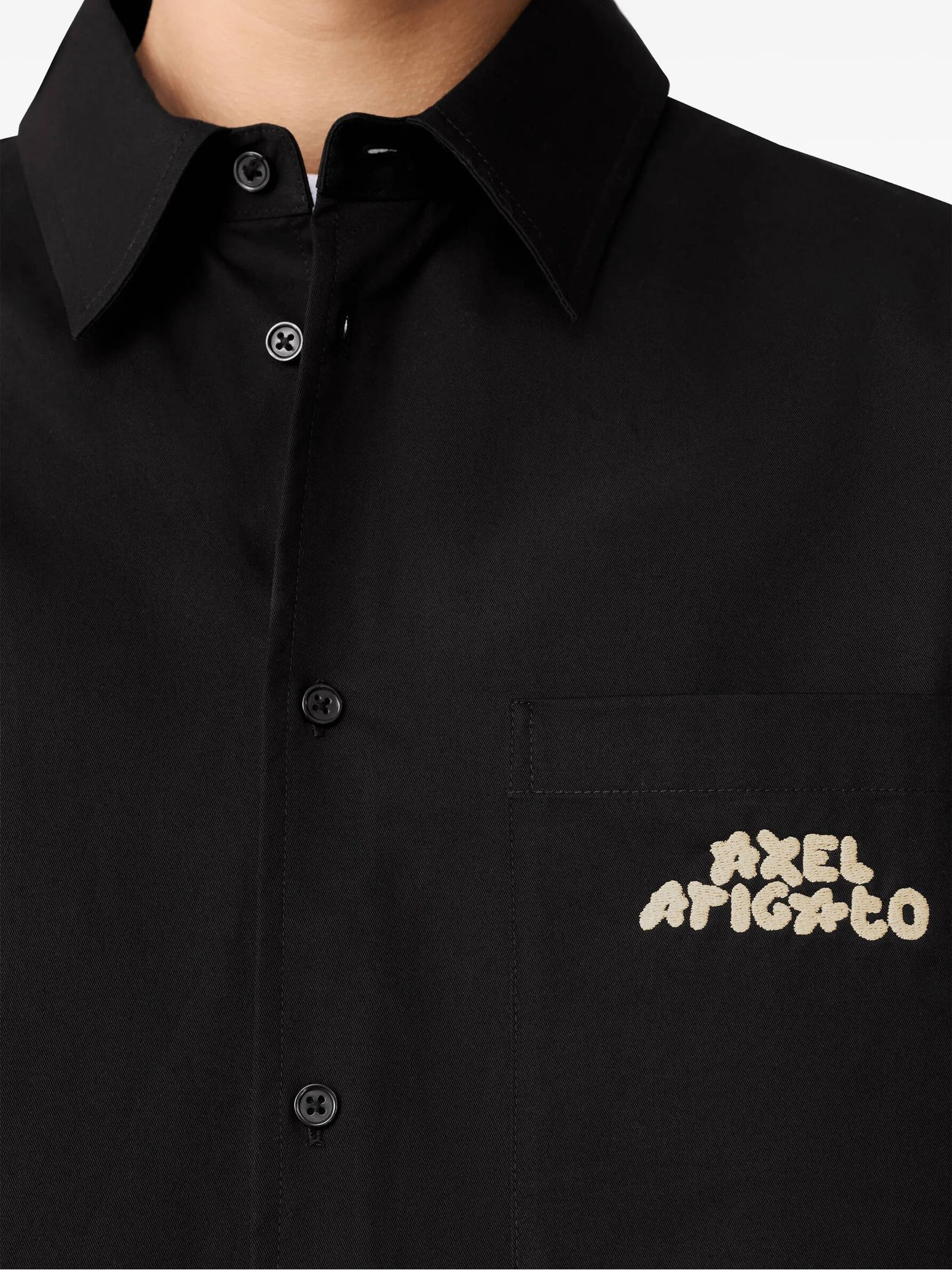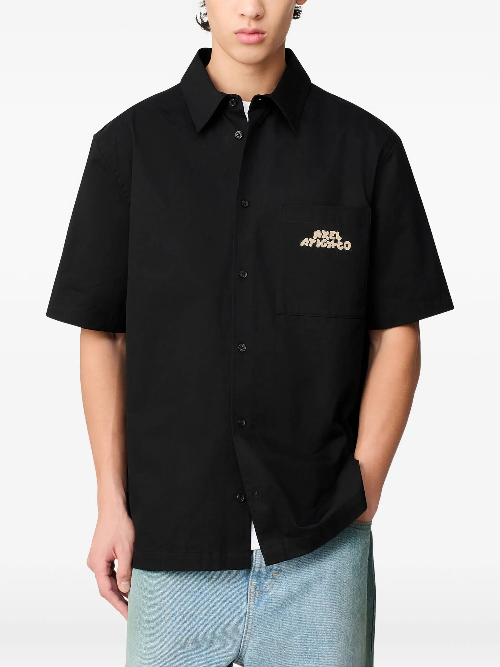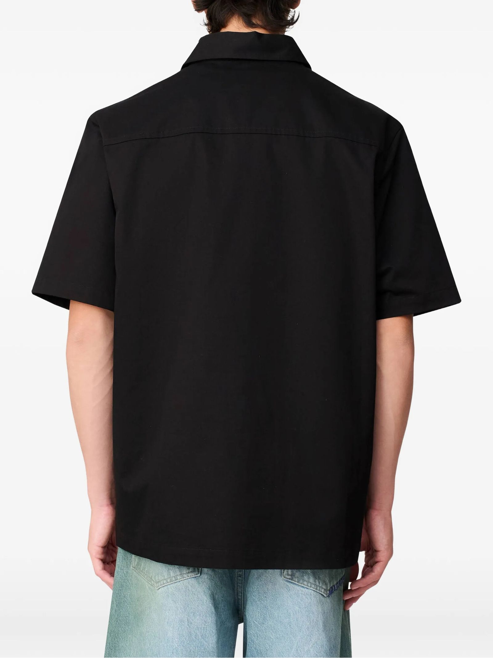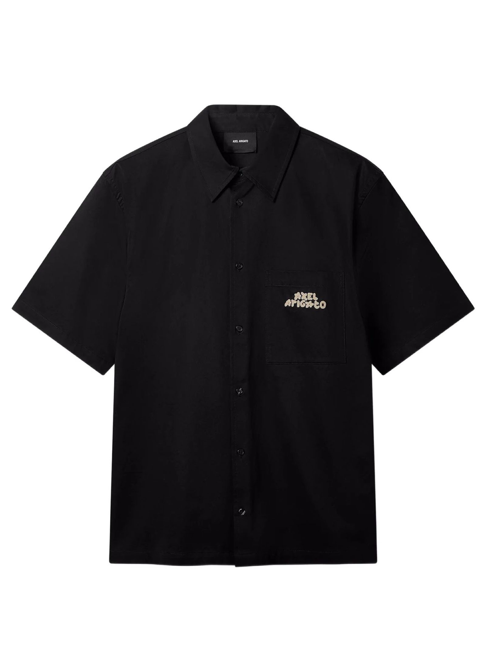 Camicia Drew in cotone nero, taschino sul petto, chiusura a bottoni, colletto a punta, maniche corte