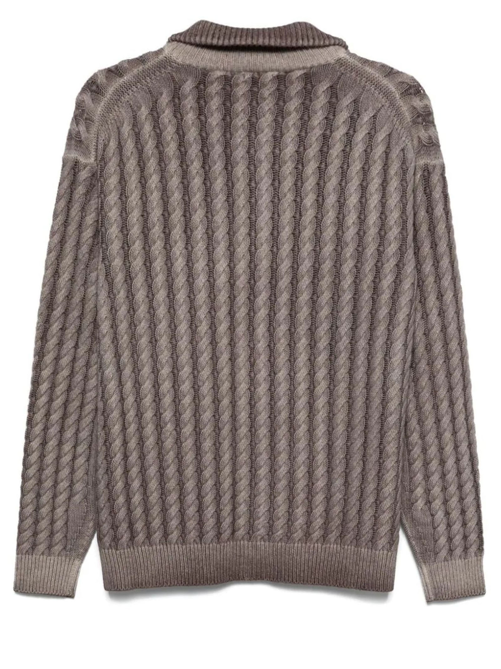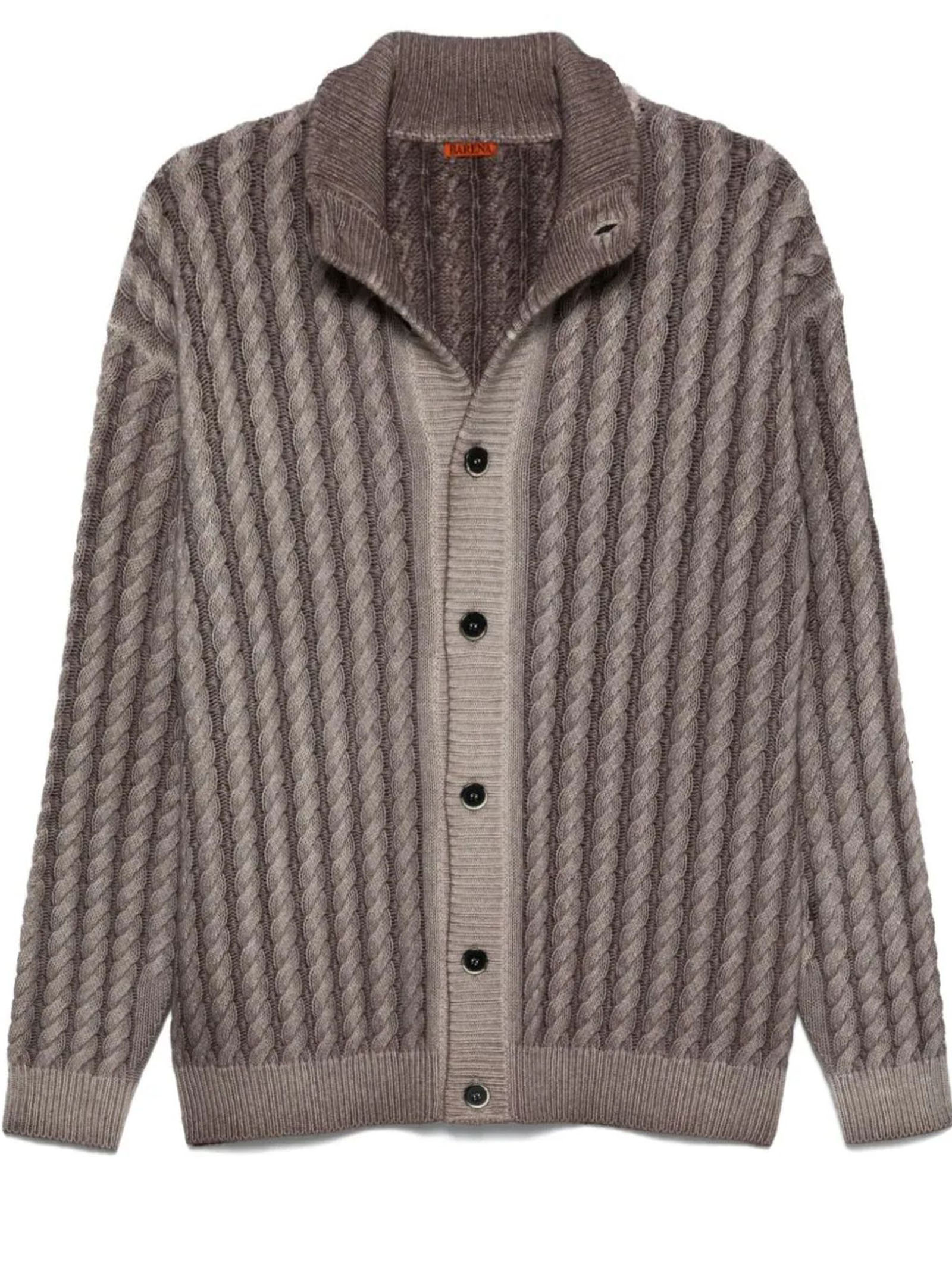 Cardigan in misto lana marrone chiaro, maglia intrecciata, chiusura frontale con abbottonatura, rifinitura a coste, collo alto, maniche lunghe, orlo dritto