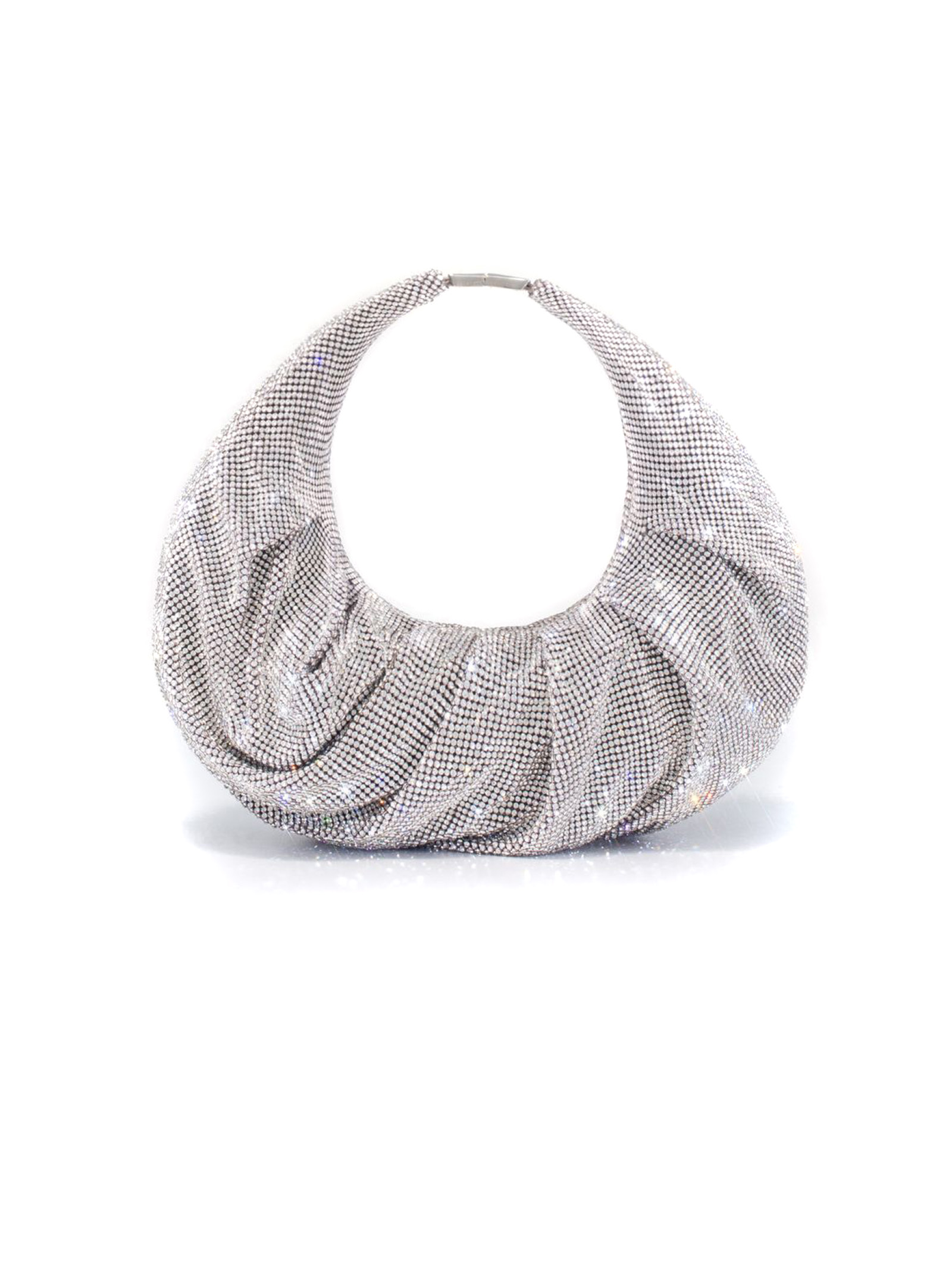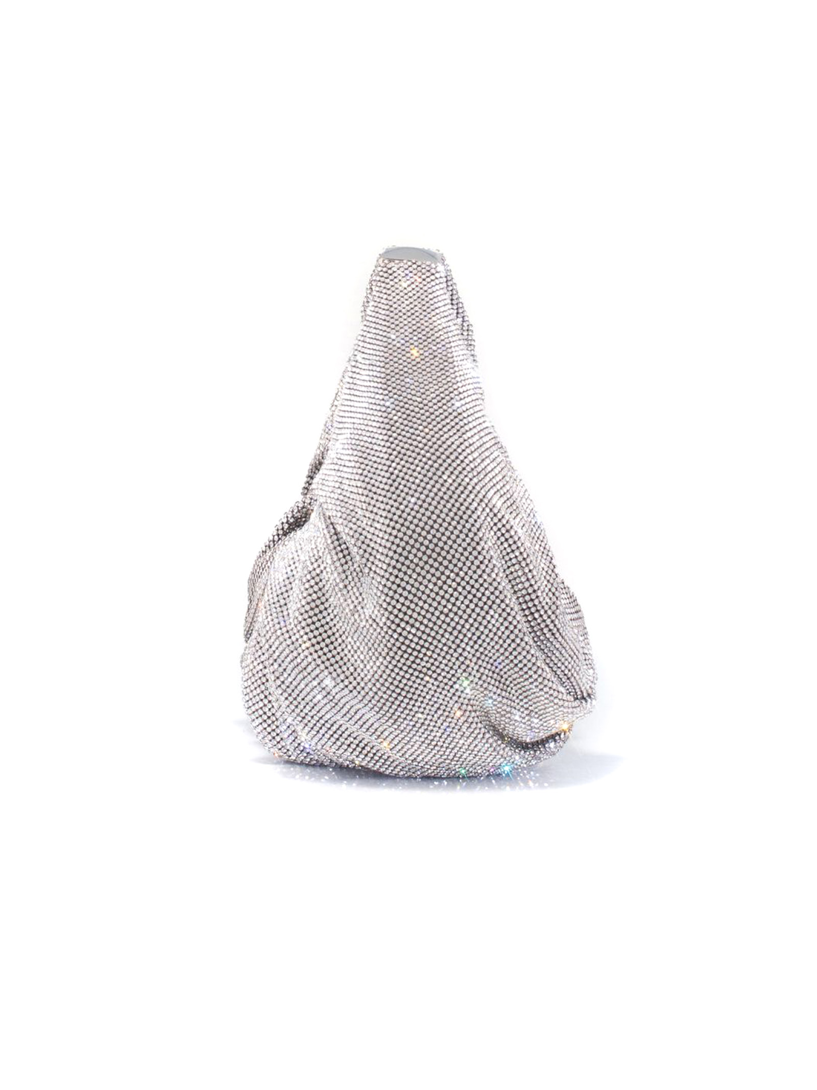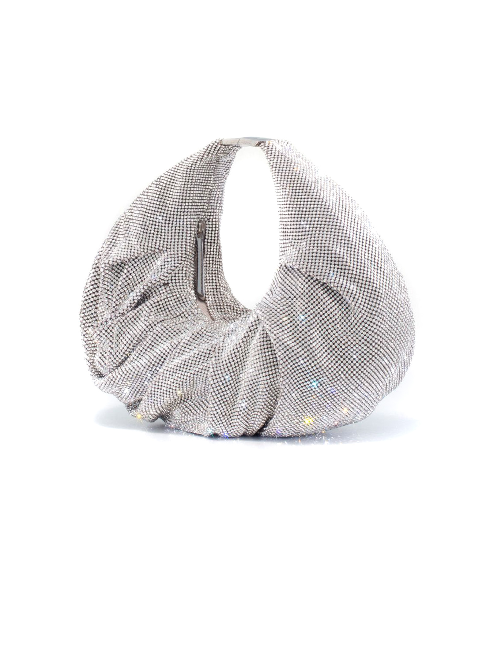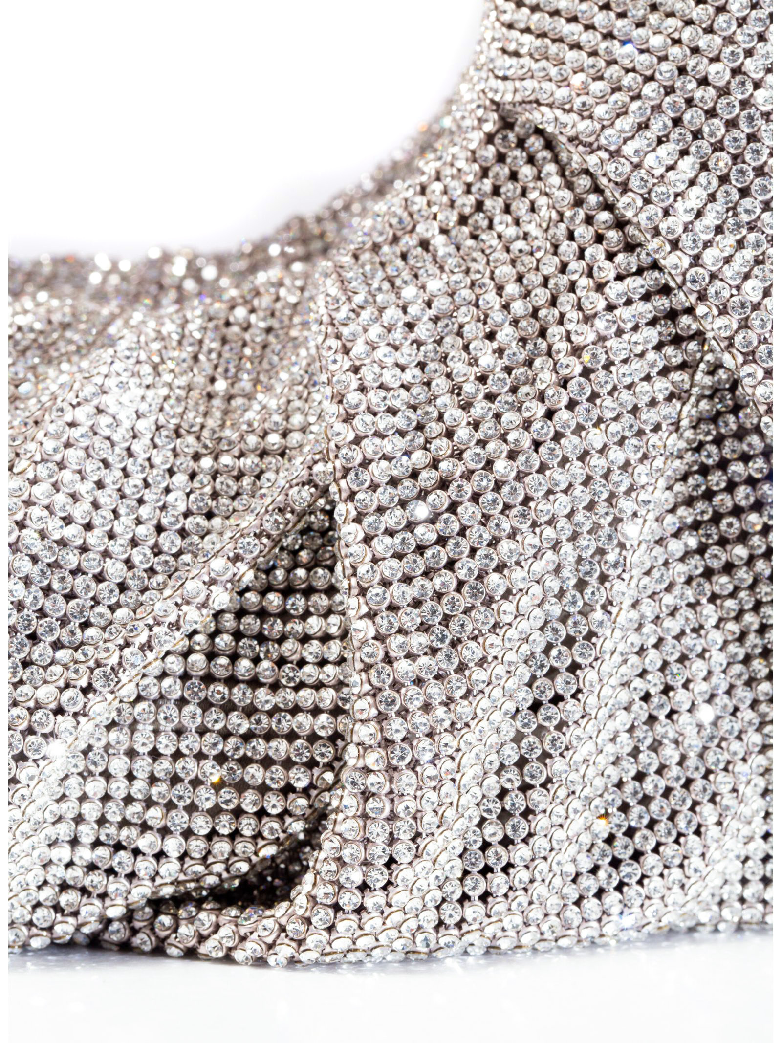 Borsa tote Yennefer color argento, design in rete, decorazione con strass, dettagli plissettati, componenti metalliche color oro con logo inciso, chiusura superiore con zip, scomparto unico, applicazione interna con logo, fodera integrale, 24 x 4 x 26 cm