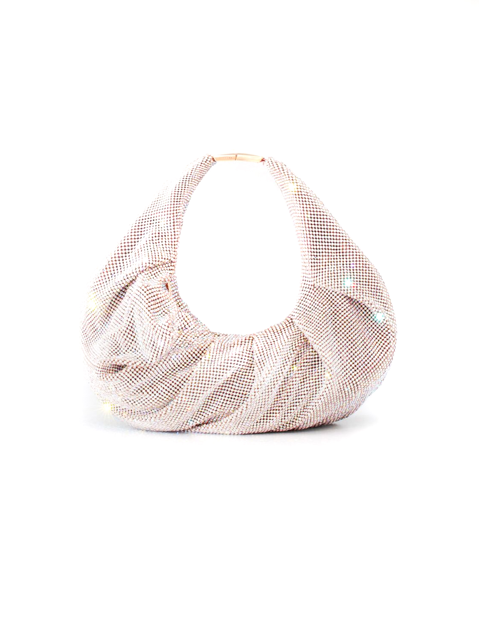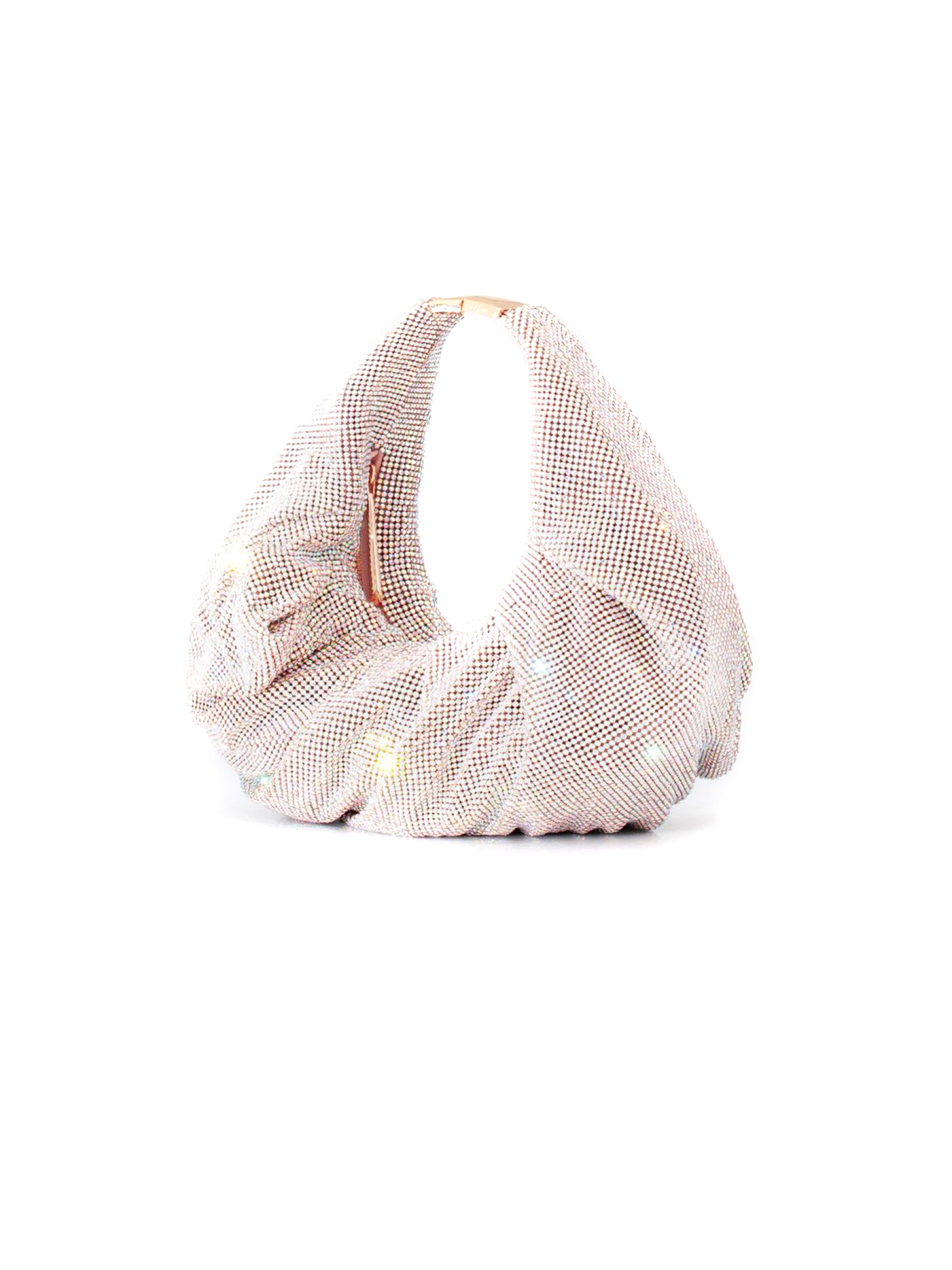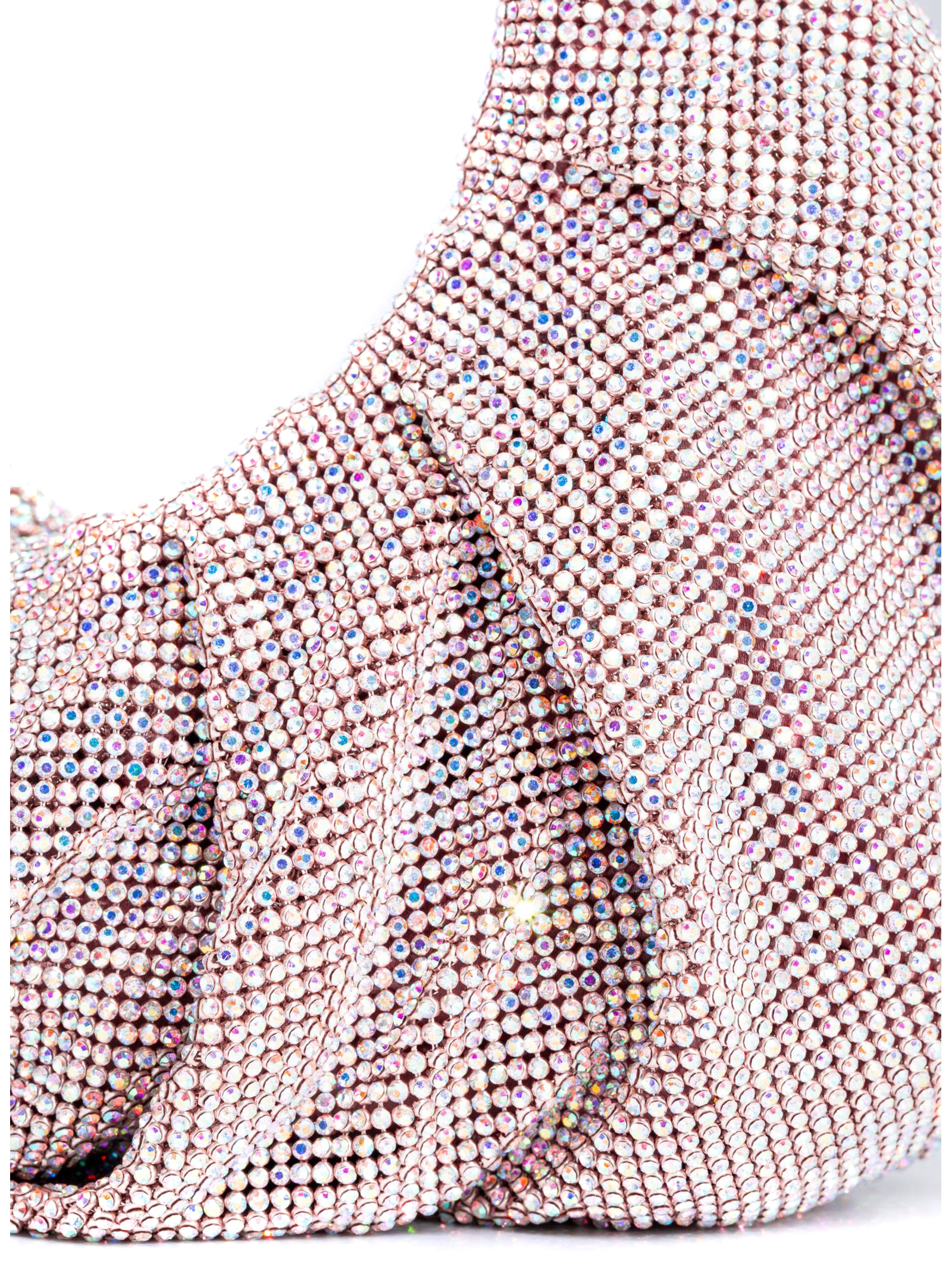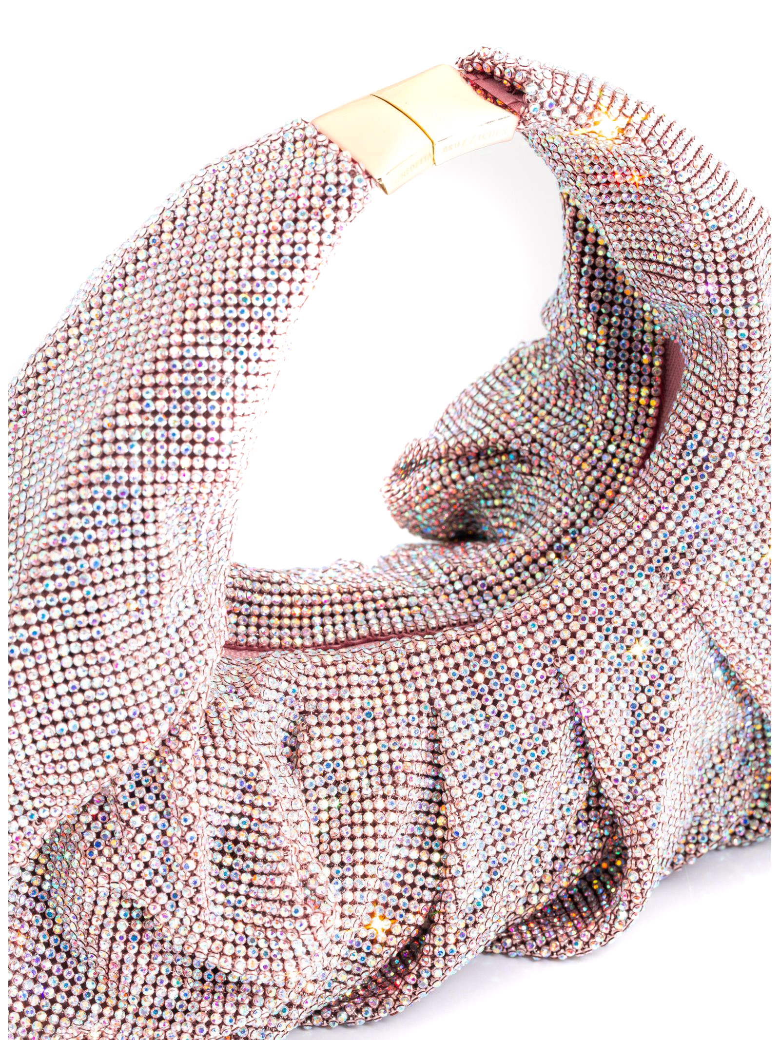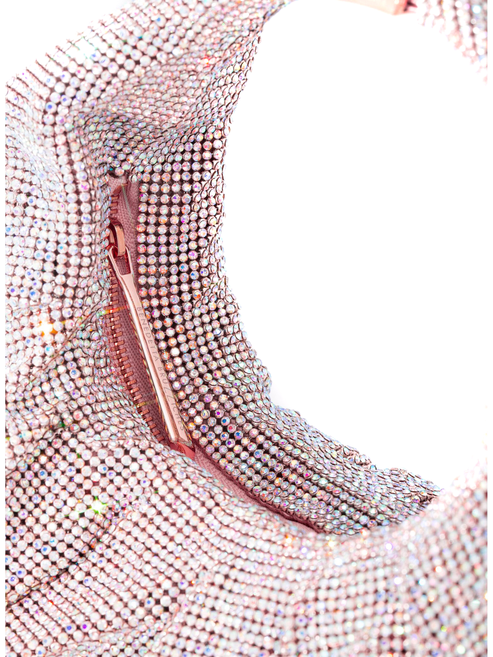 Borsa tote Yennefer rosa, design in rete, decorazione con strass, dettagli plissettati, componenti metalliche color oro con logo inciso, chiusura superiore con zip, scomparto unico, applicazione interna con logo, fodera integrale, 24 x 4 x 26 cm