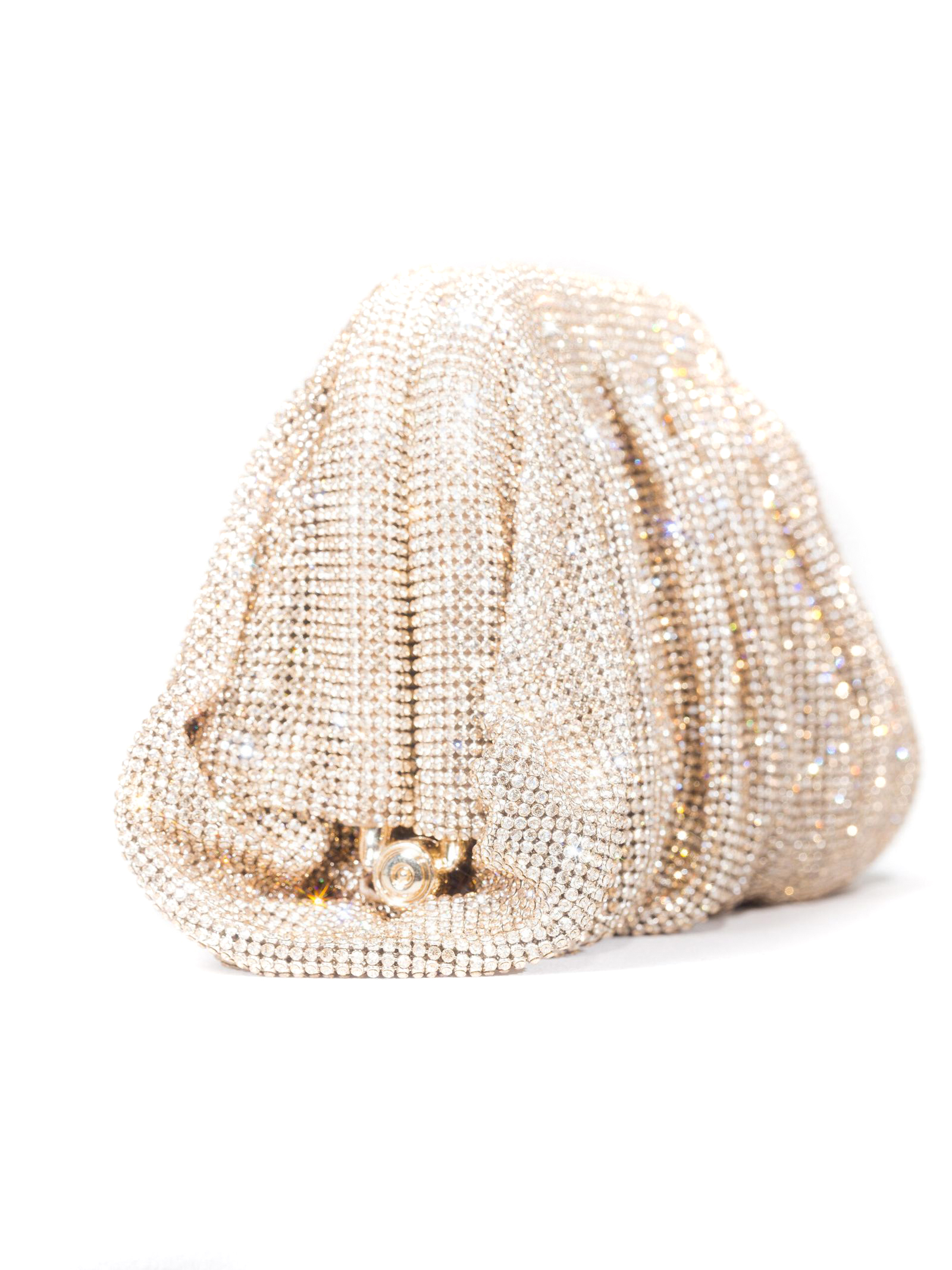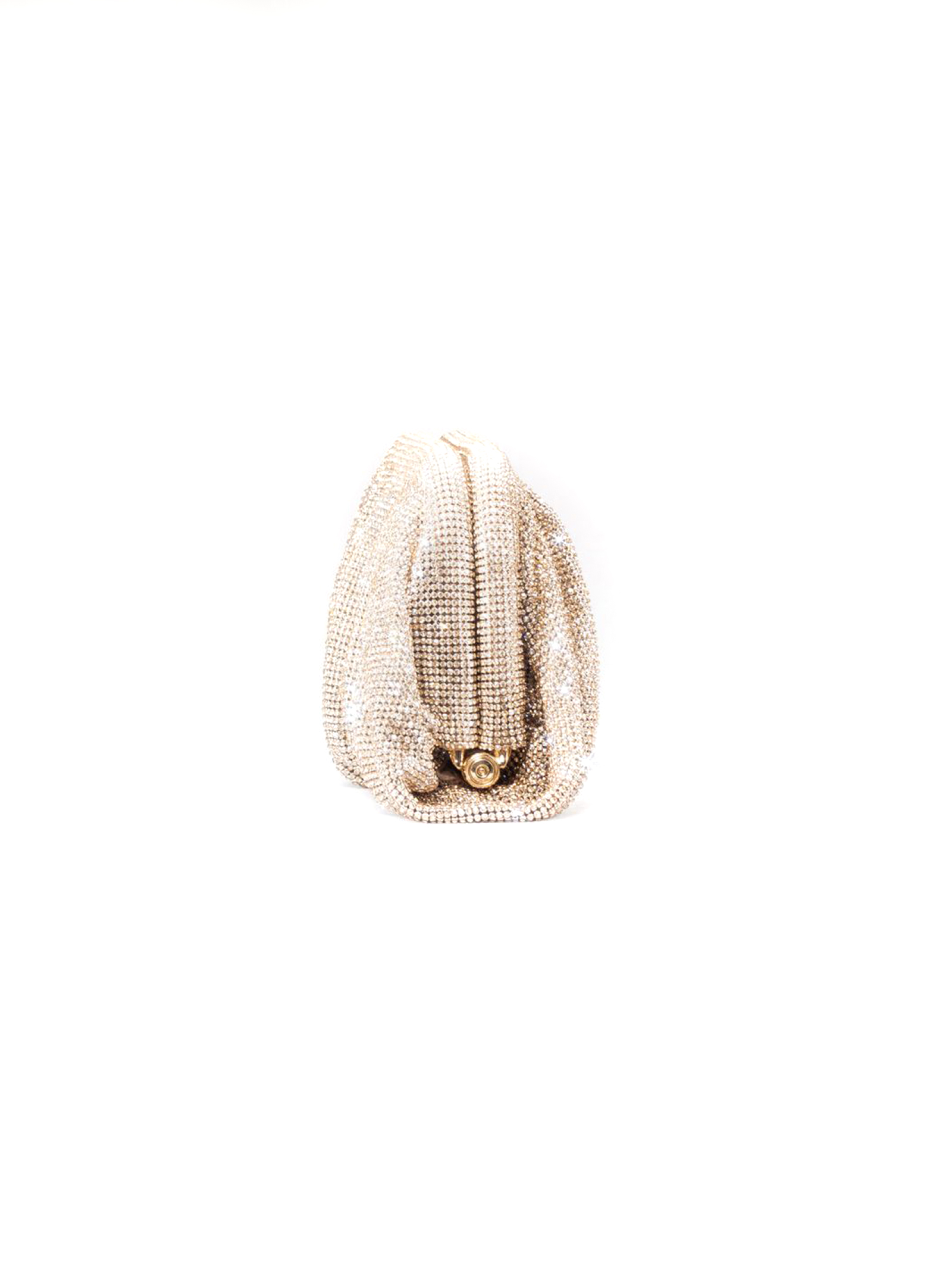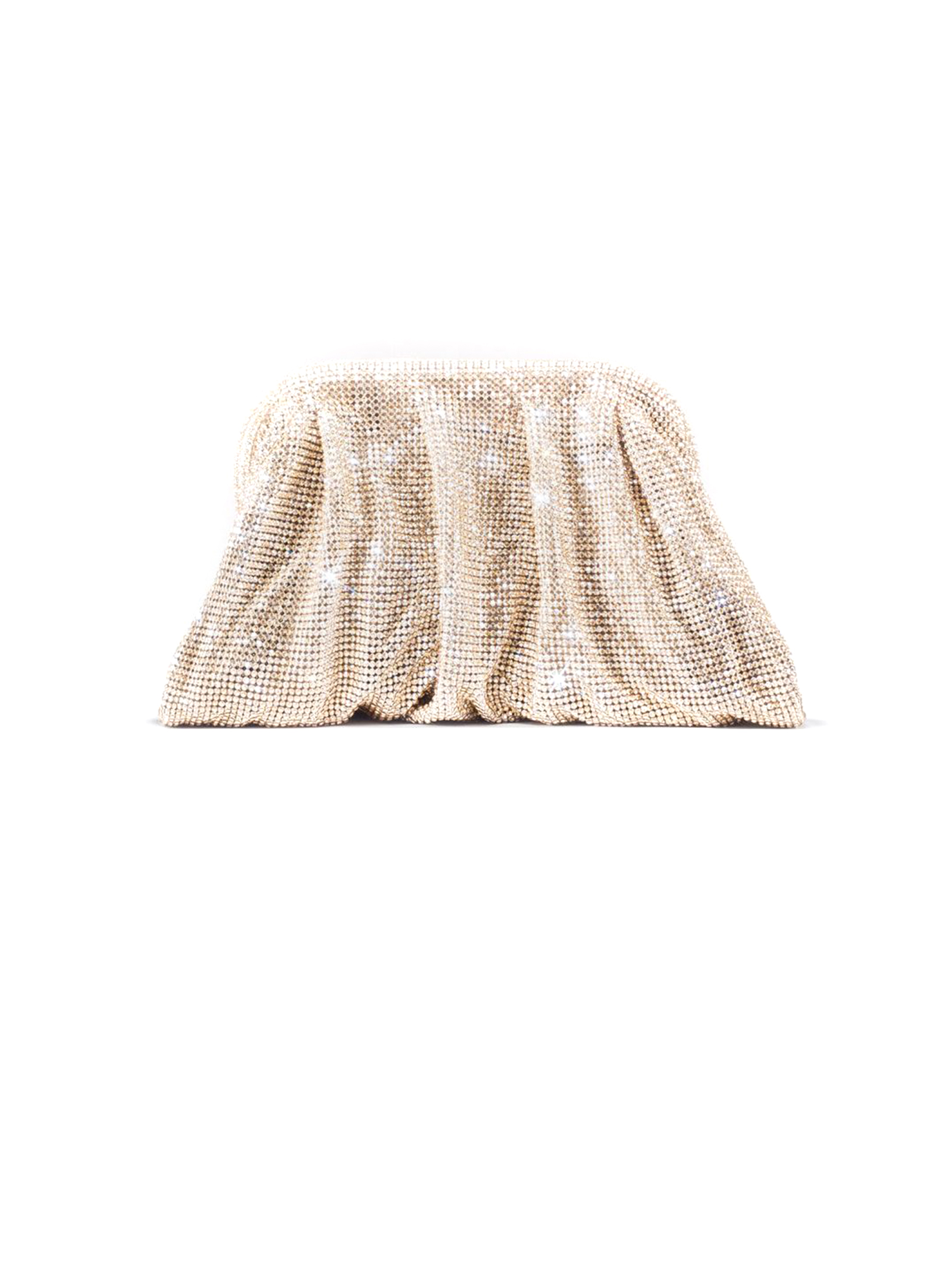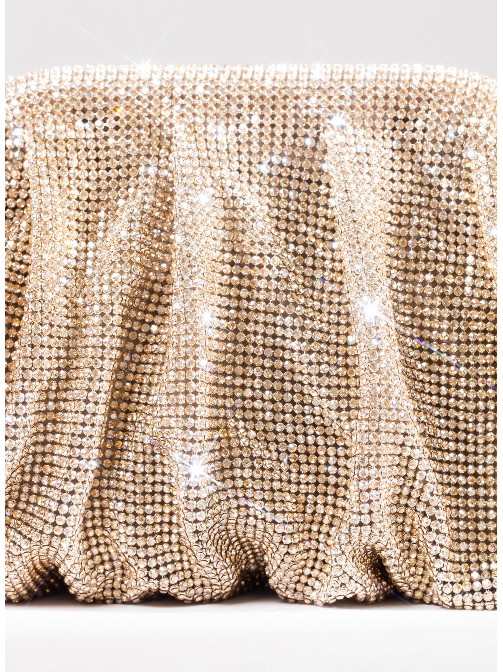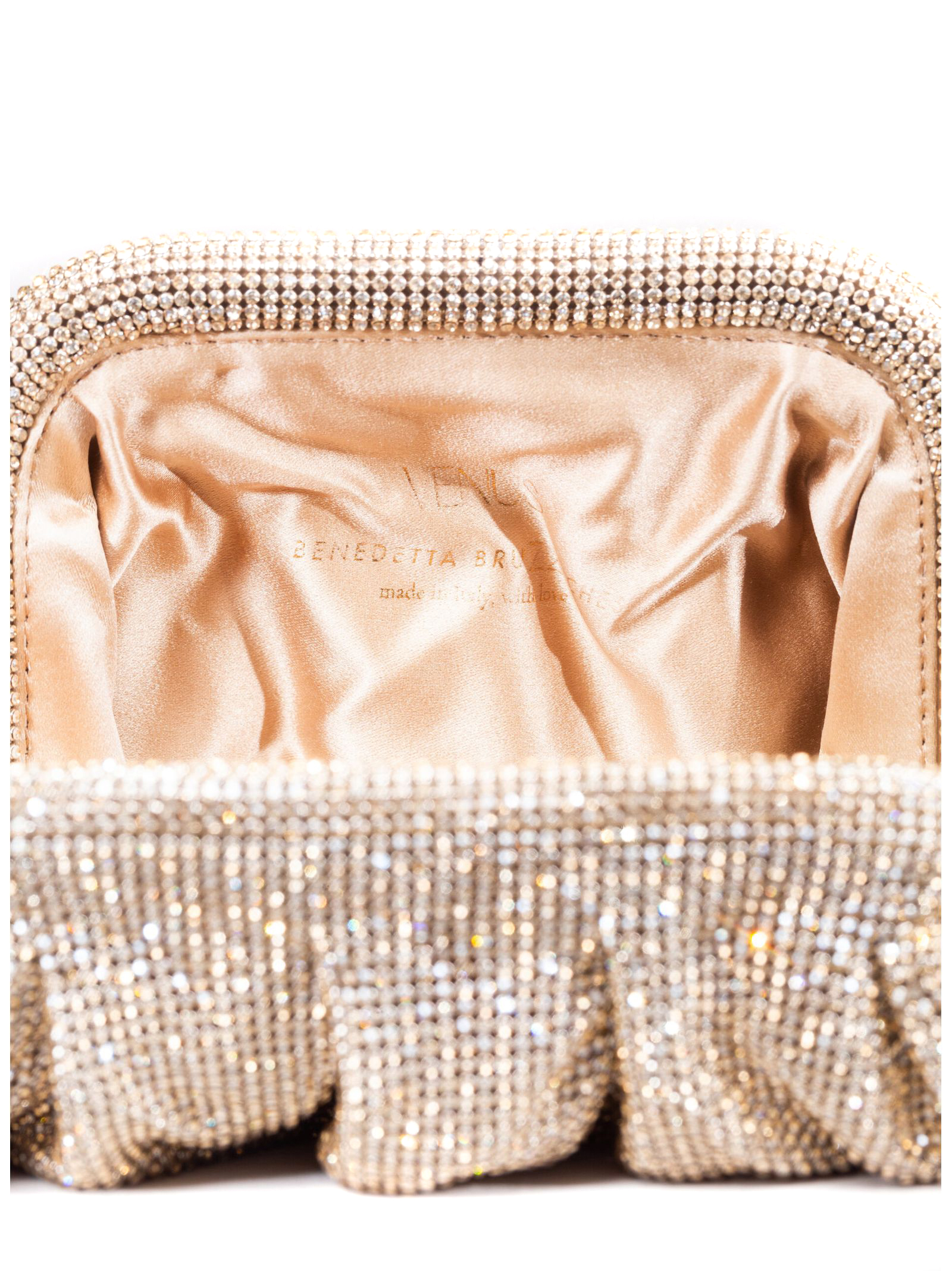 Clutch Venus Petite oro, decorazione con strass, dettaglio con ruches, dettagli color argento, chiusura con fermaglio, scomparto unico, stampa interna con logo, fodera in seta biologica, profondità 5 cm, altezza 10 cm, larghezza 15 cm