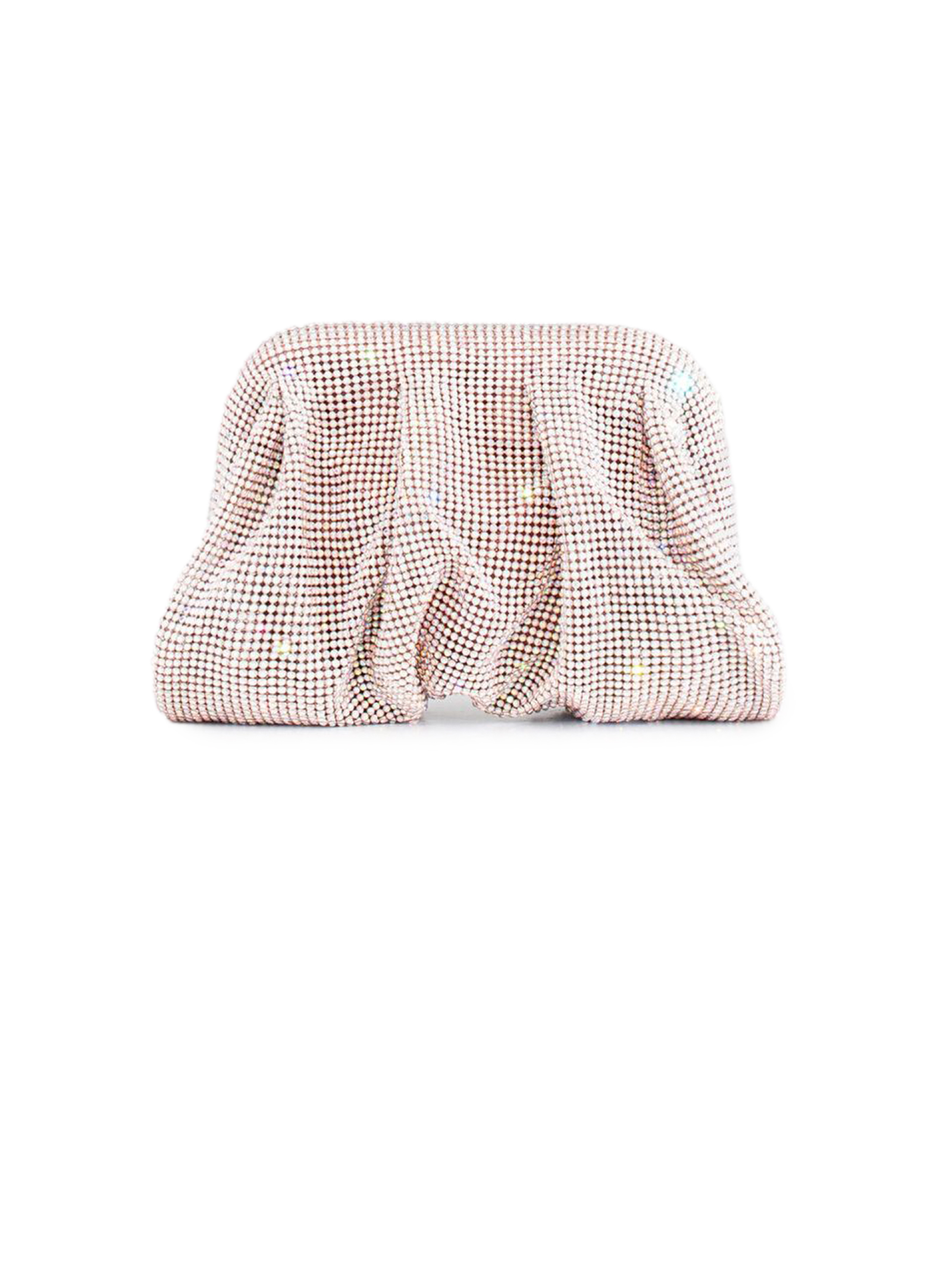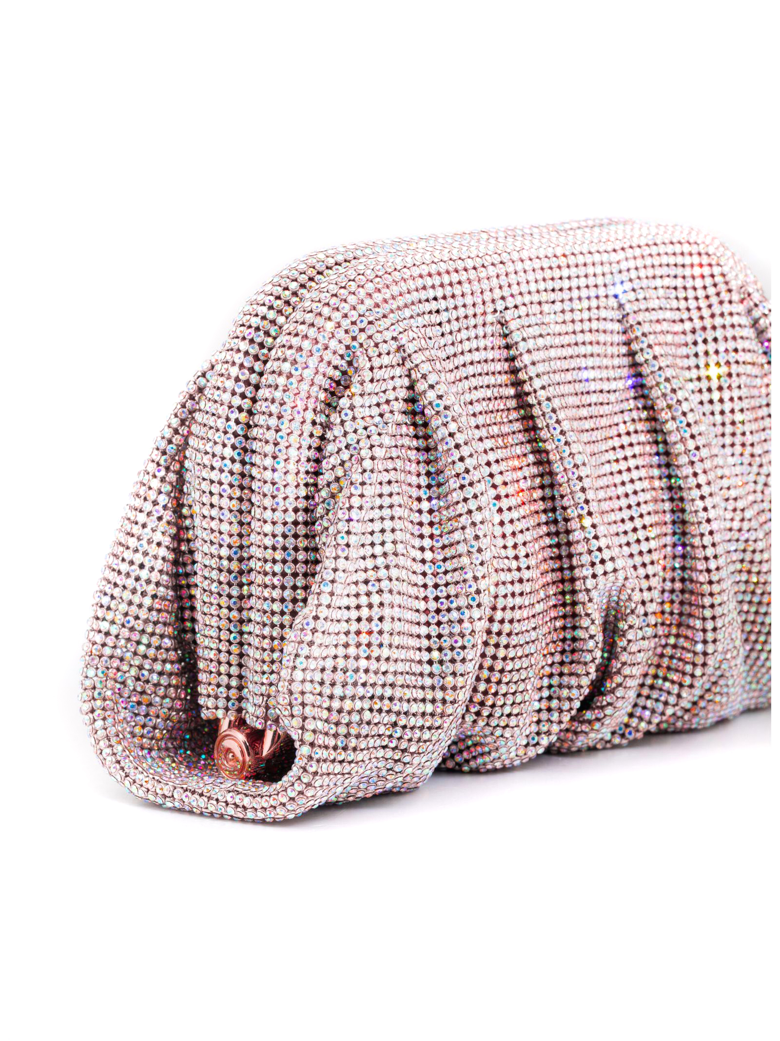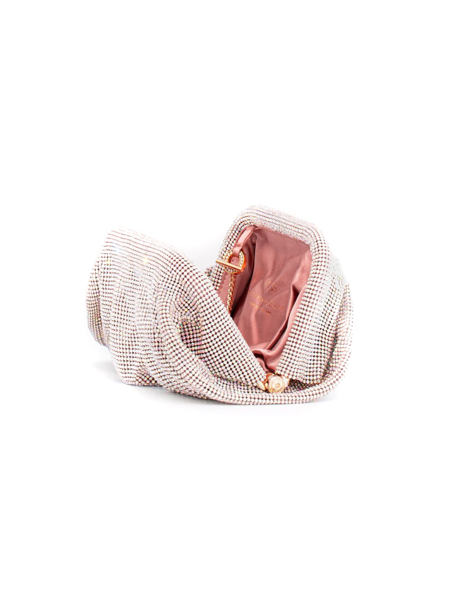 Clutch Venus Petite Rosa, decorazione con strass, dettaglio con ruches, dettagli color argento, chiusura con fermaglio, scomparto unico, stampa interna con logo, fodera in seta biologica, profondità 5 cm, altezza 10 cm, larghezza 15 cm