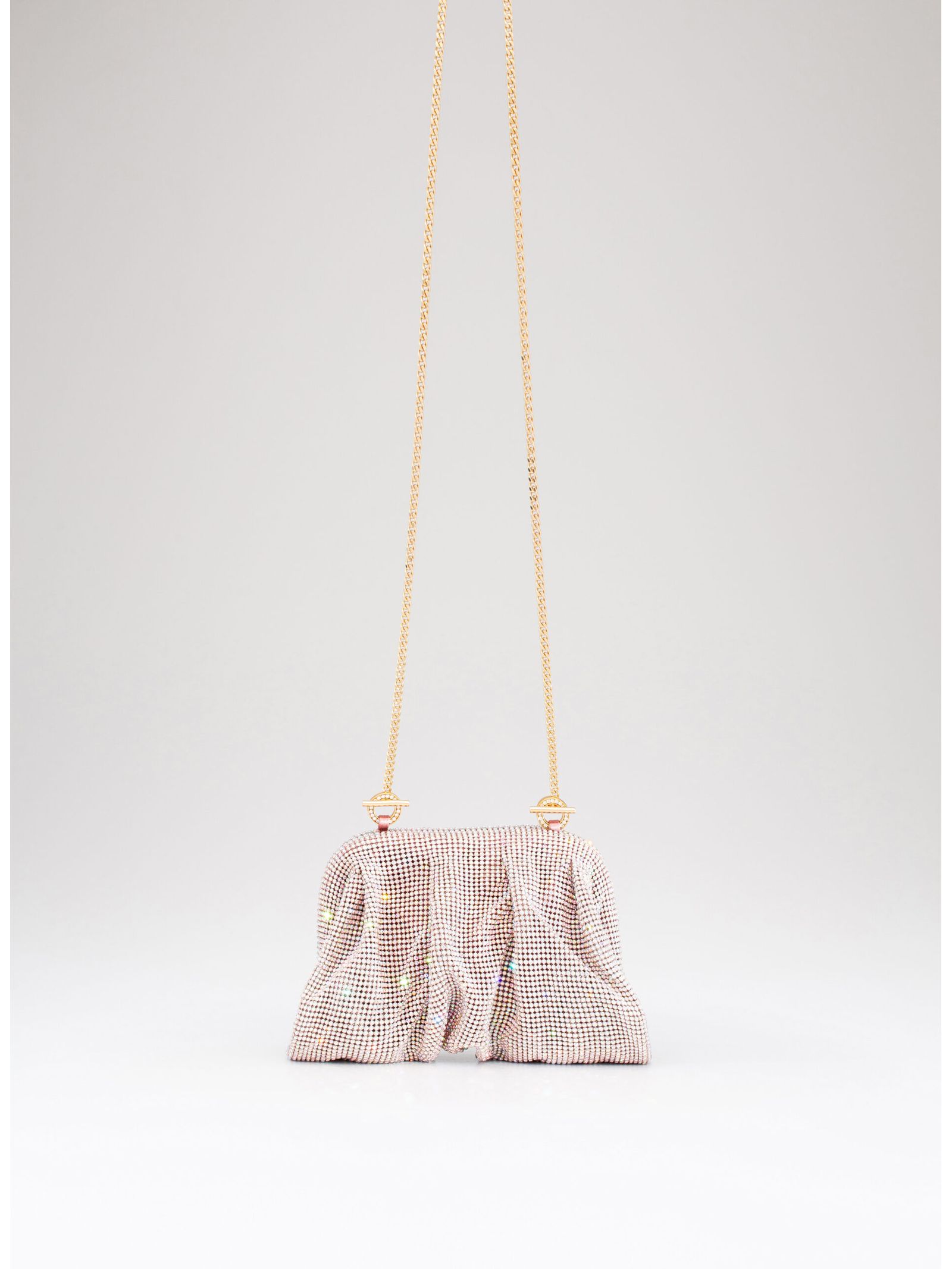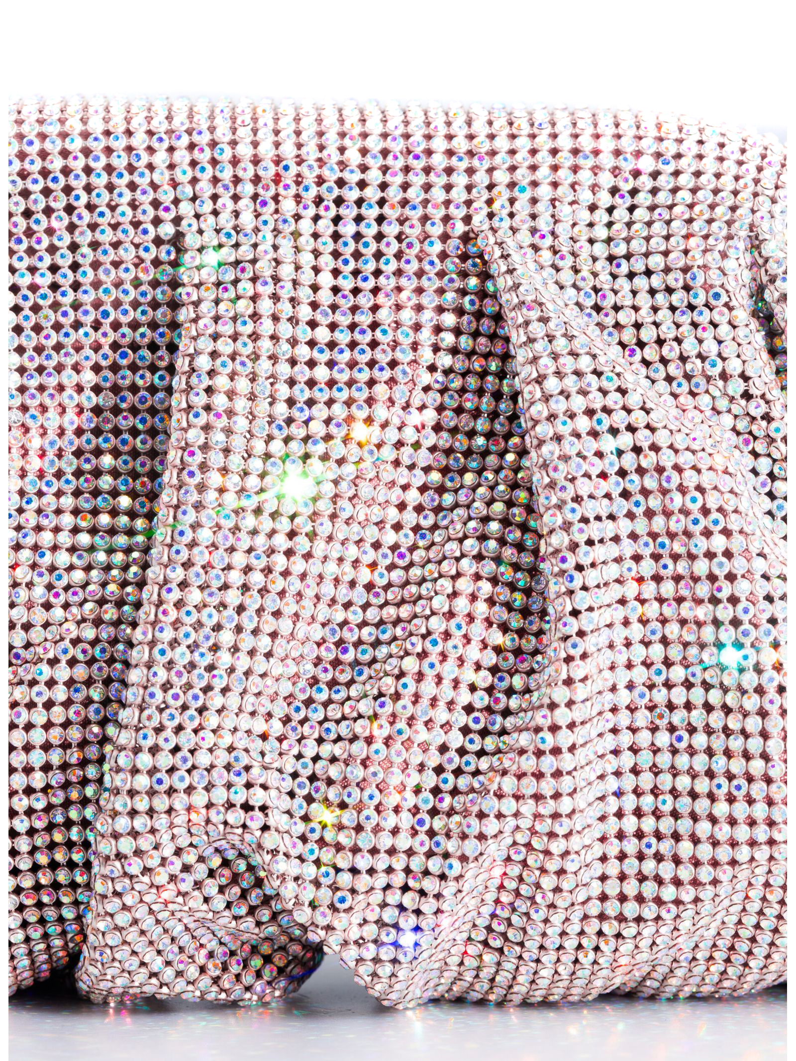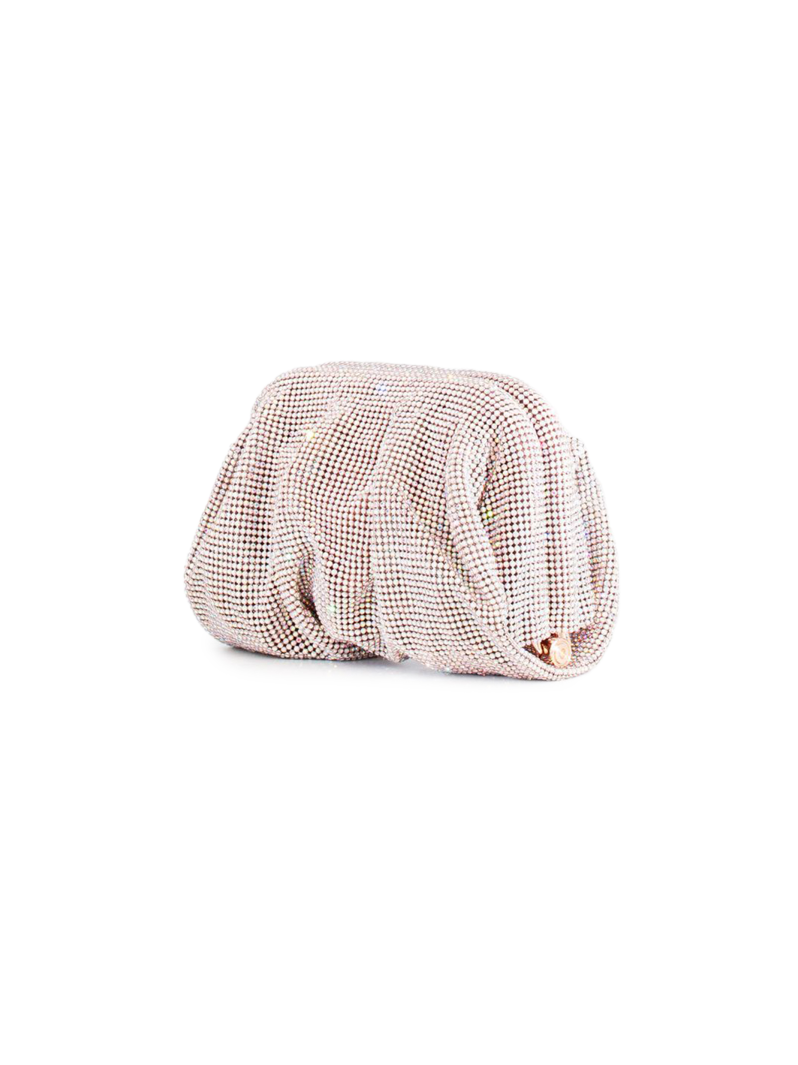 Clutch Venus Petite Rosa, decorazione con strass, dettaglio con ruches, dettagli color argento, chiusura con fermaglio, scomparto unico, stampa interna con logo, fodera in seta biologica, profondità 5 cm, altezza 10 cm, larghezza 15 cm