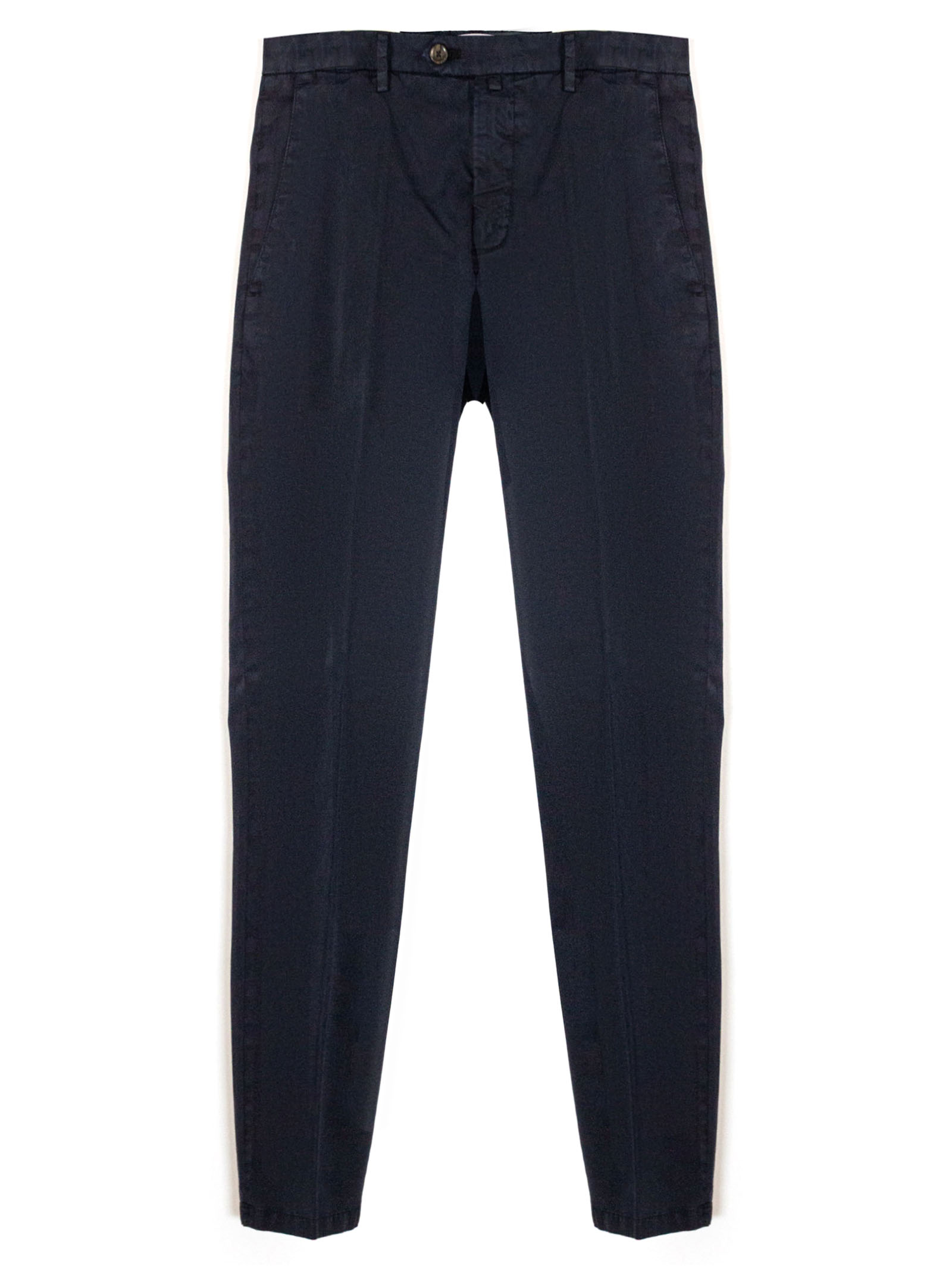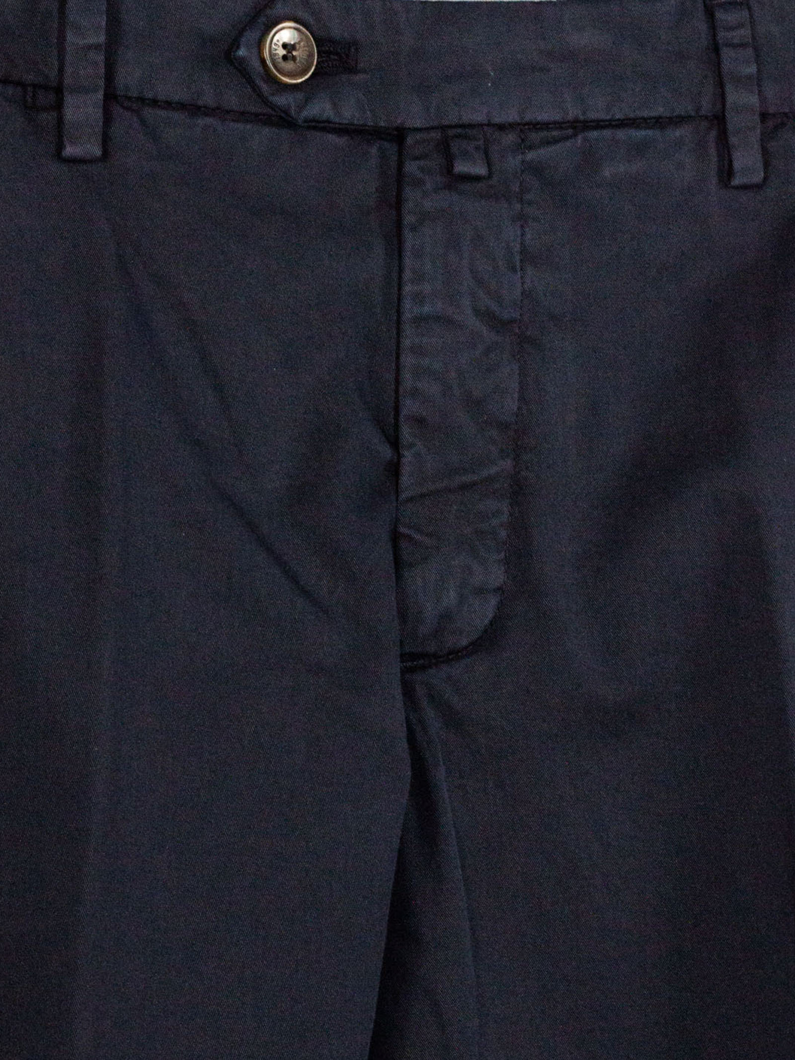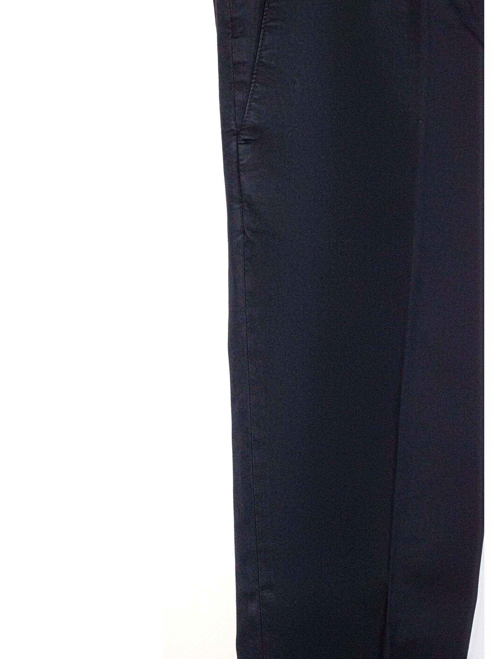 Pantalone in cotone elasticizzato blu con chiusura frontale, passanti per cintura, tasche laterali, tasche sul retro, vestibilità regolare