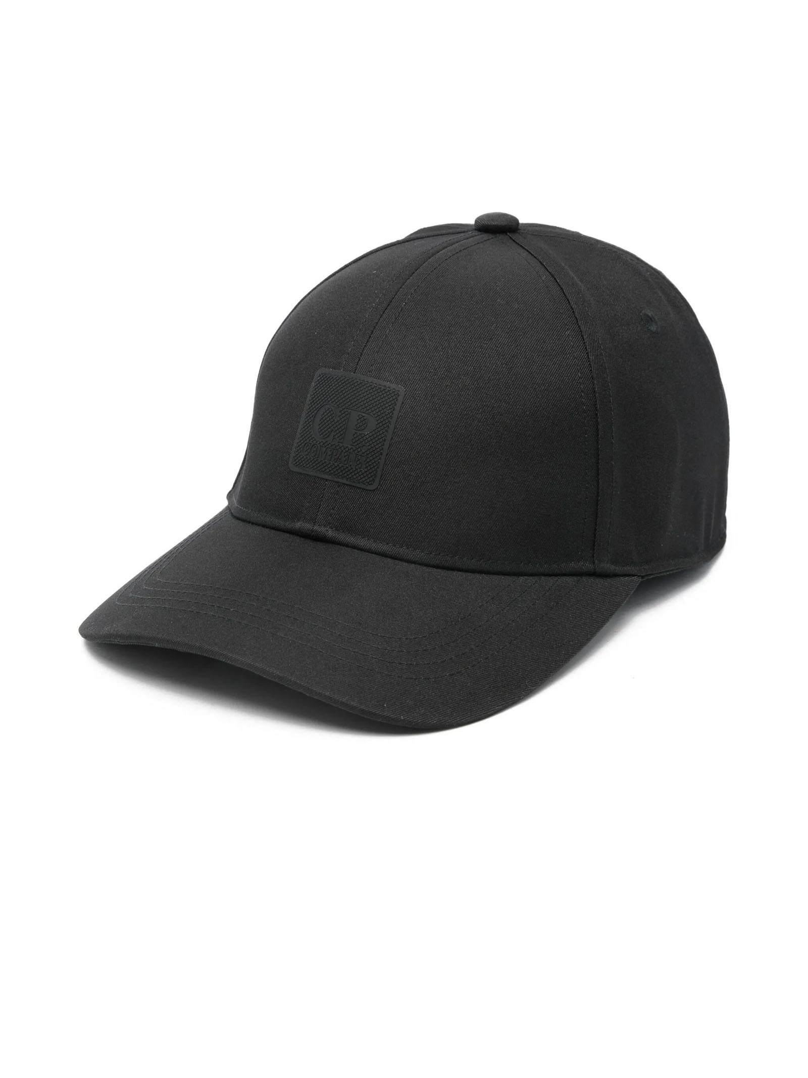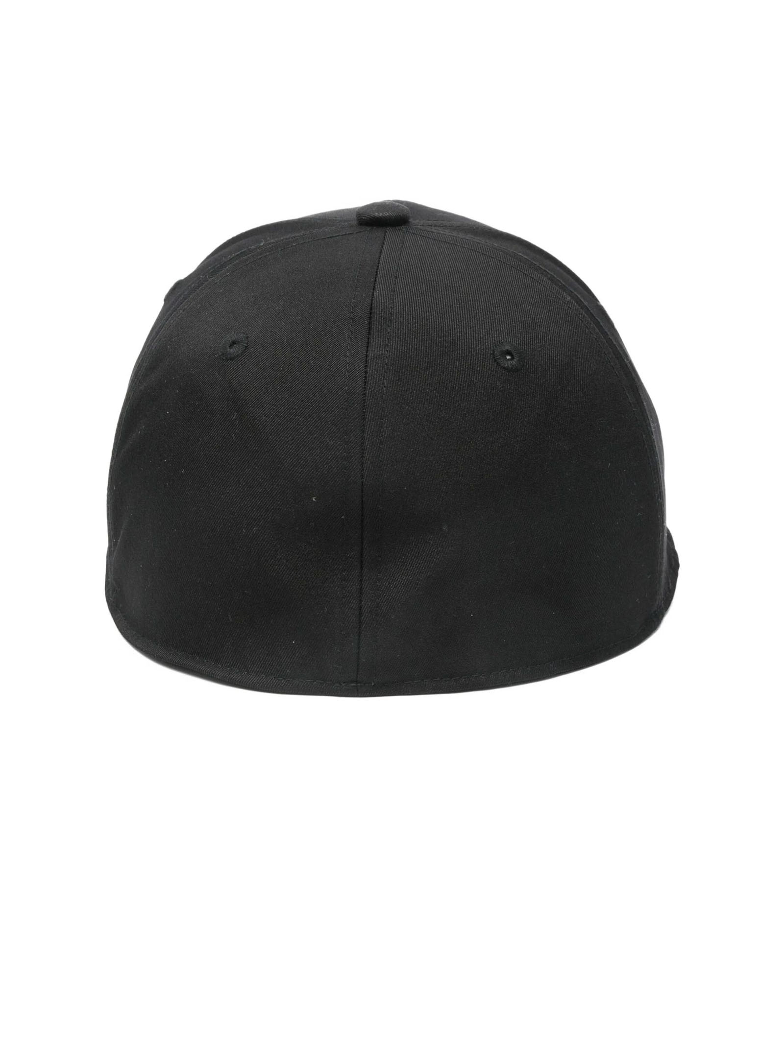 Cappello da baseball nero con applicazione logo, tesa curva, bottone riAbito in tessuto sulla corona, dettagli occhielli