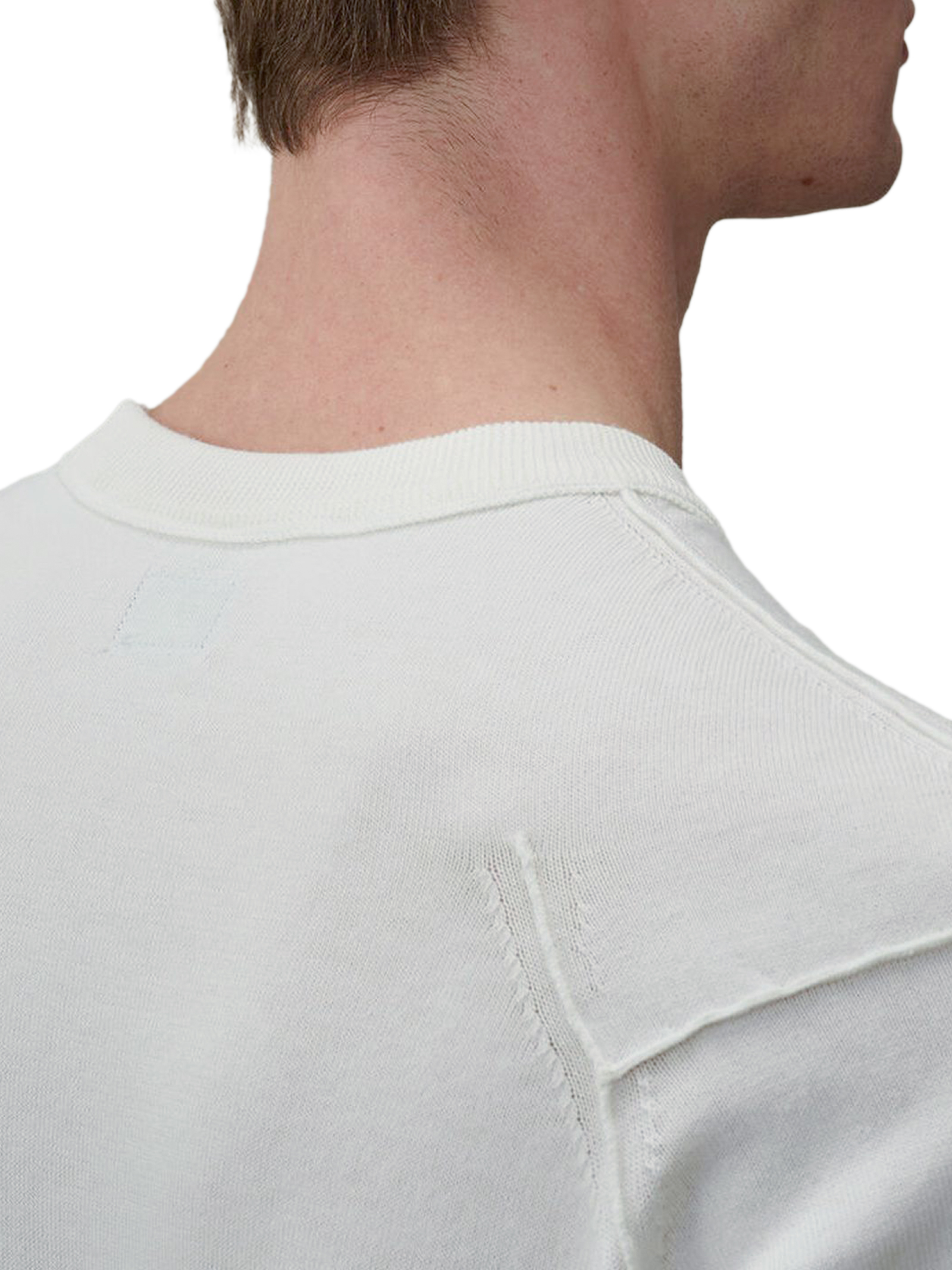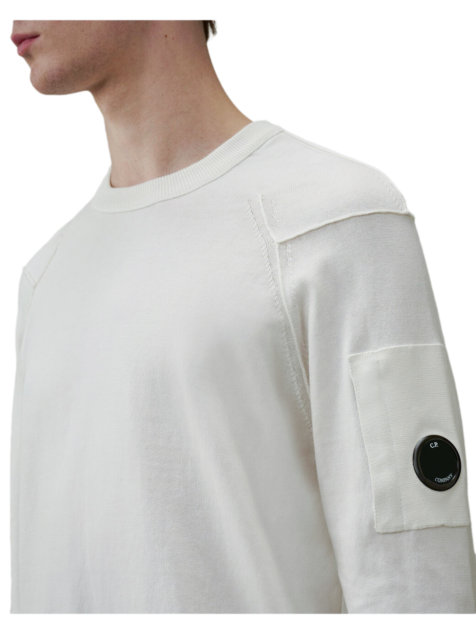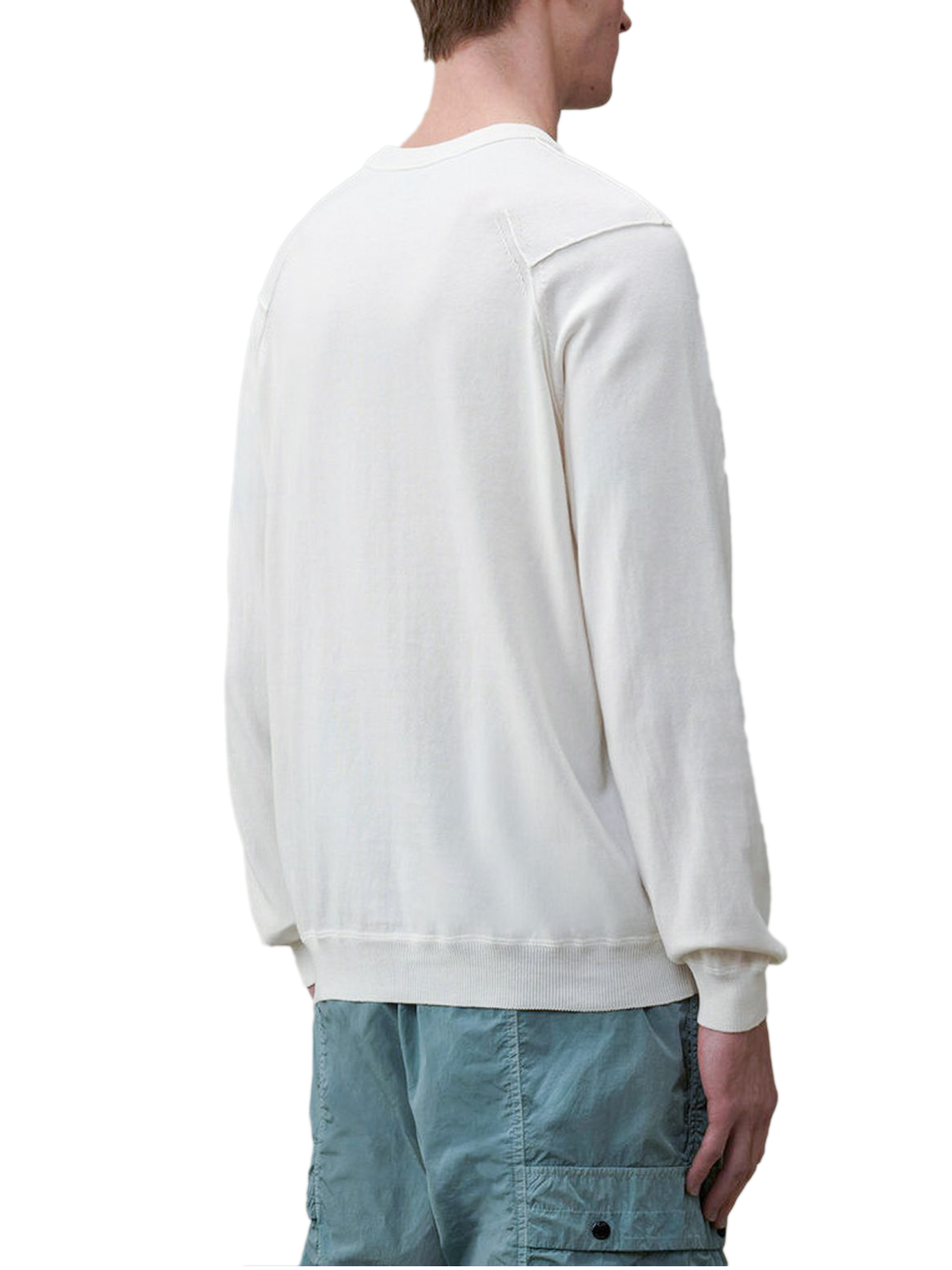Maglione in cotone Sea Island Bianco, Girocollo a costine, Taschino con Lente, Cuciture a contrasto, Polsini e orlo a costine, Finezza 14, Regular Fit