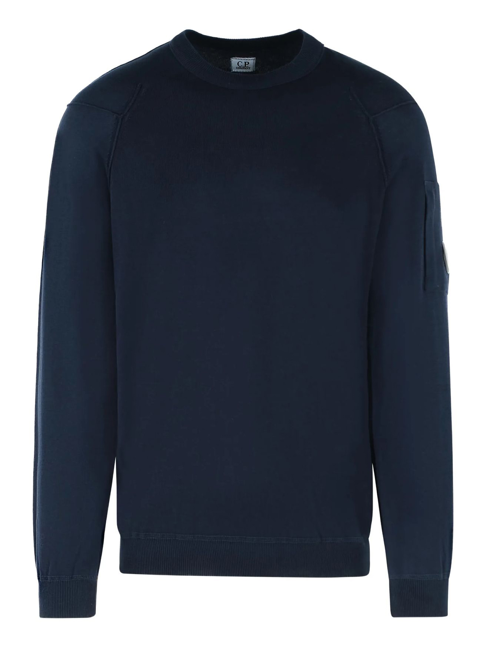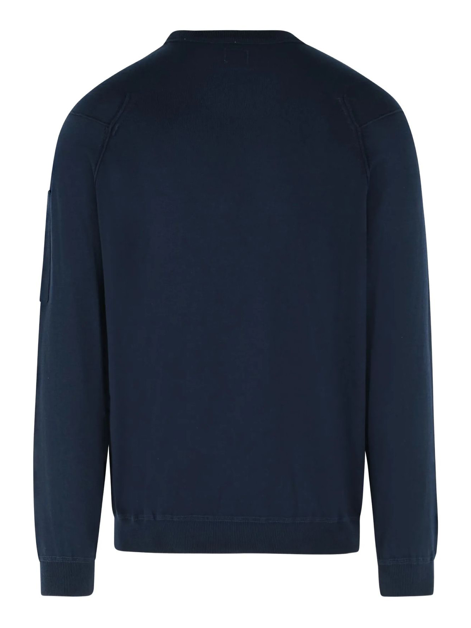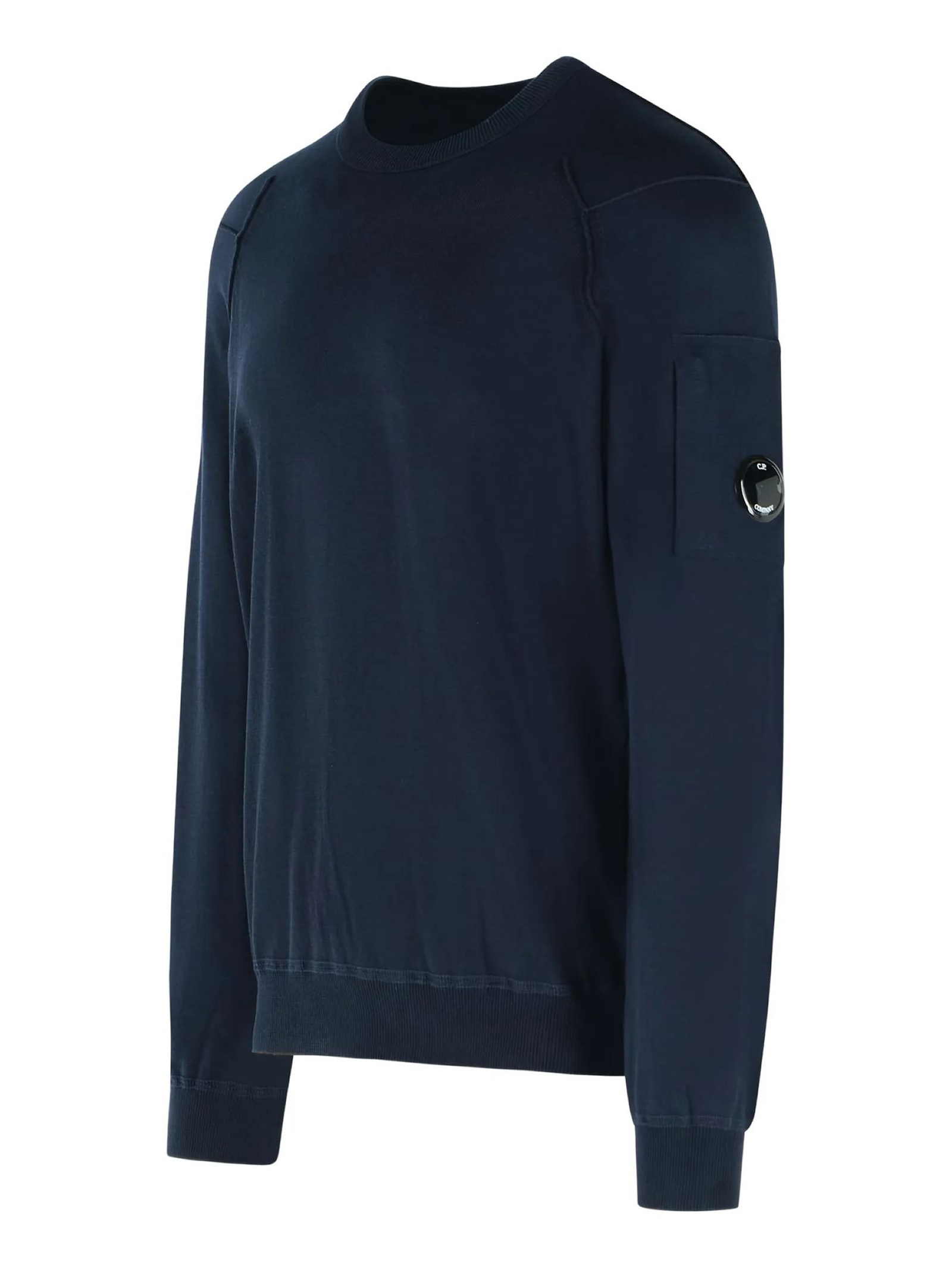 Maglione in cotone Sea Island Blu, Girocollo a costine, Taschino con Lente, Cuciture a contrasto, Polsini e orlo a costine, Finezza 14, Regular Fit