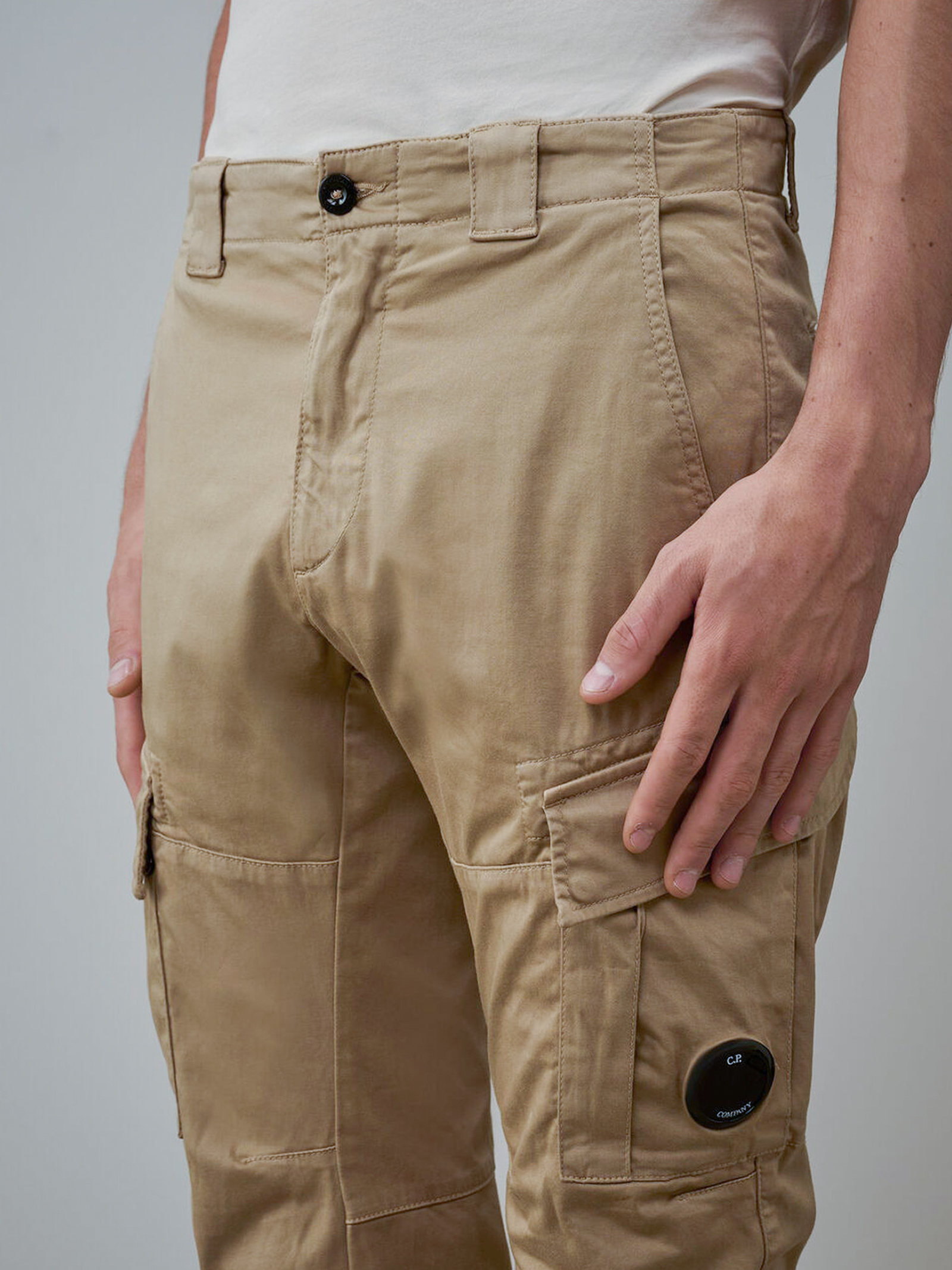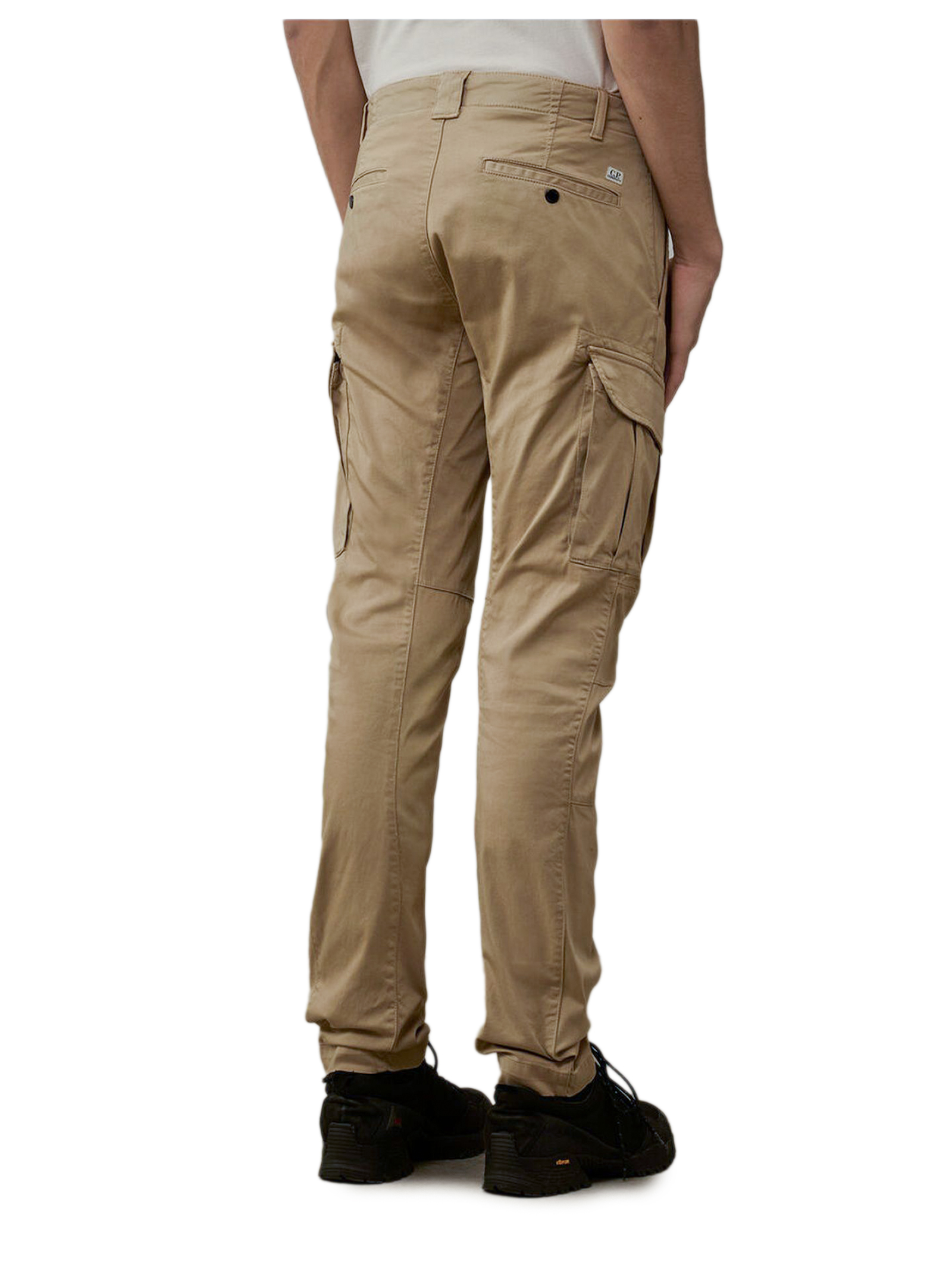 Pantaloni cargo in raso di cotone stretch, Chiusura con bottoni e zip, Passanti per cintura, Tasche laterali, Tasche cargo con patta e bottoni, automatici con Lente, Tasche posteriori aperte, Etichetta con logo applicata sul retro, Tinti in capo, Ergonomic fit