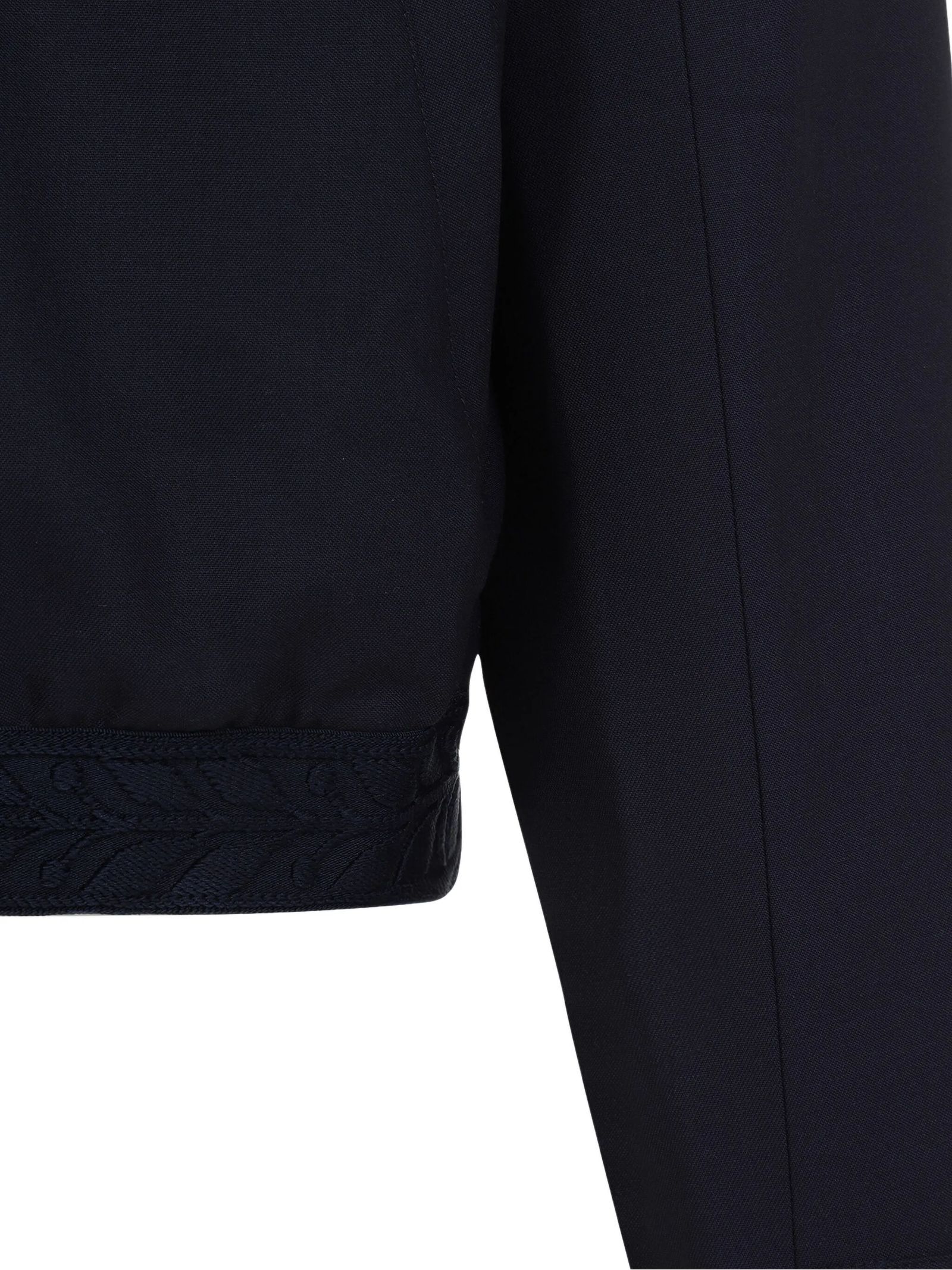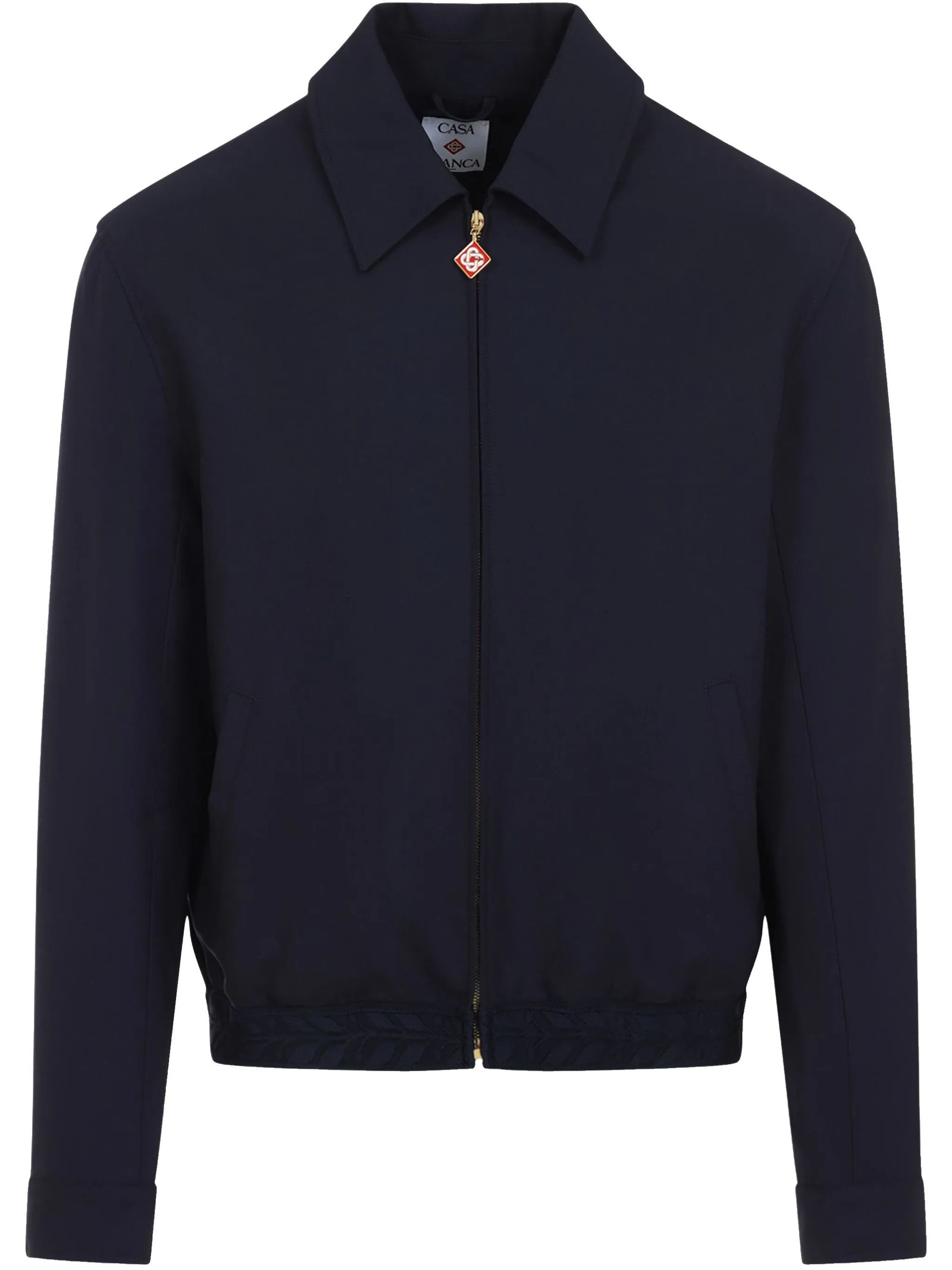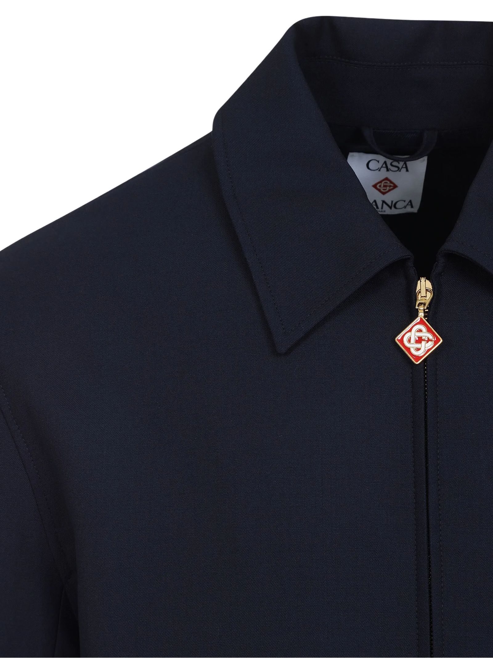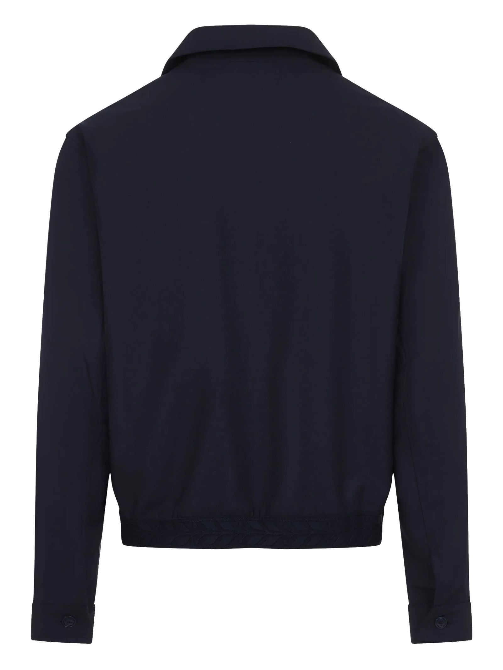 Giacca in lana blu navy, chiusura frontale con zip, due tasche a filetto laterali, colletto a punta, maniche lunghe