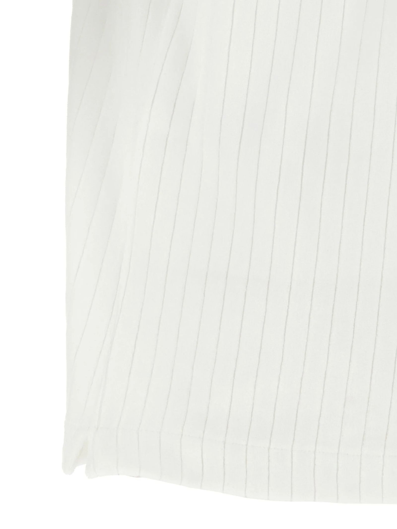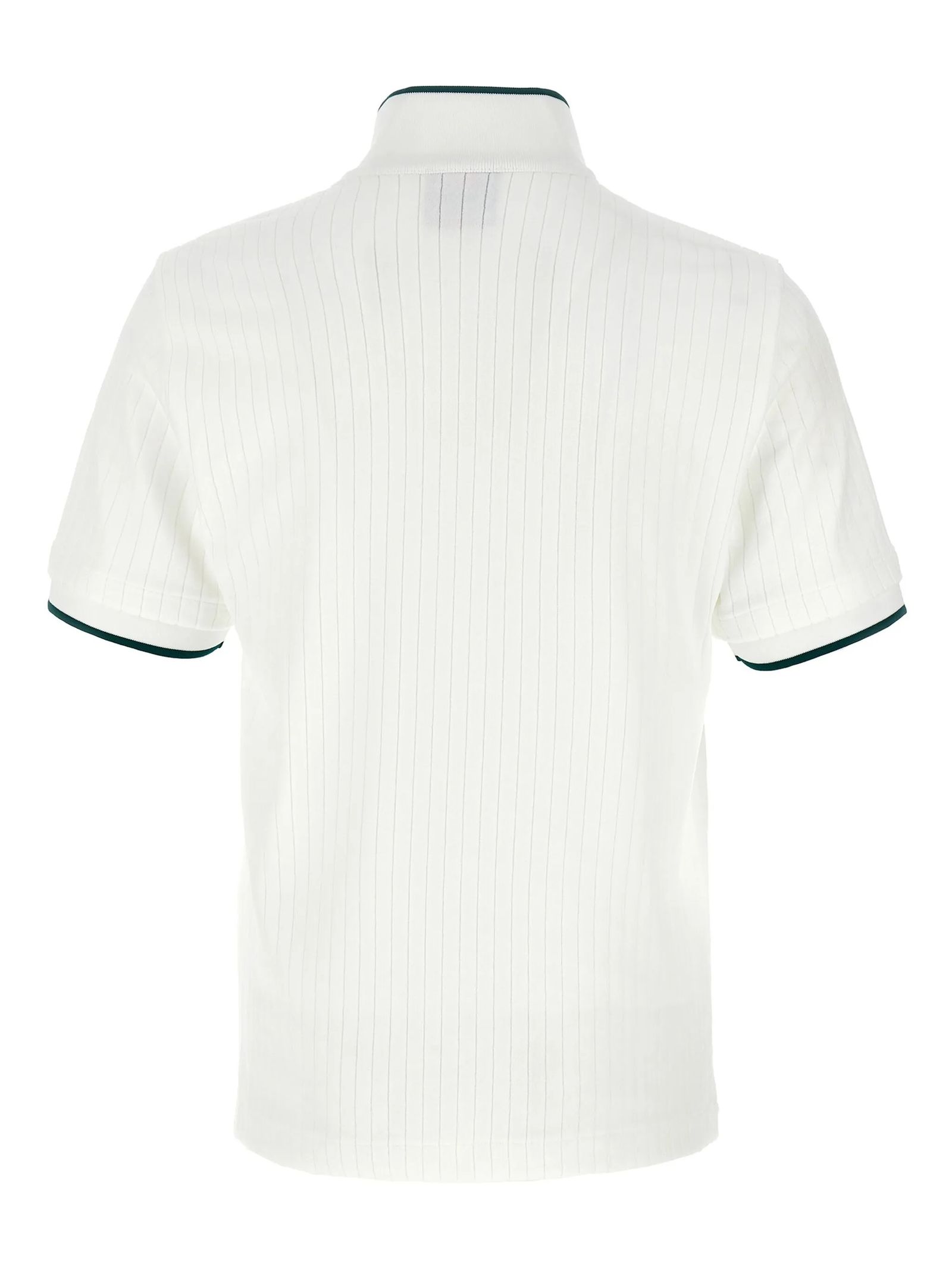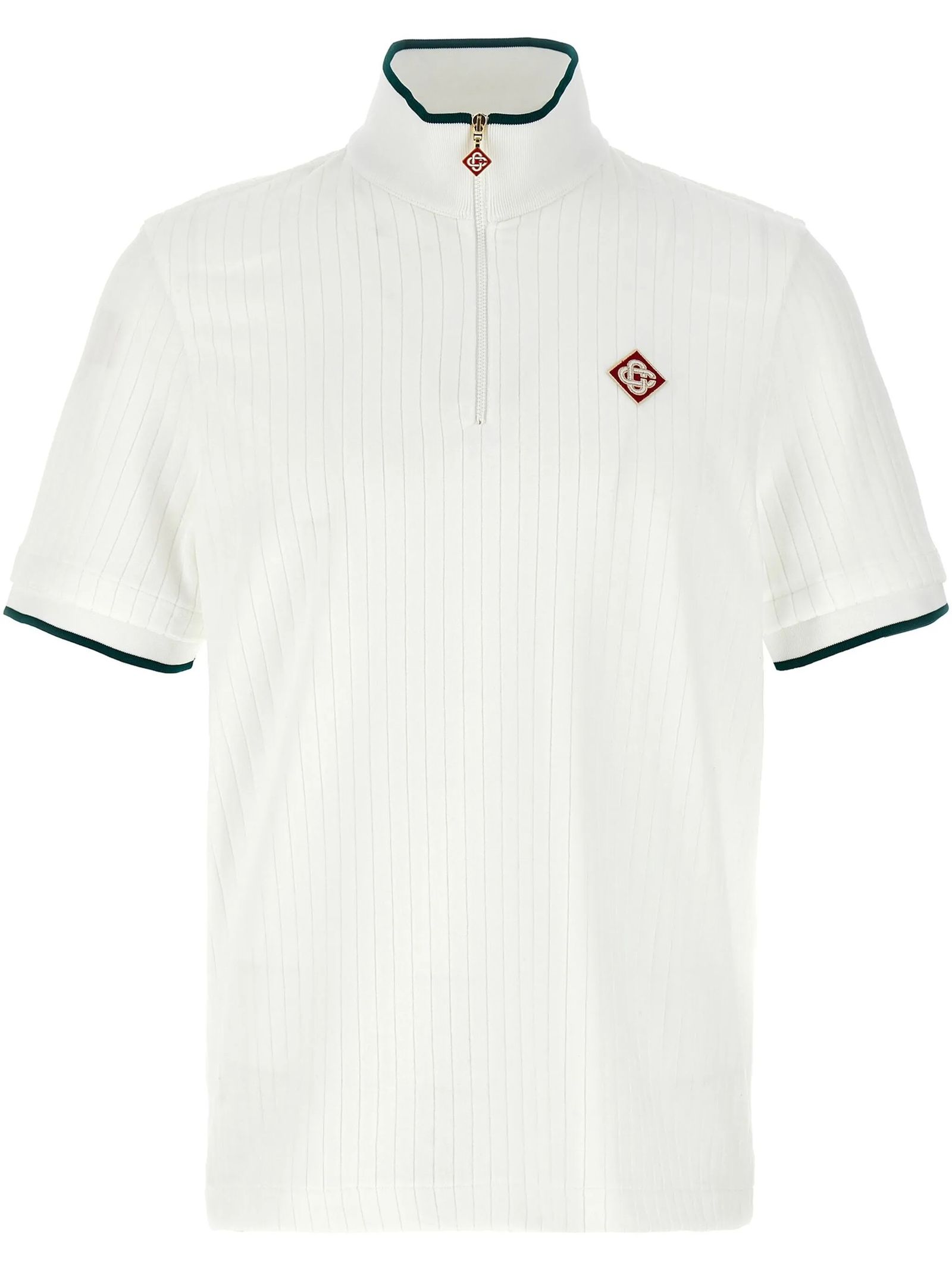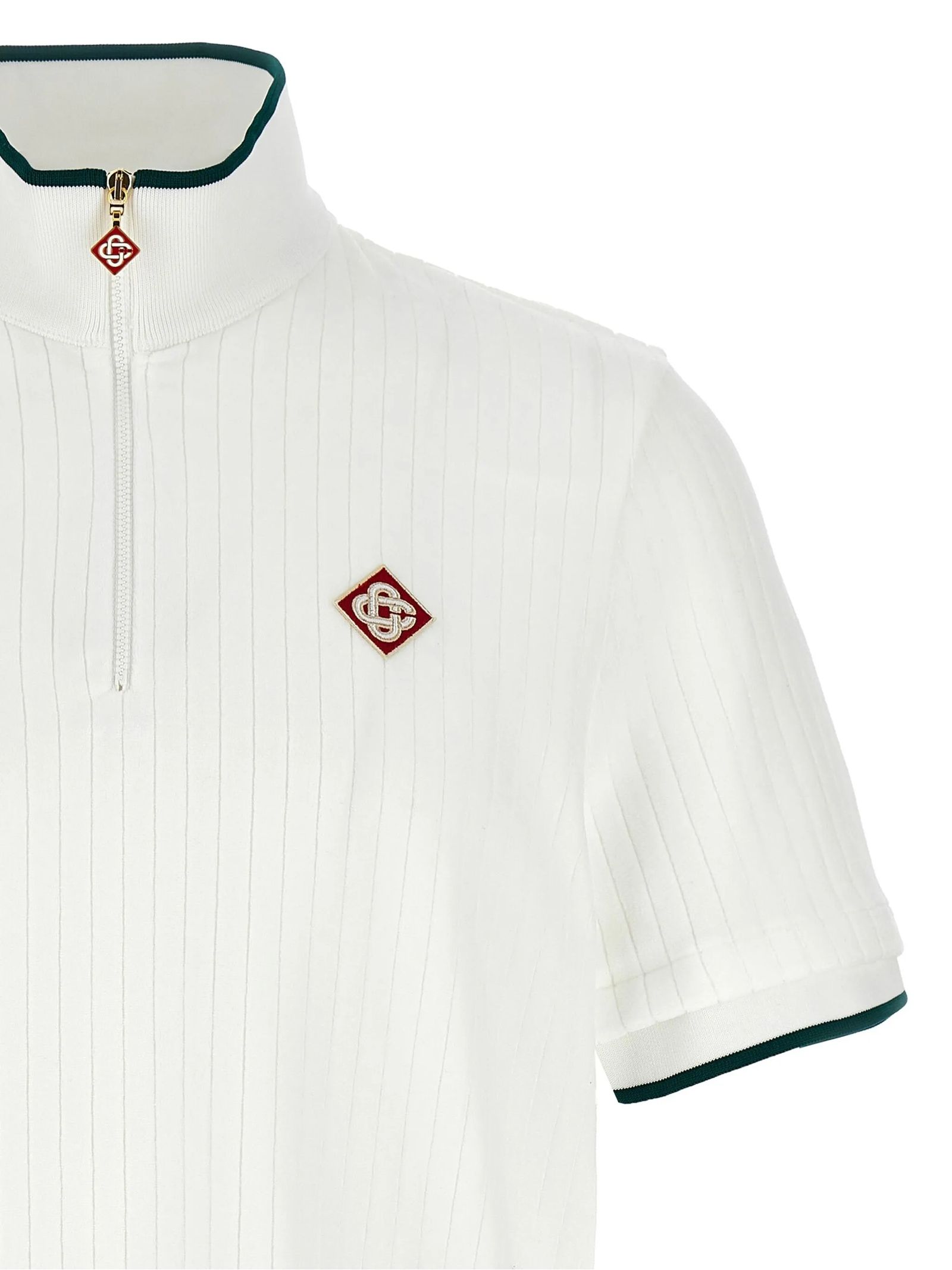 T-shirt a coste in velluto bianco, chiusura frontale con zip corta, collo a imbuto, rifinitura a coste, applicazione con logo sul petto