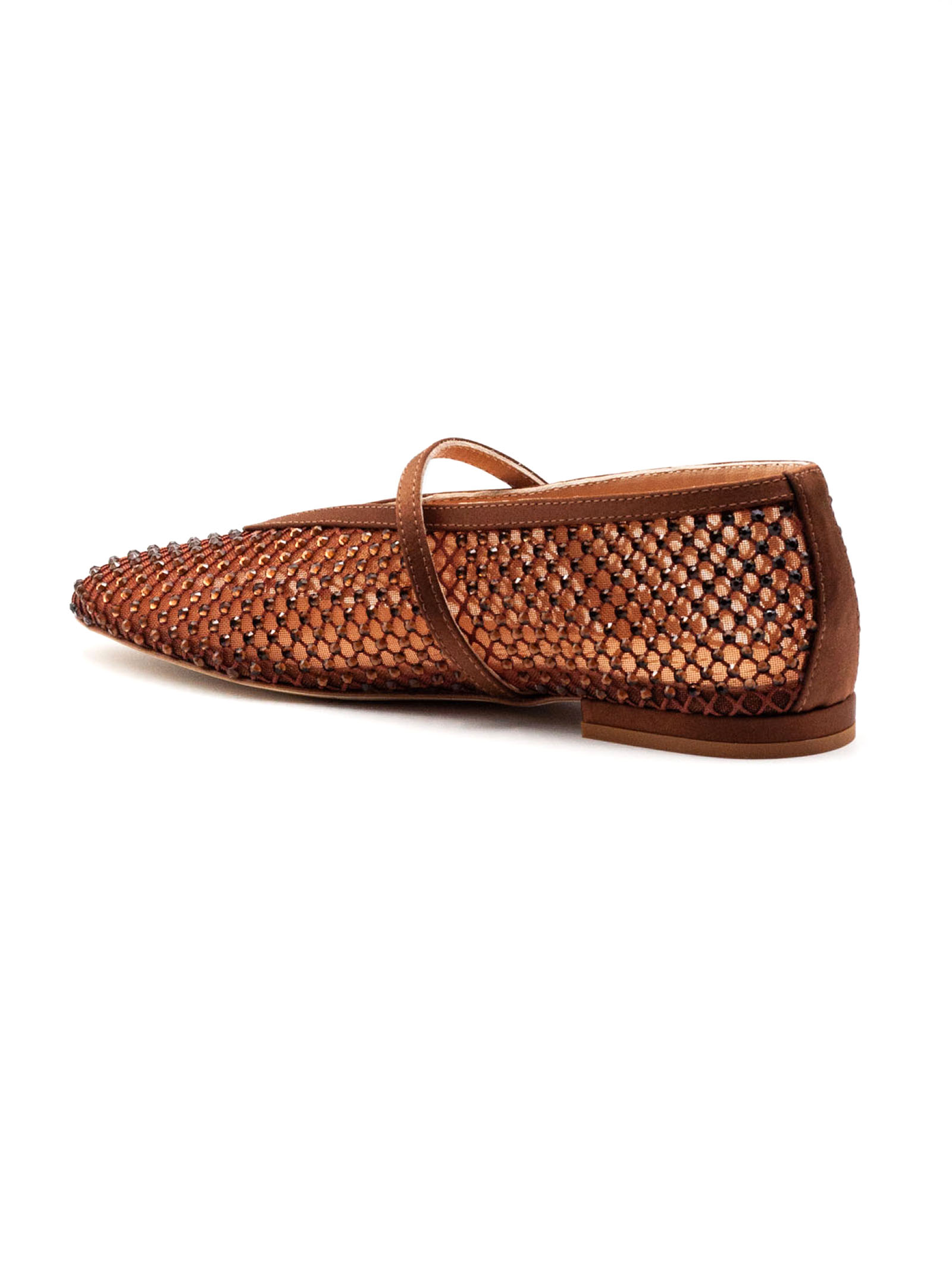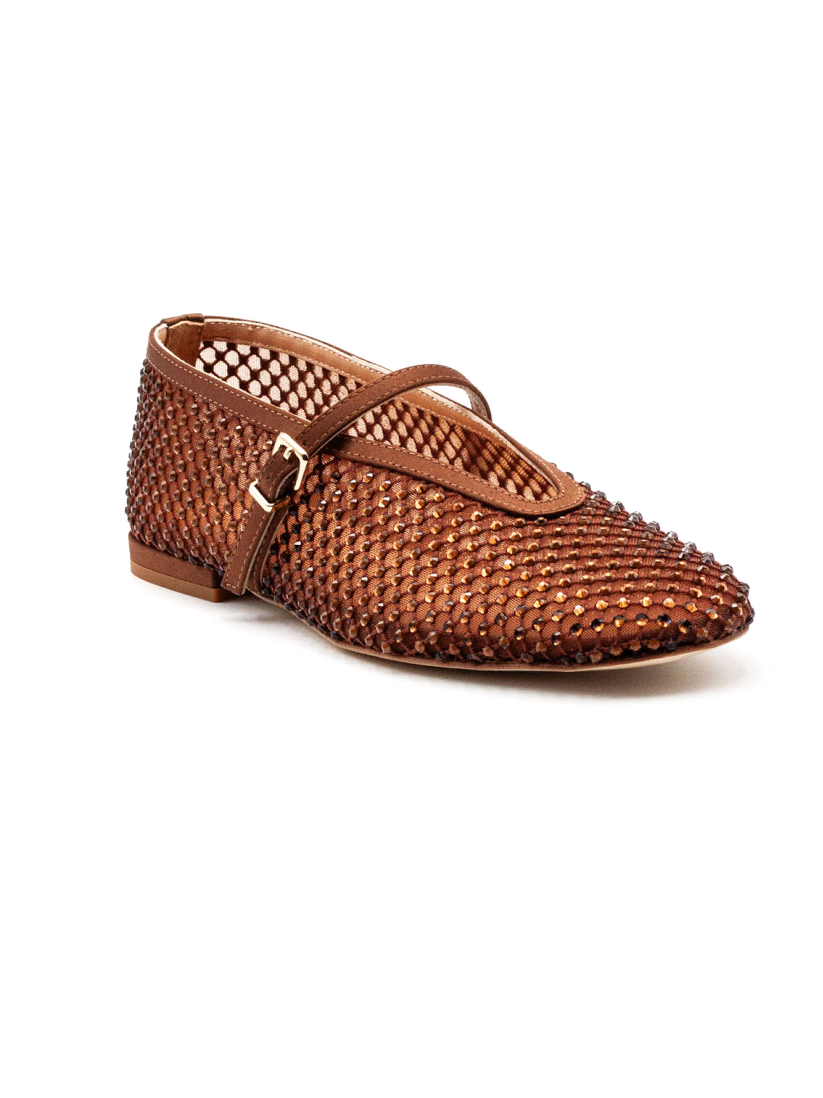 Ballerina marrone in rete traforata, applicazioni luminose effetto strass, cinturino sul collo del piede con fibbia, punta affusolata, tacco basso, suola in cuoio
