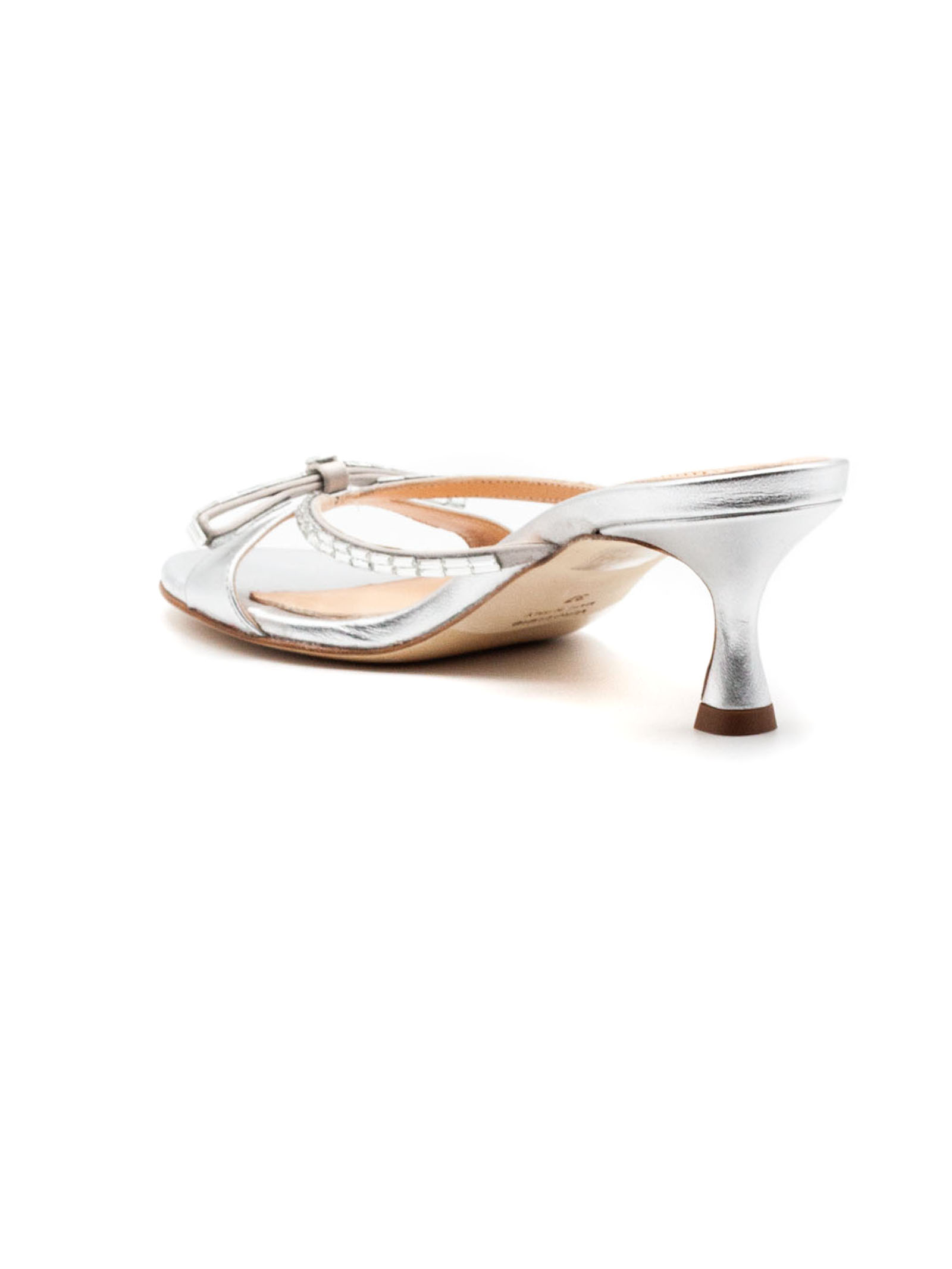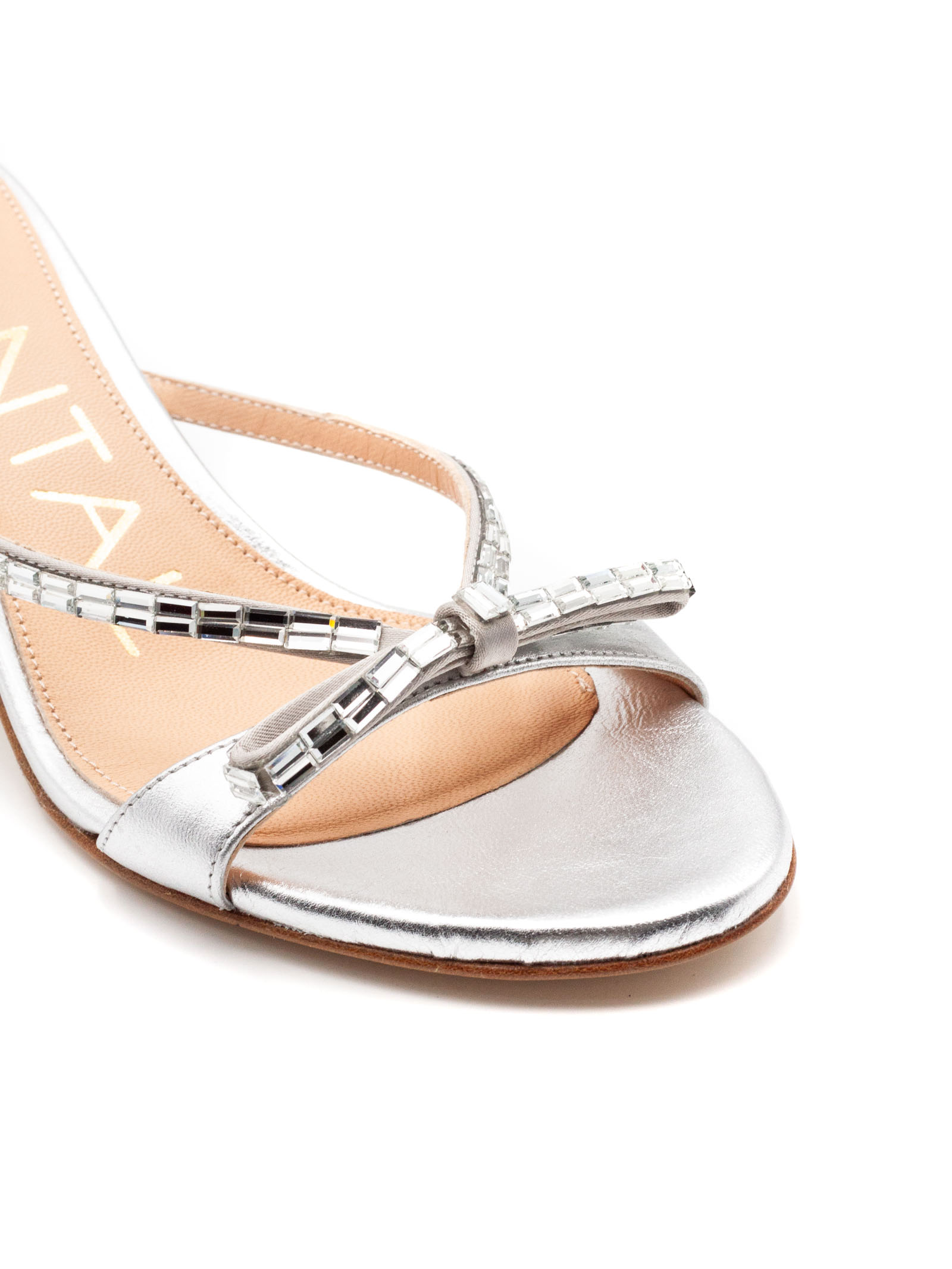Sandalo in pelle argento metallizzato, fasce sottili incrociate sul davanti, applicazioni decorative effetto gioiello, punta aperta, tacco medio sottile, soletta interna in cuoio con logo, altezza tacco 5 cm