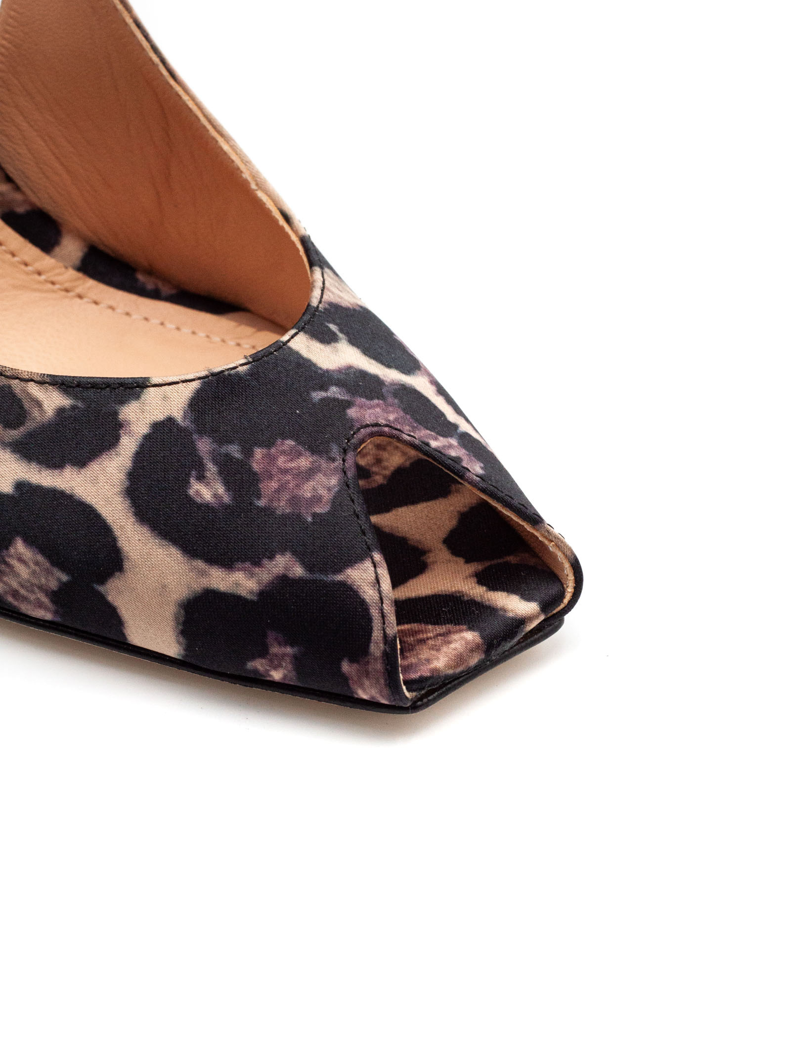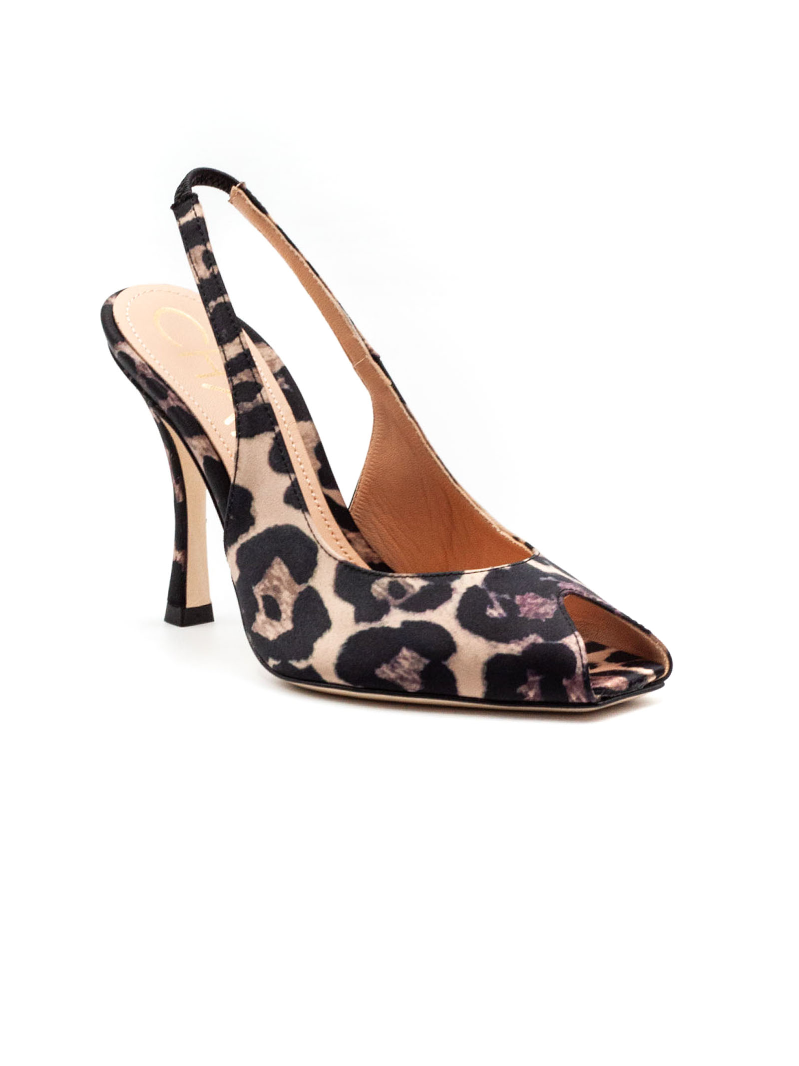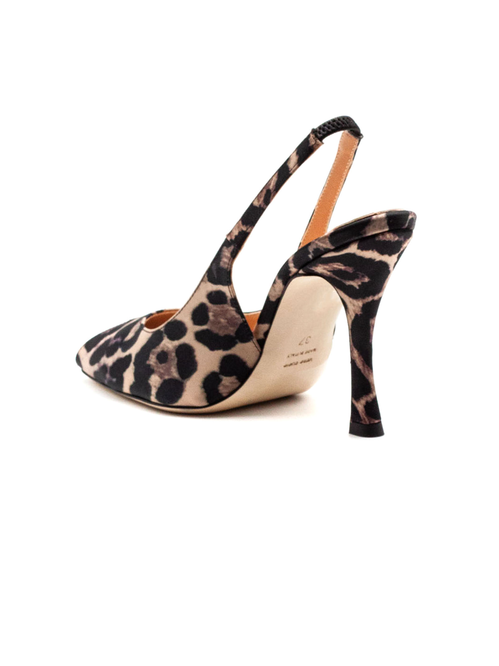Sandalo slingback in raso leopardato con punta aperta, suola in cuoio con logo dorato, altezza tacco 10 cm